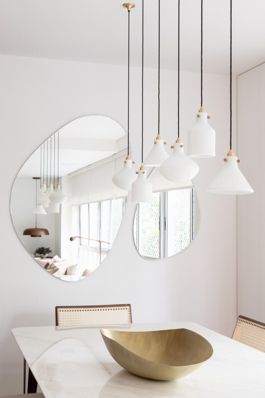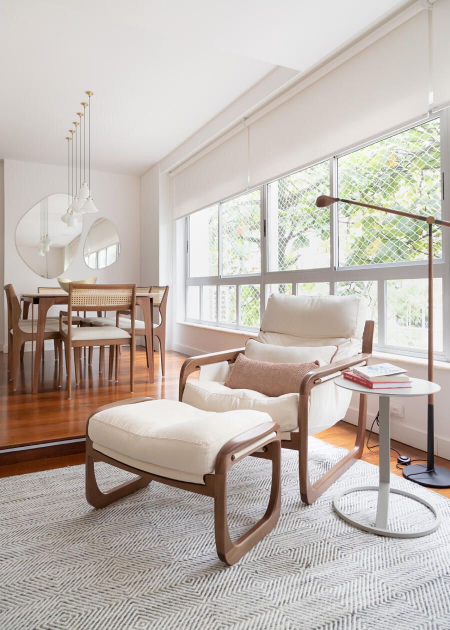 Já na decoração, de estilo contemporâneo, praticamente tudo é novo. Os destaques ficam por conta da mesa de jantar e das luminárias pendentes, do designer do Jader Almeida, e da poltrona com banqueta Pitu, assinada por Aristeu Pires.