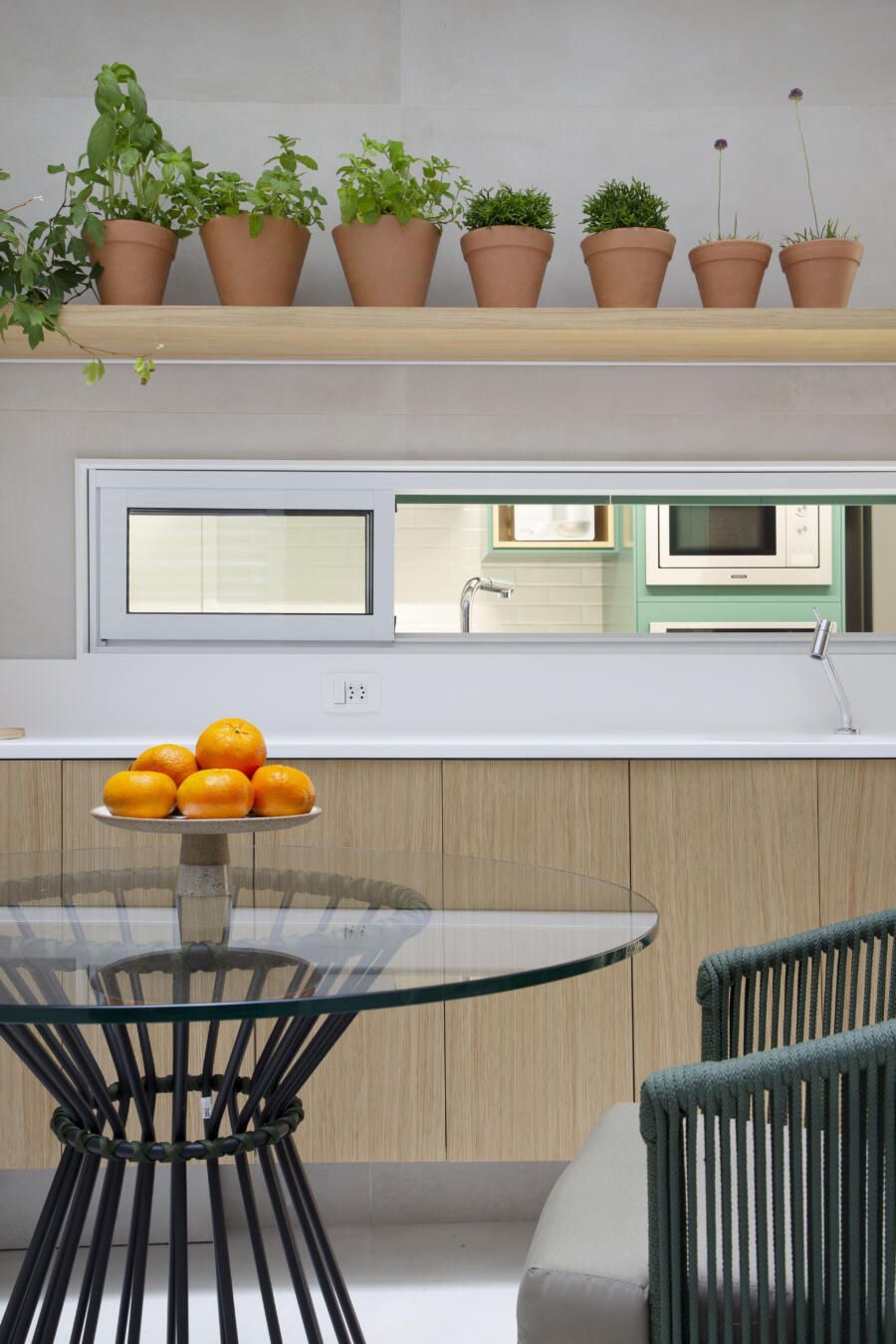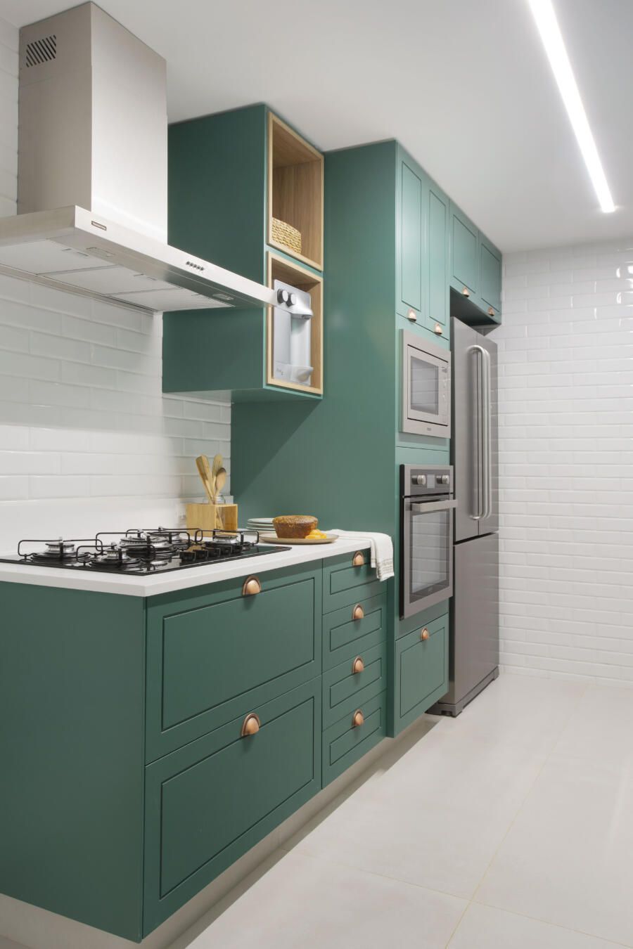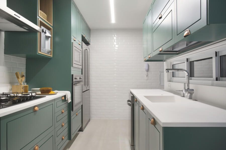 “O verde dos armários da cozinha foi paixão à primeira vista dos clientes, que saíram em busca de uma loja que reproduzisse o mesmo tom especificado no projeto. A ideia era trazer conforto associado à beleza e à leveza no uso dos materiais.”