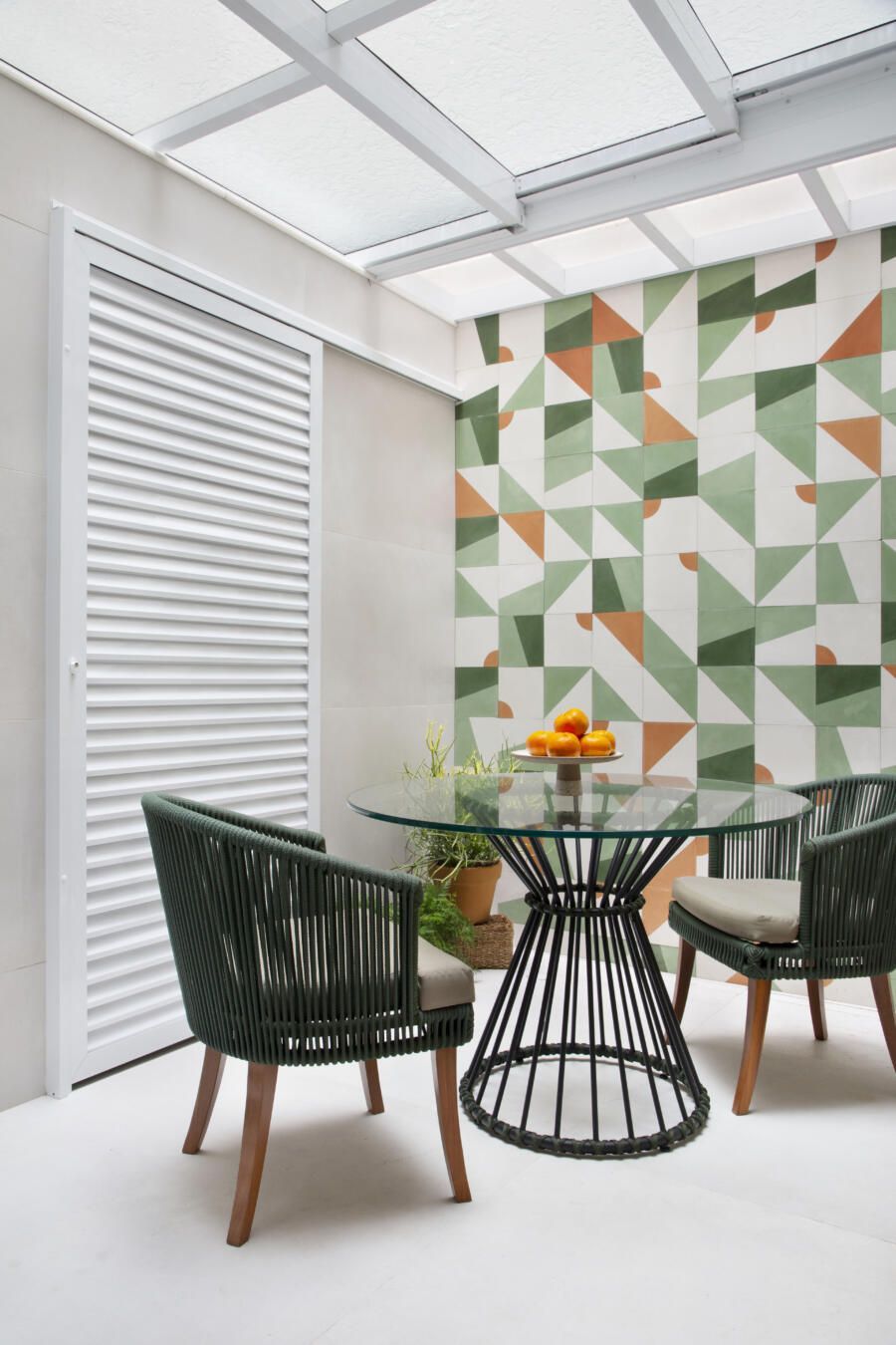 A cor verde está presente em diversos ambientes e detalhes do projeto, como os armários da cozinha, estampa do ladrilho hidráulico da parede externa e na mesa e cadeiras de corda náutica. Esta escolha ajudou não só a integrar visualmente os espaços, como também criou uma sensação de jardim de inverno moderno.