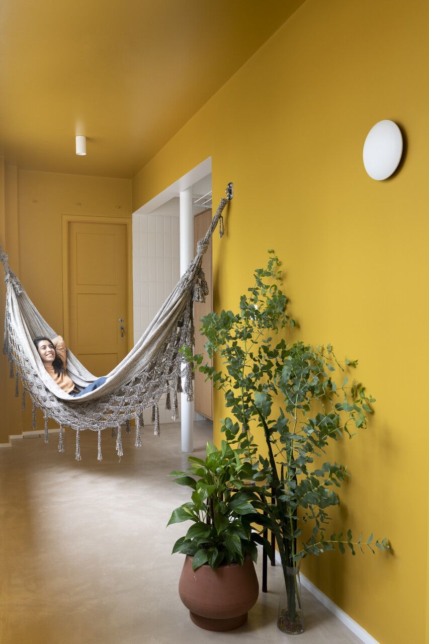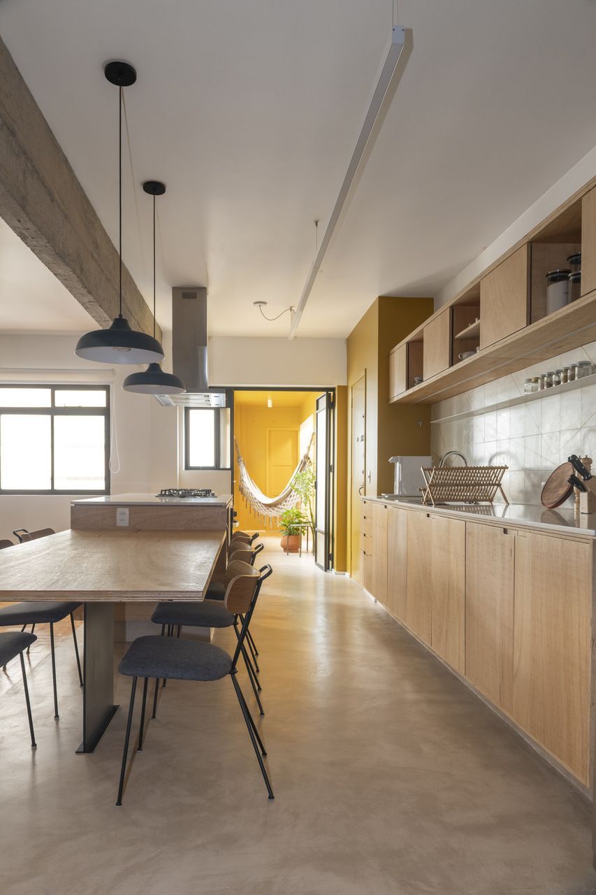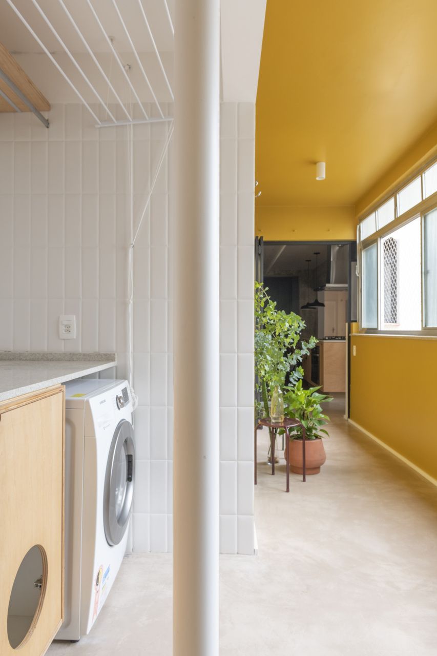 A proposta de reforma apostou na integração total entre sala, cozinha e hall, tendo como ponto central uma ampla ilha multifuncional, que assume o papel de mesa de jantar e bancada de apoio. A antiga lavanderia, onde ficava a maior janela do apartamento, foi incorporada ao espaço social e transformada em uma espécie de varanda interna. Esse ambiente recebeu cores vibrantes, maior conexão com a cozinha e uma atmosfera mais descontraída, perfeita para abrigar plantas, uma rede e bancos que convidam a conversas informais. Já a área técnica foi reorganizada em um nicho discreto, oculto do olhar, com fechamento em porta camarão adaptada para permitir a passagem dos gatos do casal.