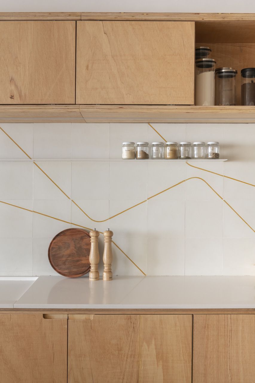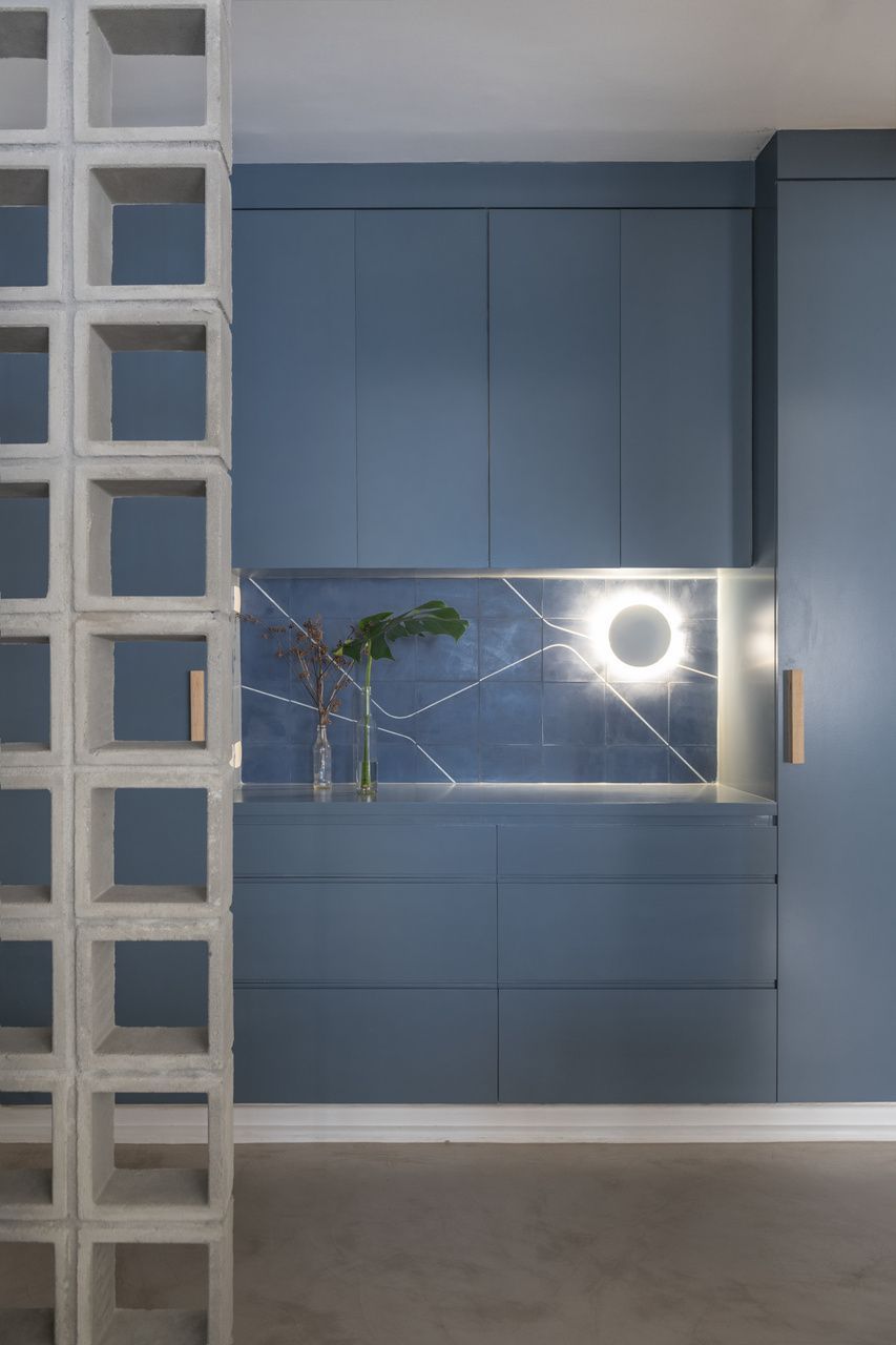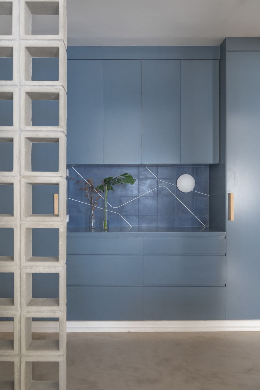 Na cozinha, o destaque fica para o frontão da pia, revestido com ladrilho hidráulico de desenho simples e expressivo, que contrasta com as linhas retas predominantes no restante do projeto. O painel esconde o quadro de luz através de uma porta camuflada e ainda acomoda uma prateleira metálica embutida, funcional e leve, sem quebrar a harmonia visual.
