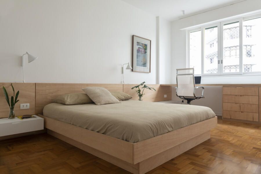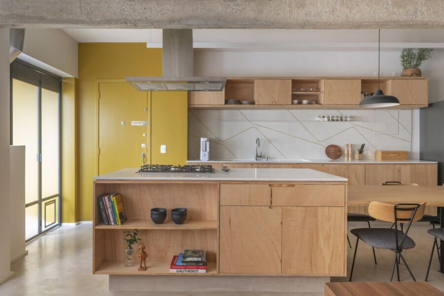 A marcenaria foi outro elemento protagonista: todo o mobiliário foi executado em compensado de Sumaúma, dispensando revestimentos adicionais e revelando o tom caramelado natural da madeira, que se tornou o acabamento final e trouxe identidade única ao apartamento.