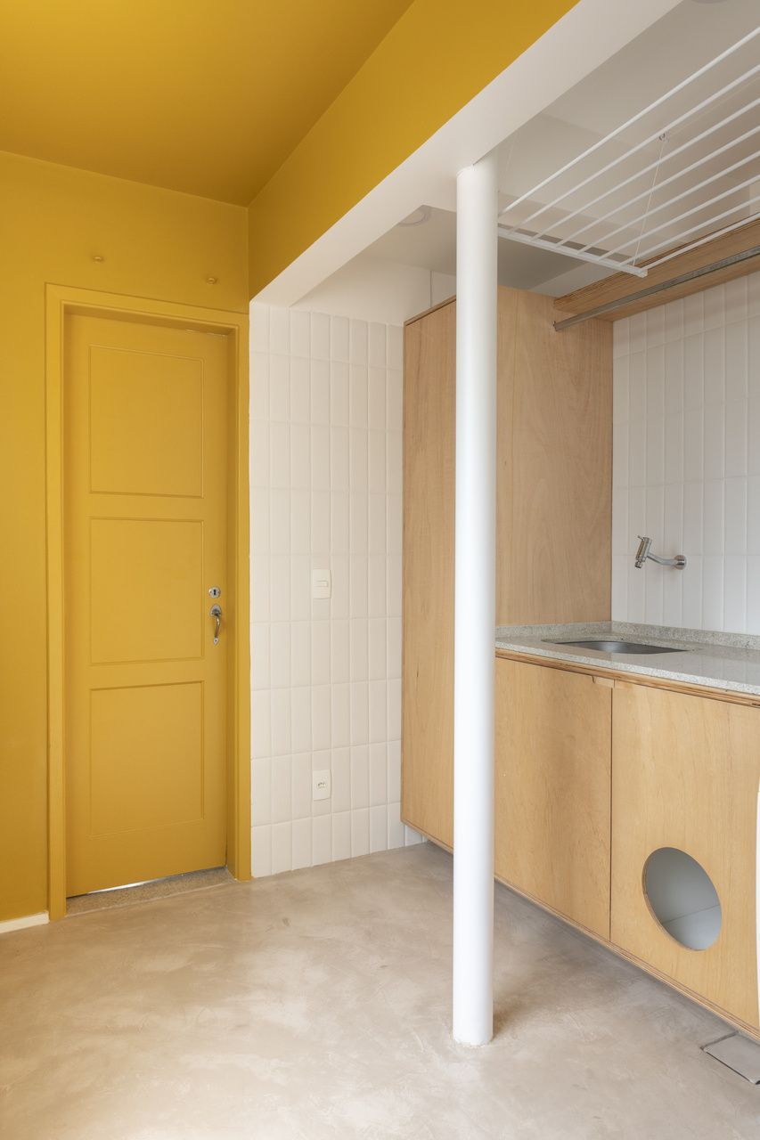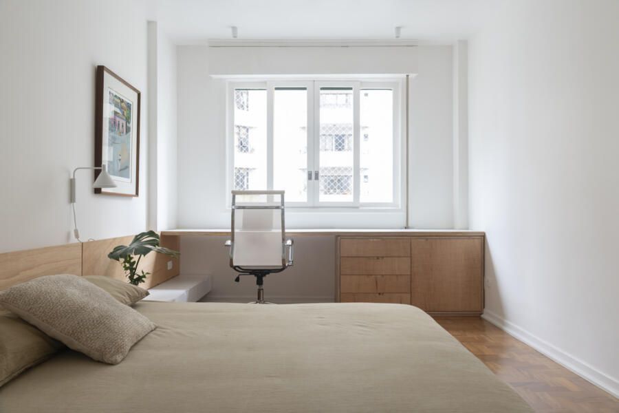 No quarto e no hall, os armários originais foram preservados, mas ganharam um ar renovado com a aplicação de novas cores e puxadores sob medida, reforçando a ideia de reaproveitamento inteligente e de respeito à história do imóvel. Já as vigas e pilares, revelados ao longo da obra, foram assumidos em concreto aparente, transformando-se em elementos arquitetônicos de destaque. Esse gesto não apenas valoriza a estética brutalista, como também evidencia as mudanças no layout e a força estrutural que sustenta o apartamento.