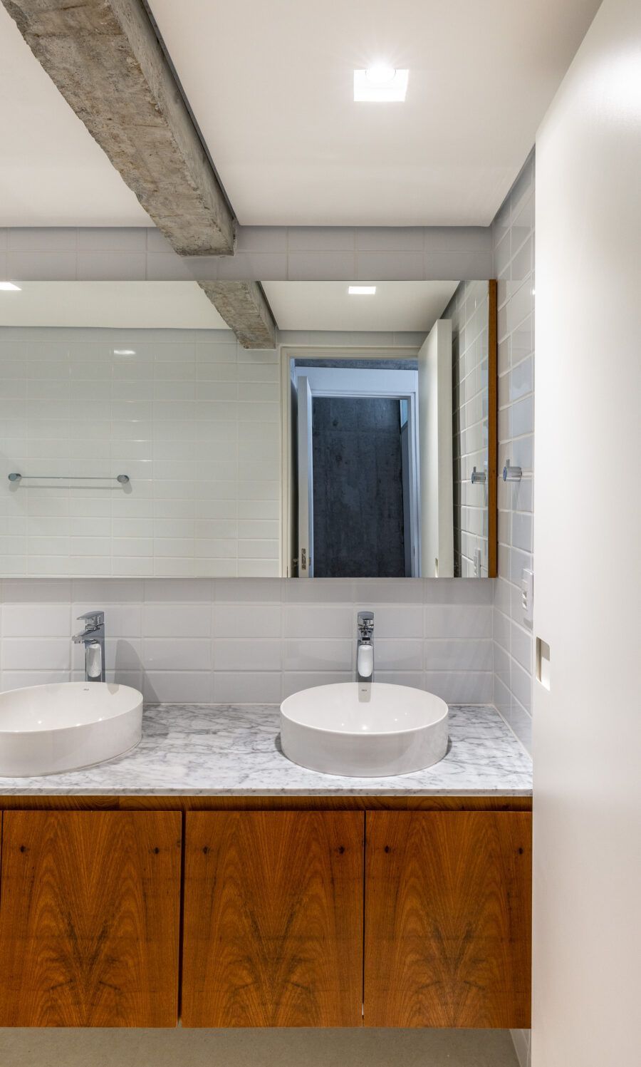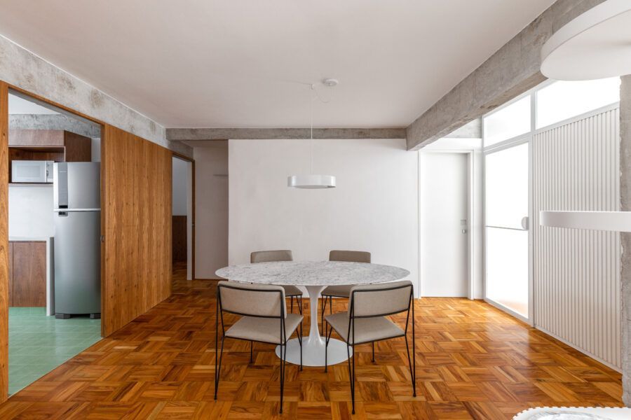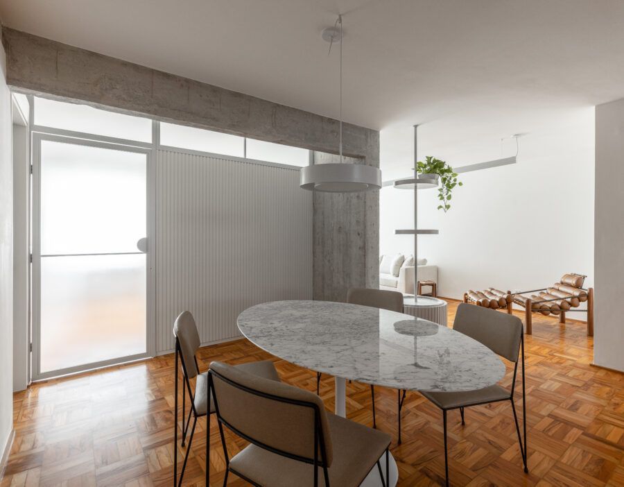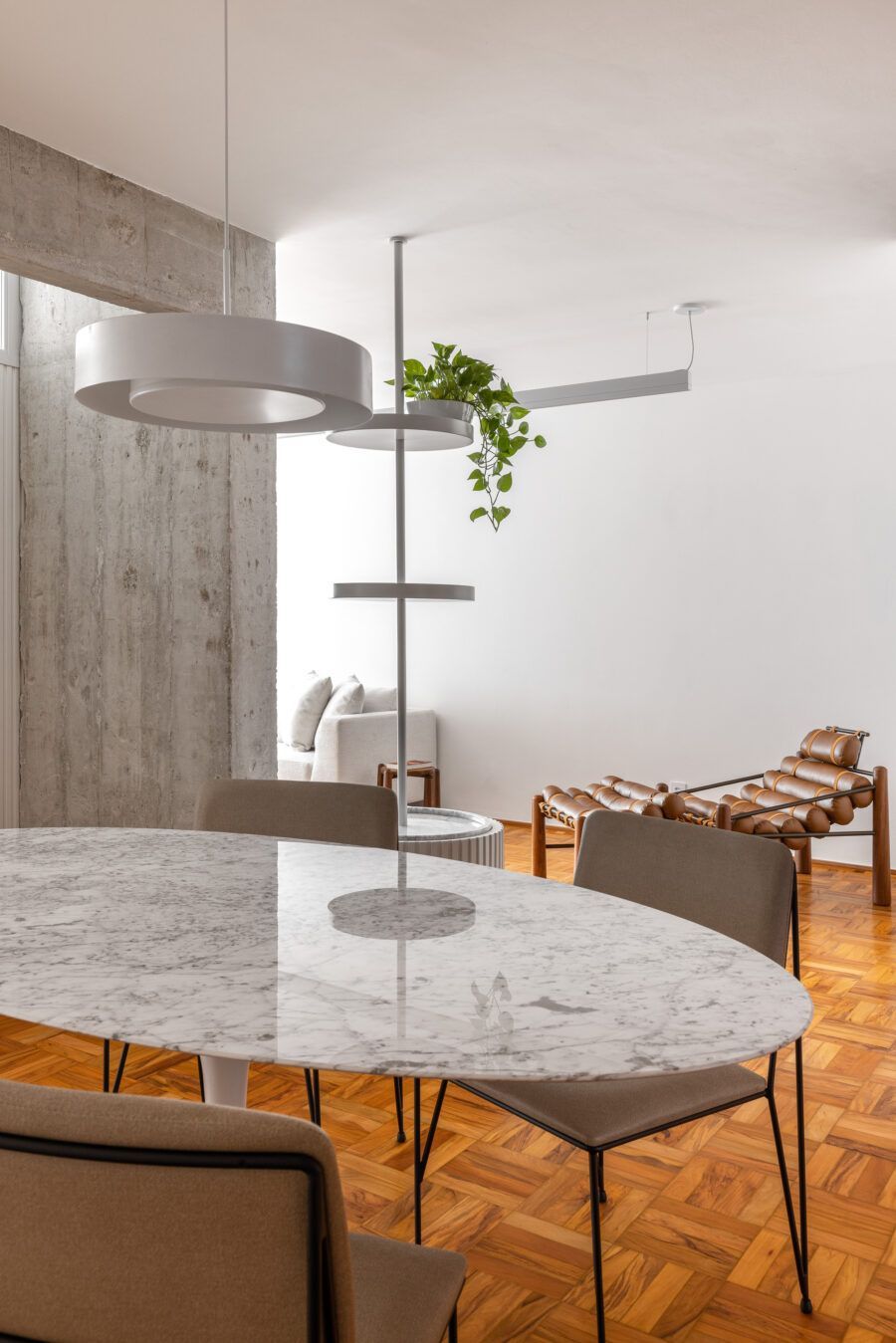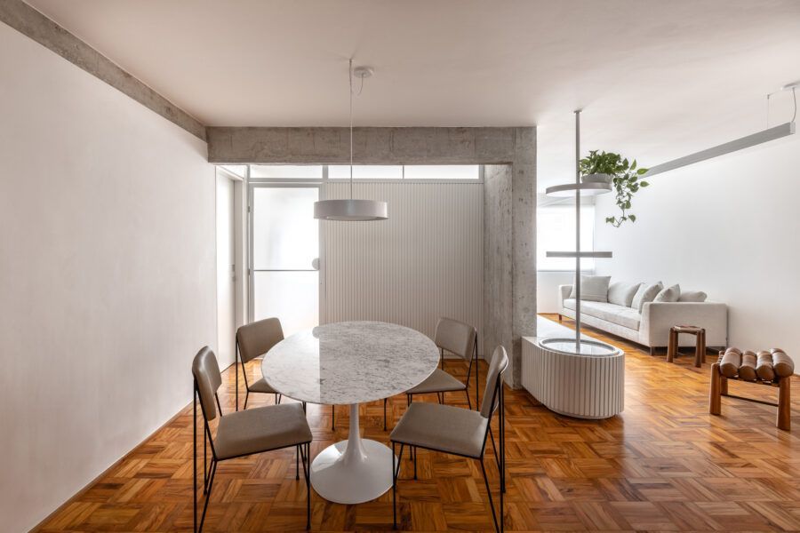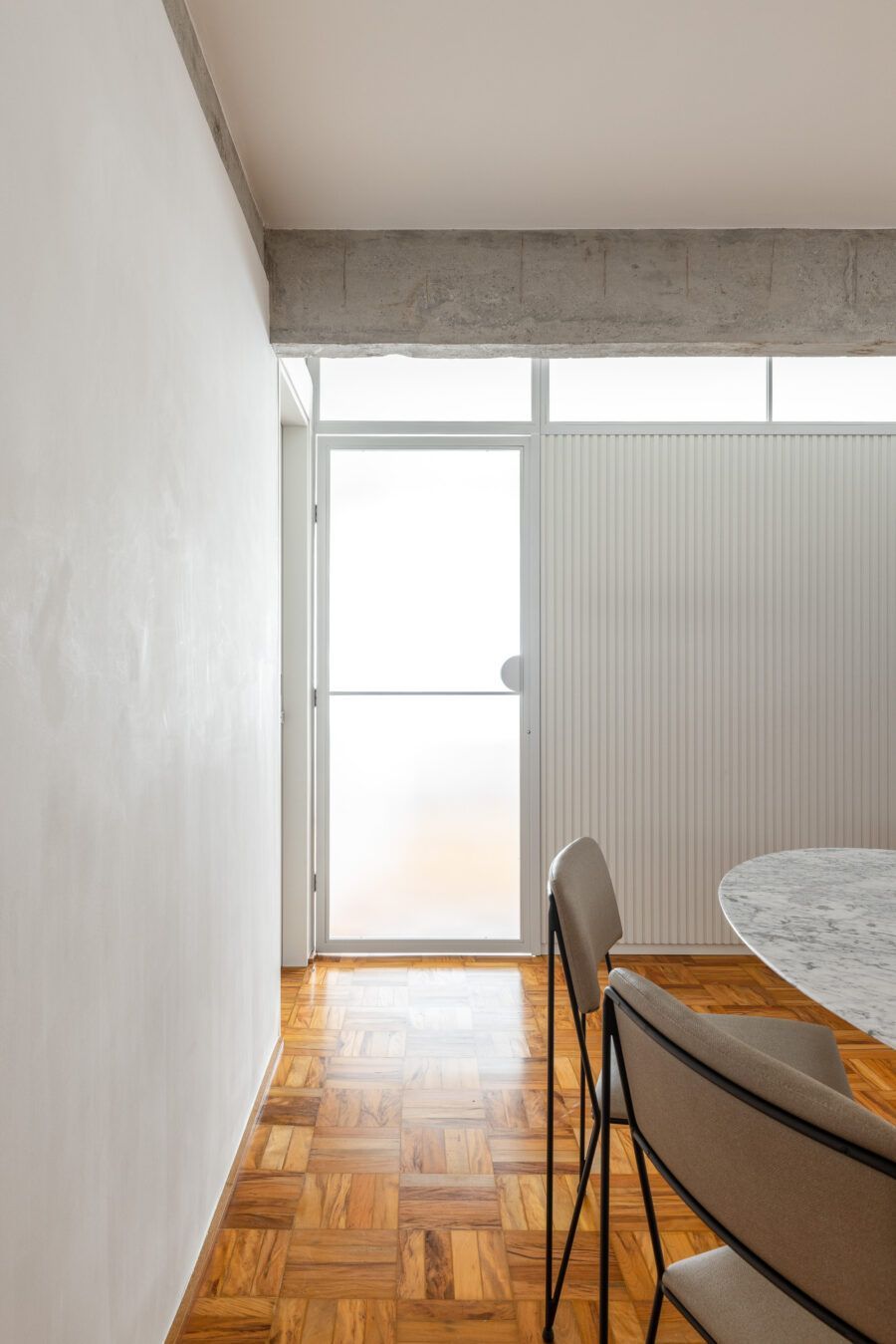 “O maior desafio desse projeto foi criar soluções para que a iluminação natural chegasse a ambientes que, pelo layout original, ficavam muito escuros. Tivemos a liberdade de alterar boa parte do layout original, reduzindo algumas circulações e permitindo que essa luz alcançasse áreas como sala de jantar e terceiro quarto. Ao repaginarmos o layout completo do apartamento, reorganizamos os fluxos e acessos concentrando a circulação para quartos e novo banheiro pela parte social e trazendo elementos que permitissem iluminação em ambientes que antes não tinham contato com a luz natural proveniente das janelas das fachadas.”