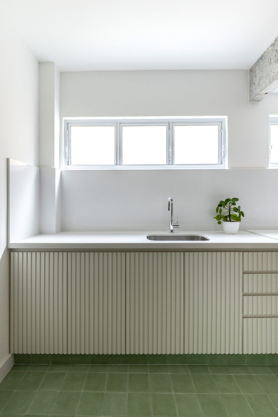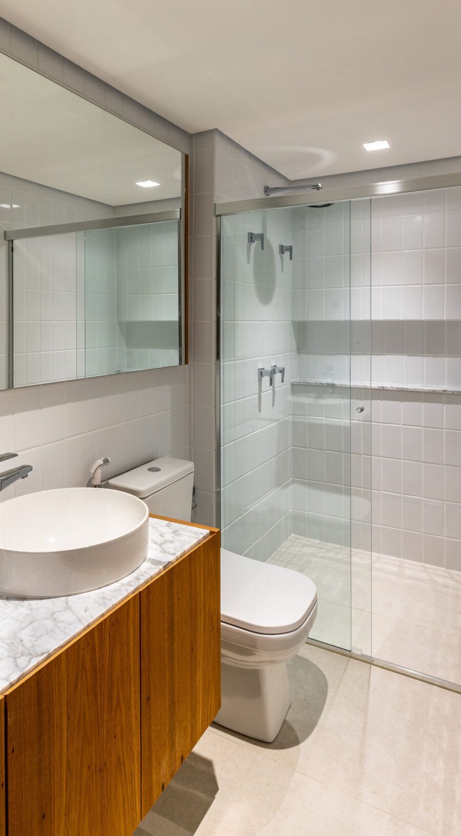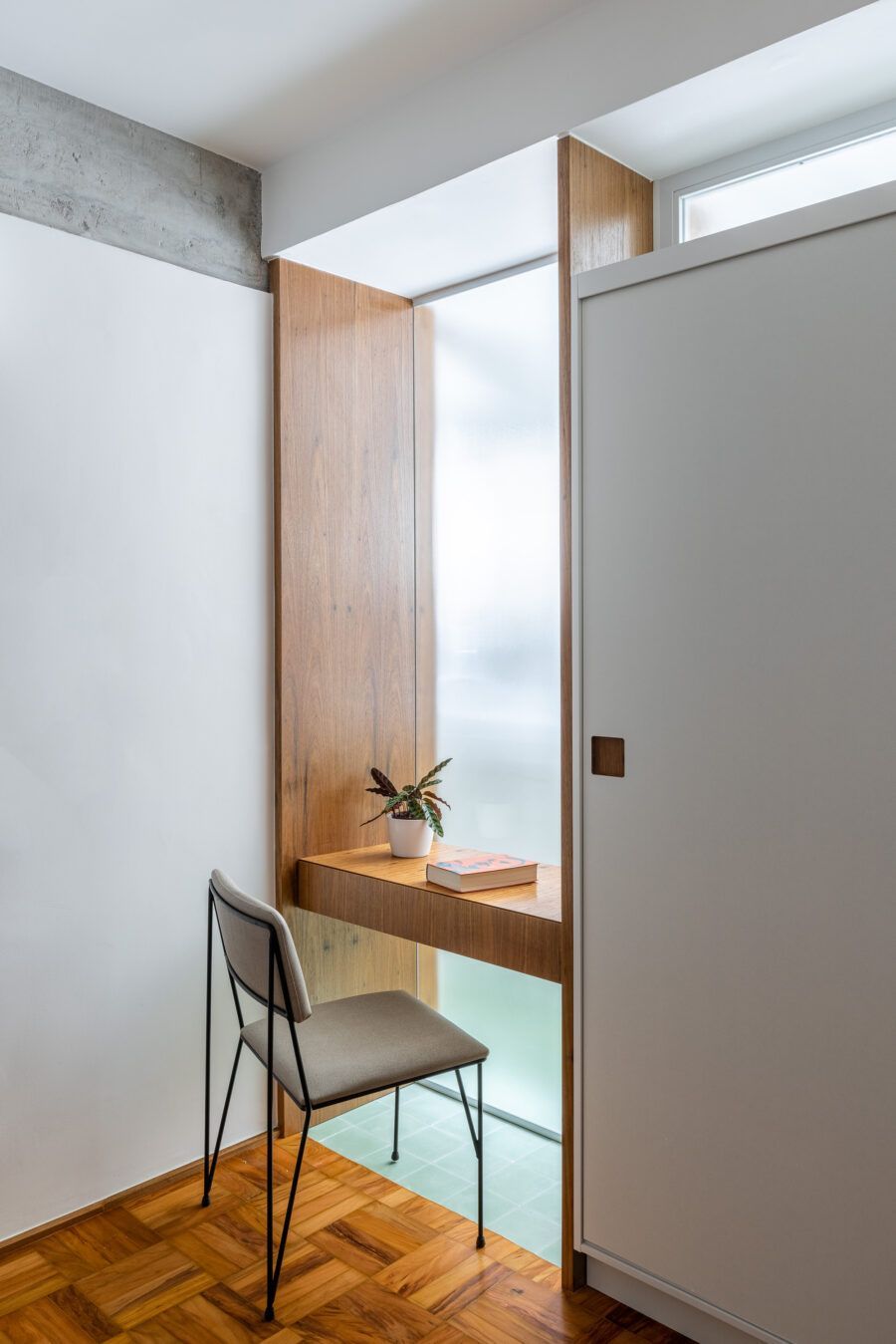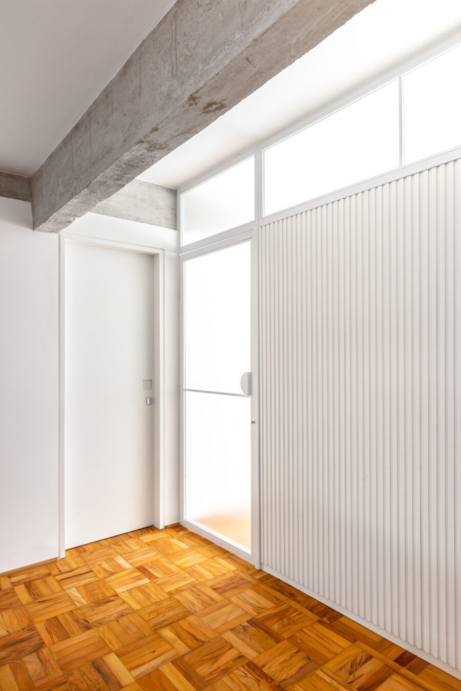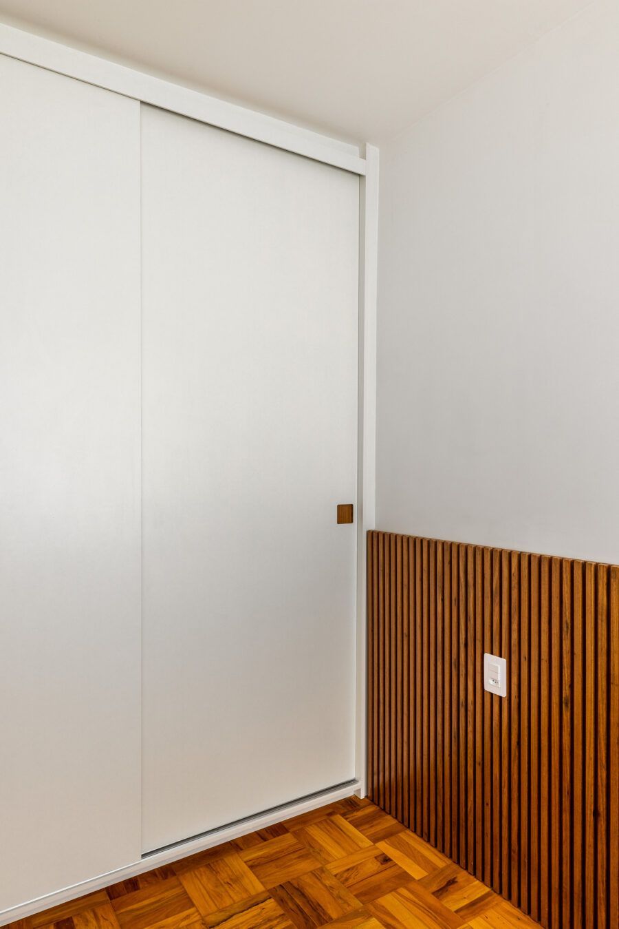 “Uma dica muito legal desse projeto é a forma que usamos o vidro texturizado para permitir que a luz percorresse pelos demais ambientes do apartamento sem que a privacidade dos espaços fosse comprometida. Existem diversos padrões desses vidros, como martelado, pontilhado, canelado e, como o caso desse projeto, o mini boreal, que permite que a luz passe normalmente, mas preserva a permeabilidade visual, “borrando” a imagem que está atrás e apenas quando muito próxima.”