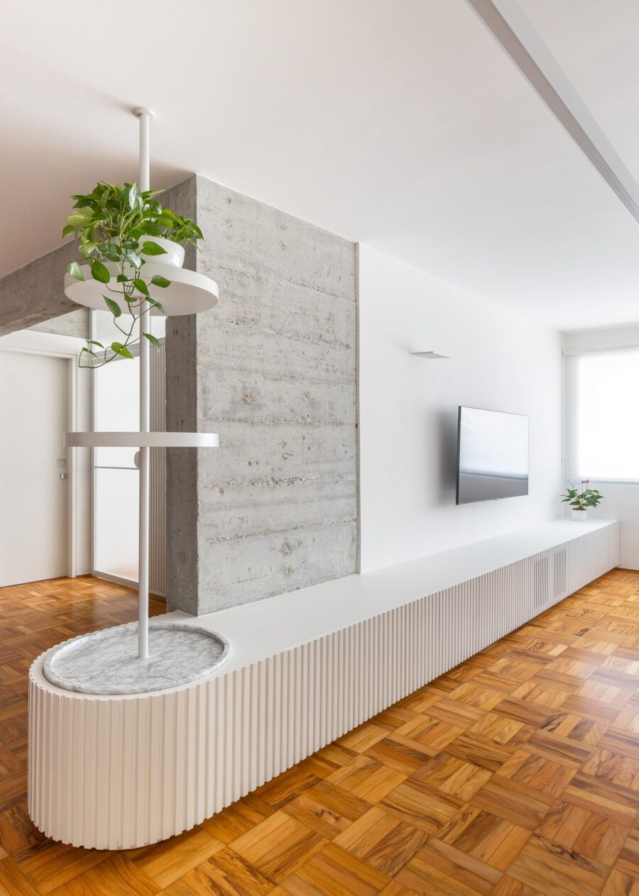 Peças como a luminária da sala de estar e elementos contínuos foram propositalmente planejados a fim de reforçar a geometria dos ambientes, trazendo sensação de amplitude aos espaços. Essa solução também é aplicada ao rack da sala, onde as ripas resgatam ritmo e repetição, causando efeito similar às linhas contínuas.