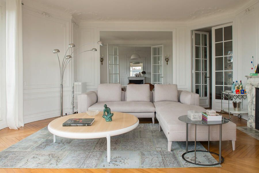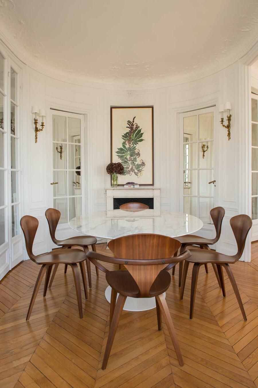 O Marcelo Salum recebeu o convite de uma amiga brasileira para assinar o projeto e em poucos dias estava na cidade para dar andamento ao trabalho. O arquiteto manteve as estruturas originais da planta, o piso em escama de peixe, as lareiras em mármore carrara e a boiserie dos ambientes.