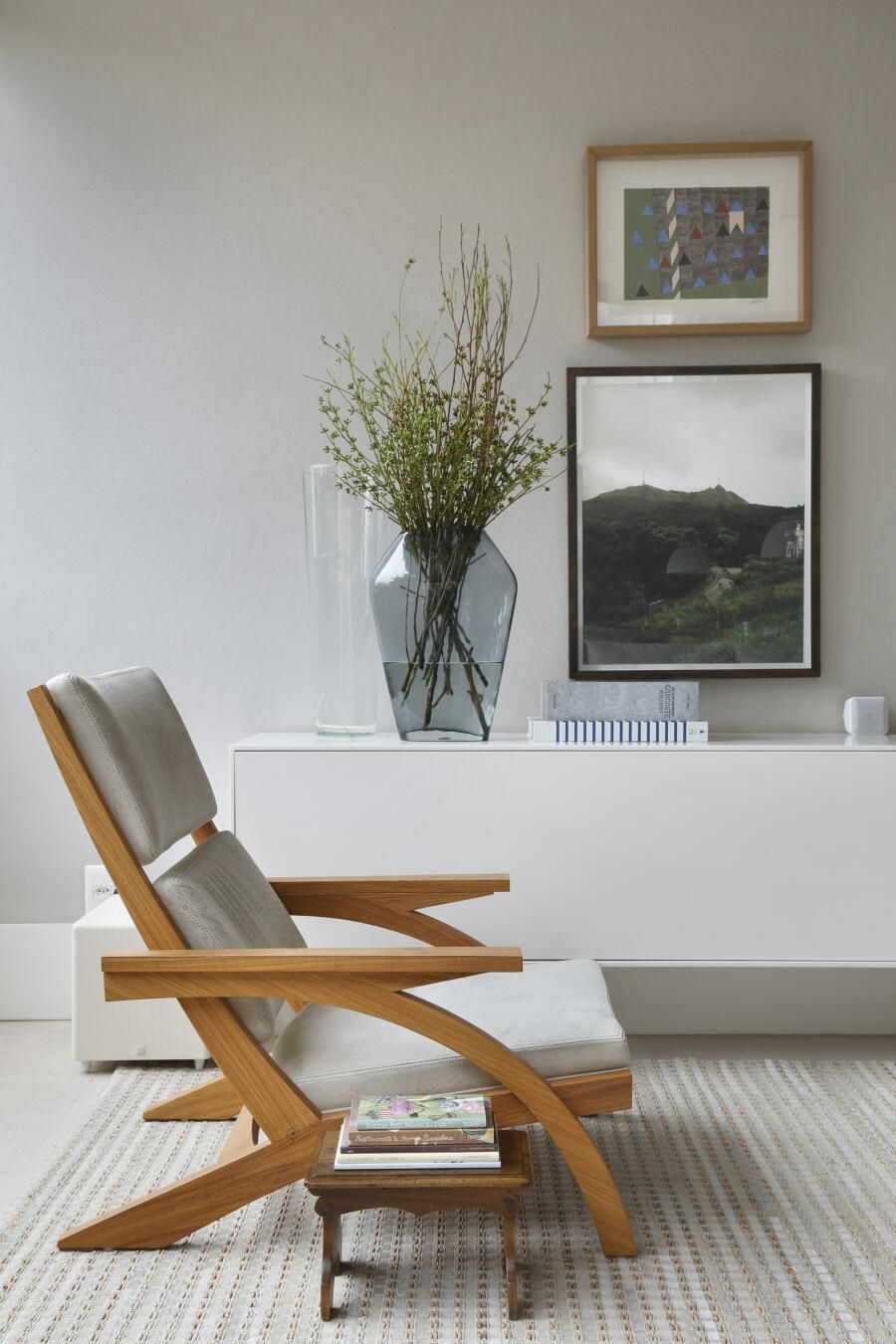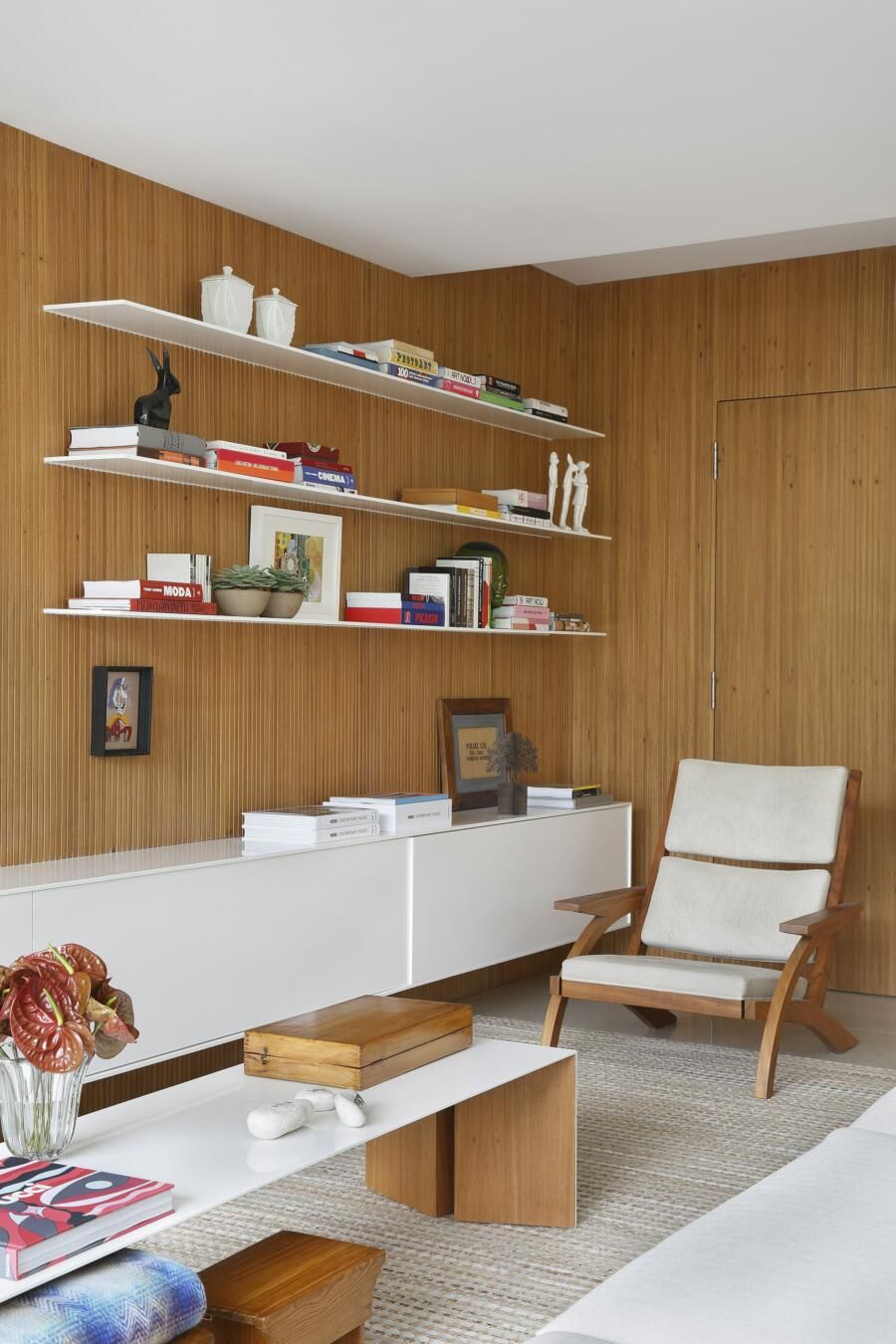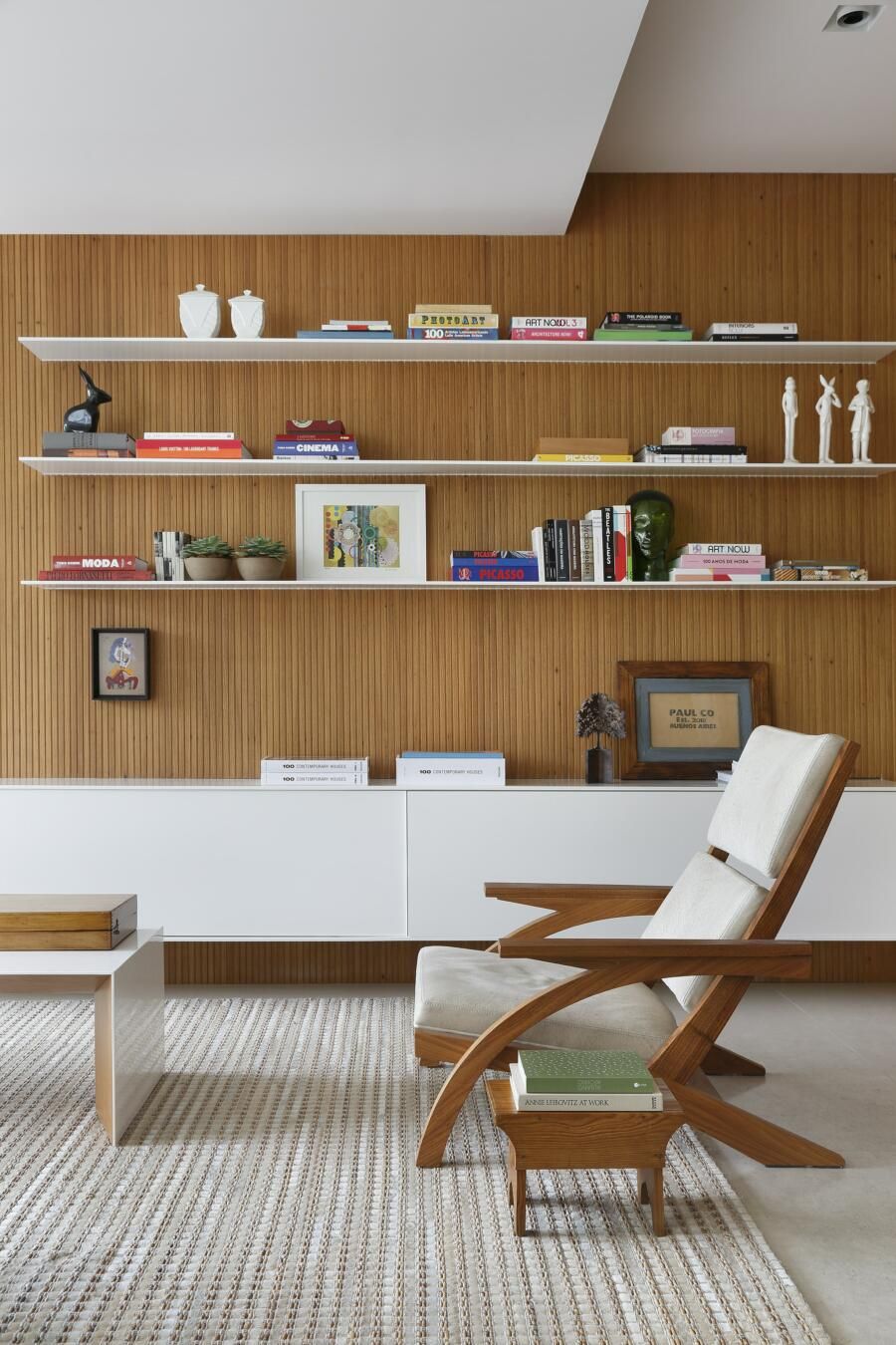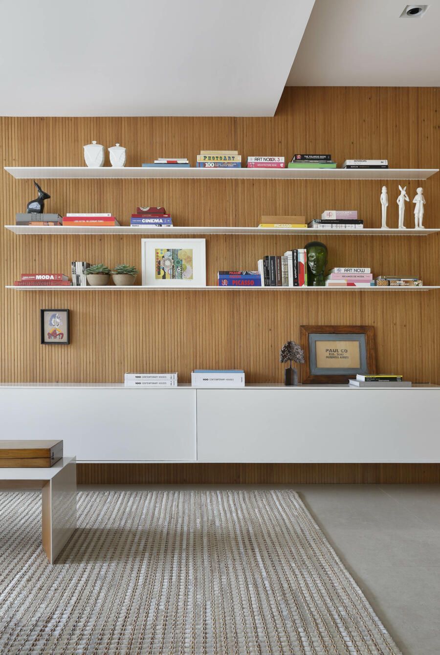 “Foi aplicada uma paleta de cores neutra em todo o apartamento. Abusamos do branco, bege, cinza e também da forte presença da madeira. Todos os detalhes colaboram para conferir um clima leve e aconchegante: o painel ripado em madeira freijó natural, a mistura dos materiais e as cores escolhidas. Trata-se de uma arquitetura atemporal com ambientes clean.”