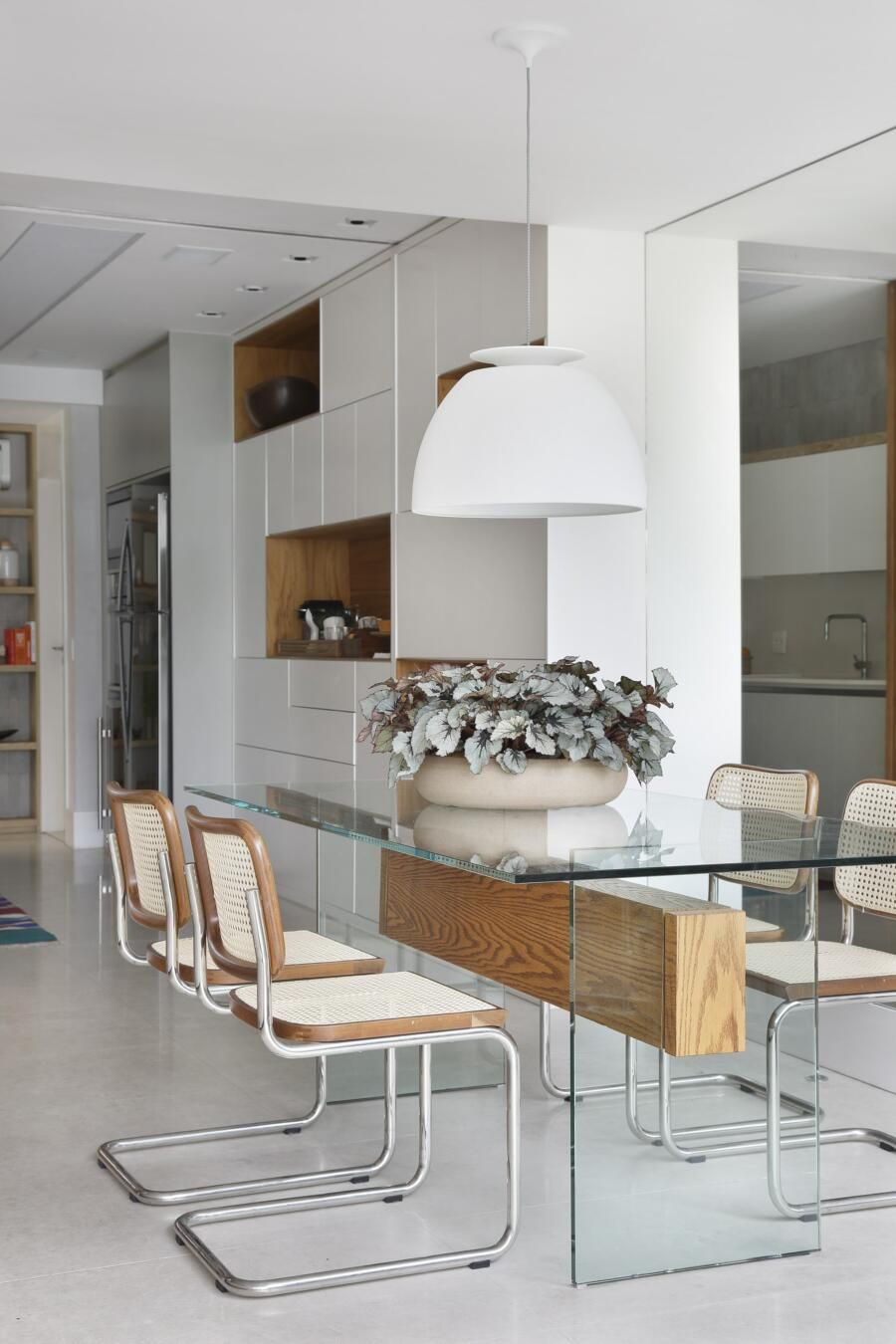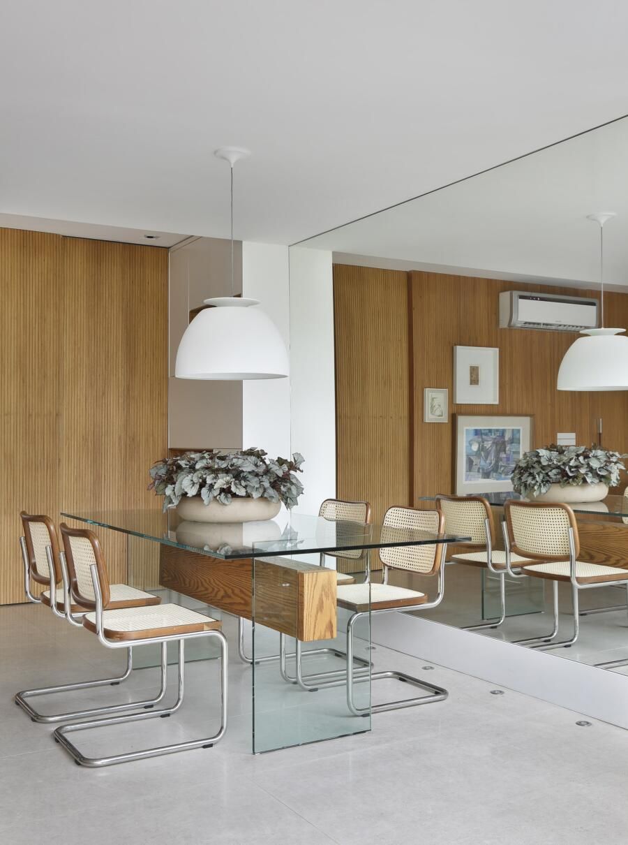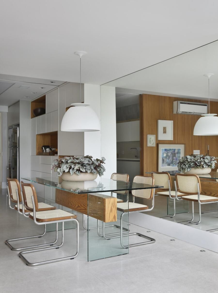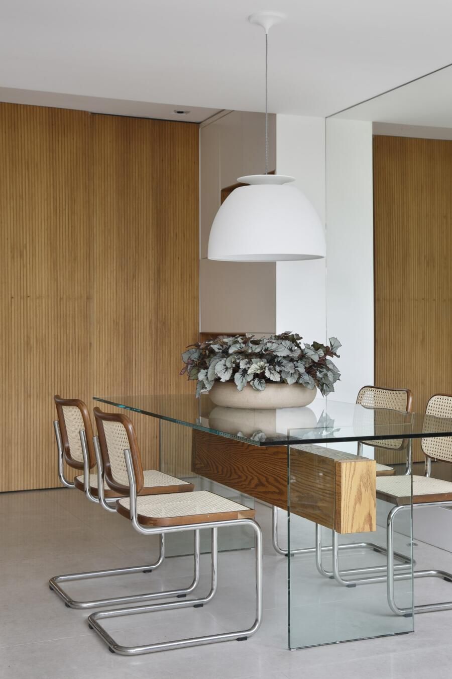 “A área social foi toda integrada à cozinha, com portas de correr para fechar o cômodo quando necessário e com uma área de serviço isolada do restante. Optamos por uma mesa de vidro na sala de jantar para trazer leveza através da transparência, e no estar montamos prateleiras com livros do casal. Ao fundo, a porta de entrada camufla-se ao painel ripado.”