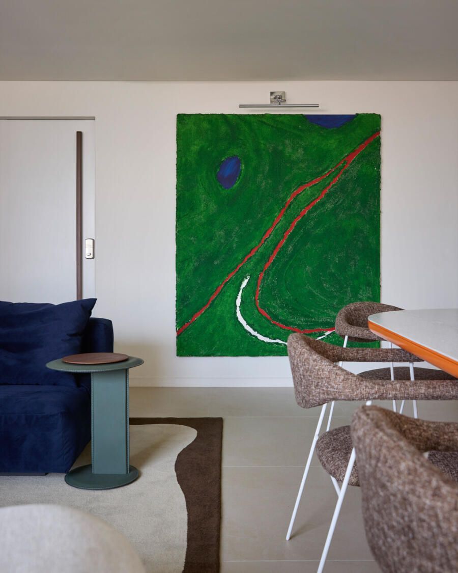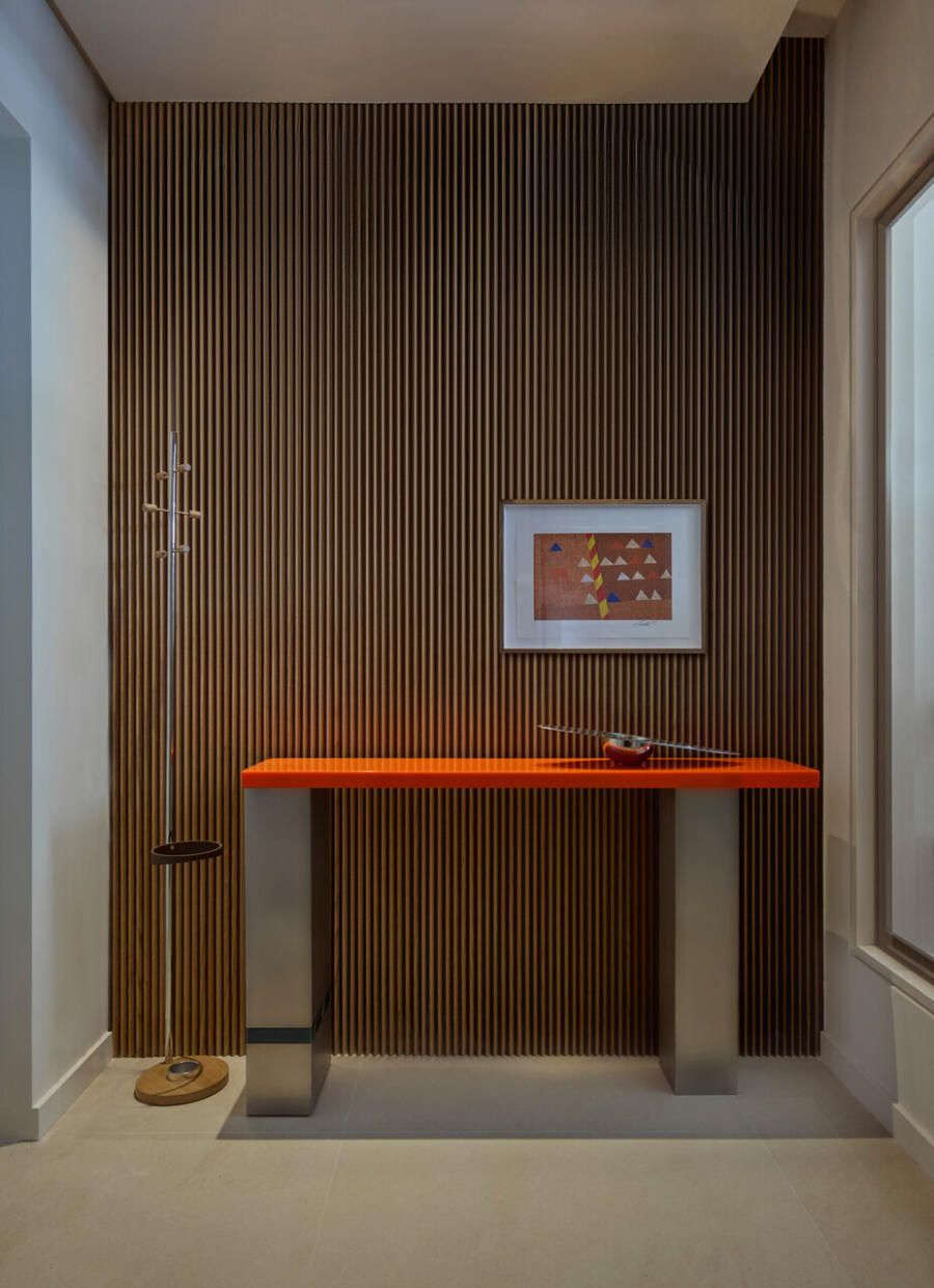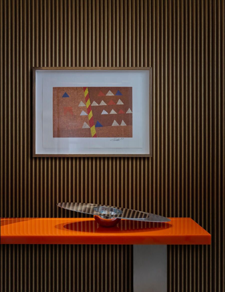 As cores são protagonistas: verde, azul, laranja, marrom e off-white dialogam com pontos de vermelho e azul piscina, compondo um equilíbrio vibrante. A sala se abre para a vista, com o sofá posicionado estrategicamente, enquanto o bar em Wenge, com portas de tecido, cria um detalhe elegante e discreto. O hall de entrada recebe um painel triangular ripado, que muda de tonalidade conforme o movimento de quem chega, e um aparador de aço inox e resina colorida completa o cenário.