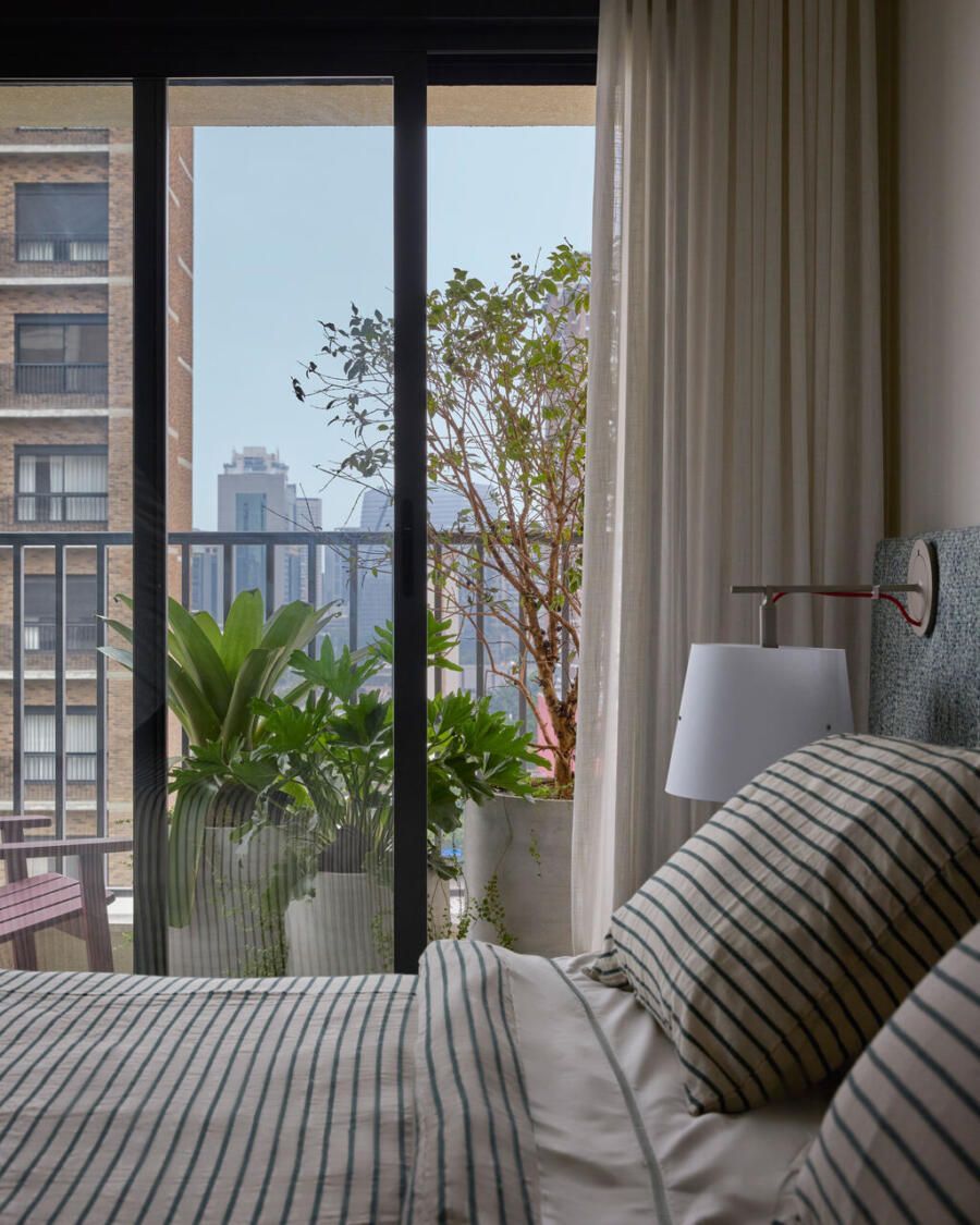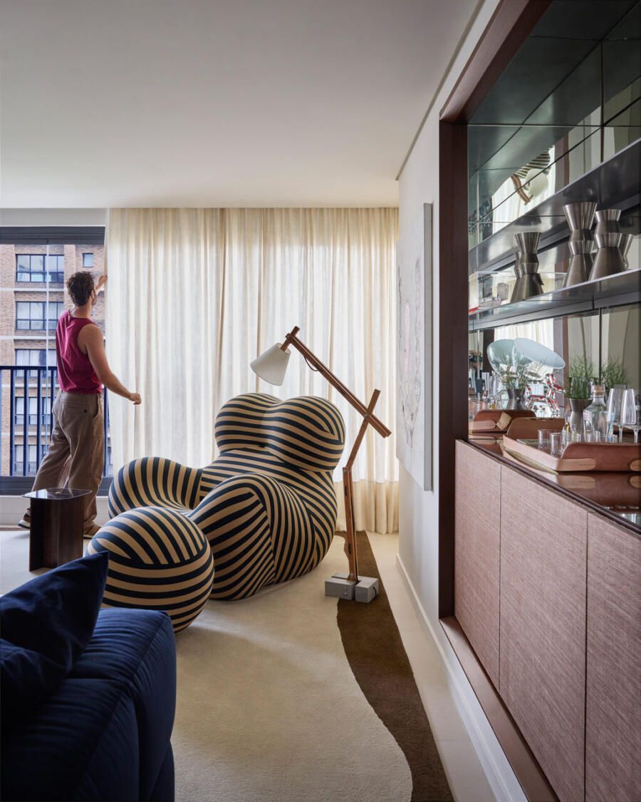 “O principal desafio foi criar uma concepção harmônica com diferentes cores e o conceito que gostaríamos de trazer para o apartamento. Foram diferentes estudos de cor e mobiliário para chegarmos no resultado final. Além disso existia o desafio da cozinha ficar limpa e com um bom layout para todo o espaço. O bar também foi um desafio de execução entre diferentes fornecedores que recebe portas de tecido da Nani Chinellato. As portas de passagem não possuem guarnições aparentes e isso se deu por um batente embutido nas paredes que são de difícil execução.”