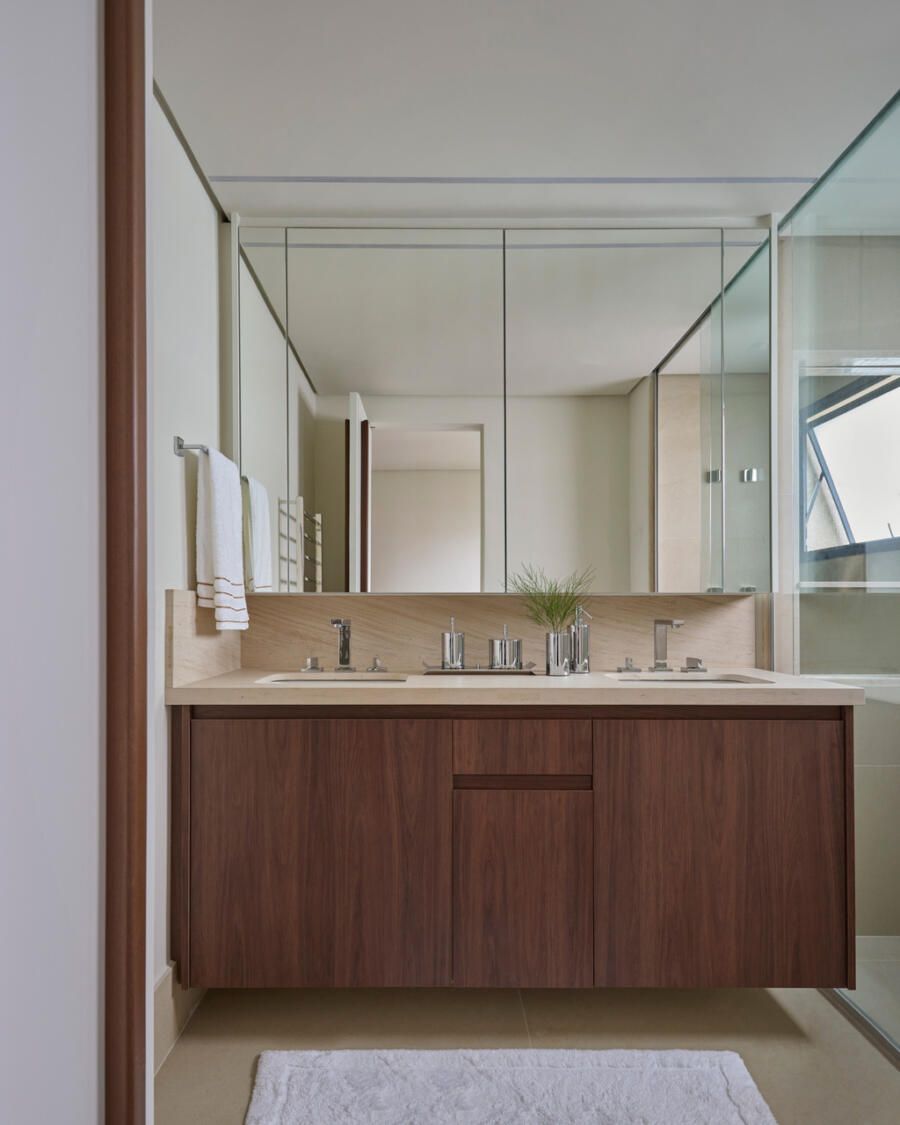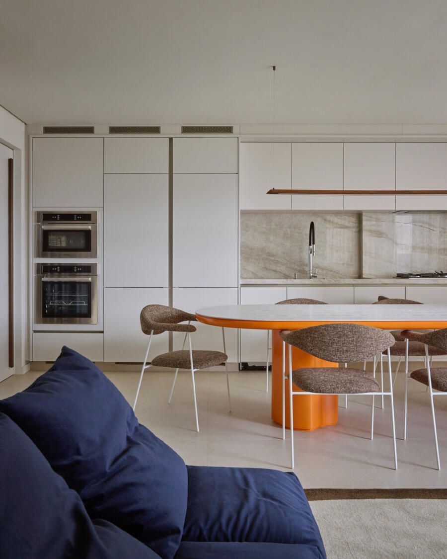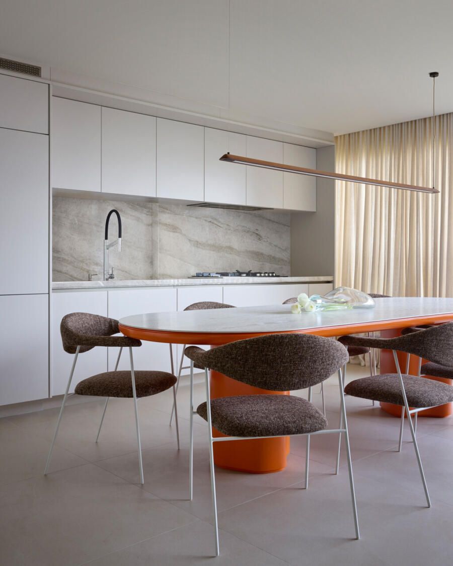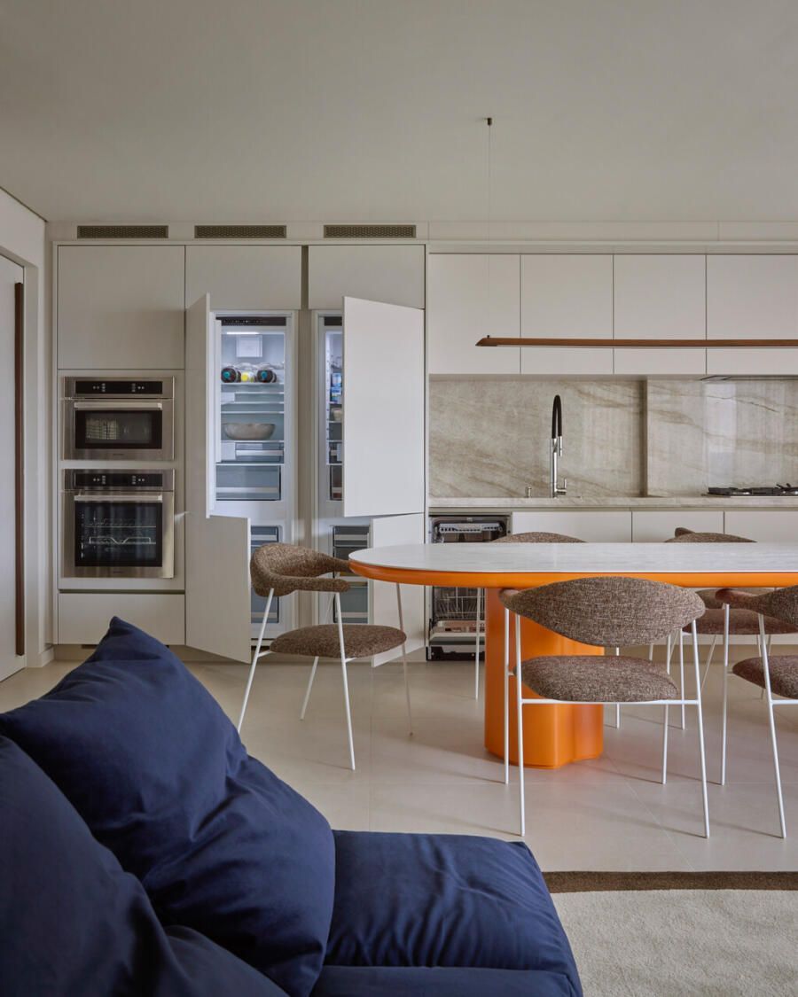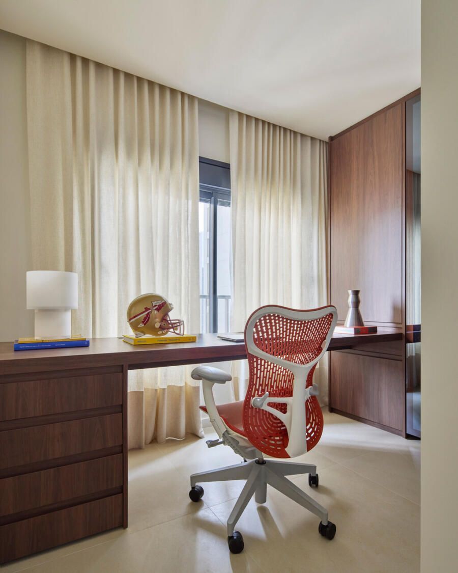Cada ambiente foi cuidadosamente desenhado. A mesa de jantar em carvalho tingido de off-white com pés em laca laranja brilha em cores e formas orgânicas, o home com marcenaria funcional esconde equipamentos sem perder estilo, e a suíte principal combina armários de vidro e madeira escura com tapetes e cabeceiras que dialogam com arandelas e tecidos escolhidos minuciosamente. No escritório, a bancada flutua, criando leveza, enquanto a iluminação com lâmpadas dimerizáveis e perfis de LED traz aconchego e dramaticidade aos espaços.