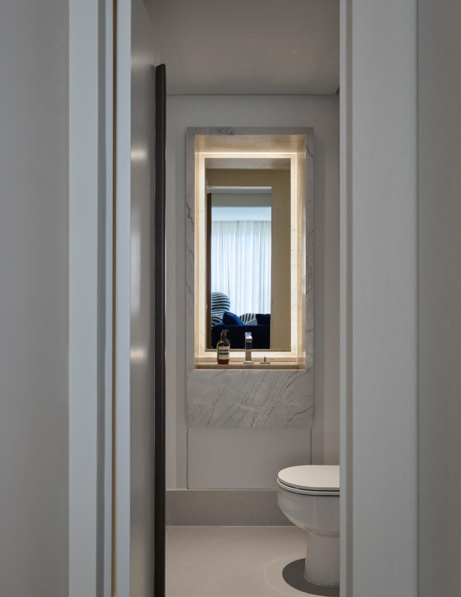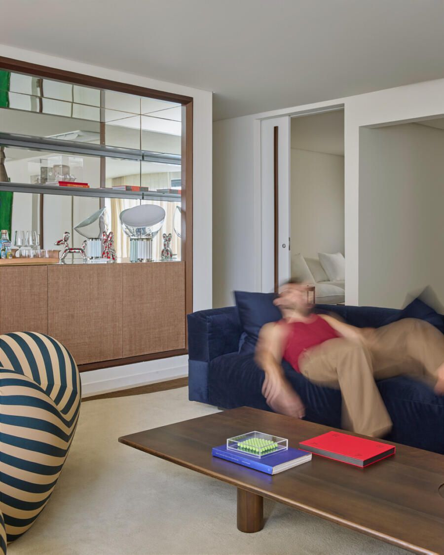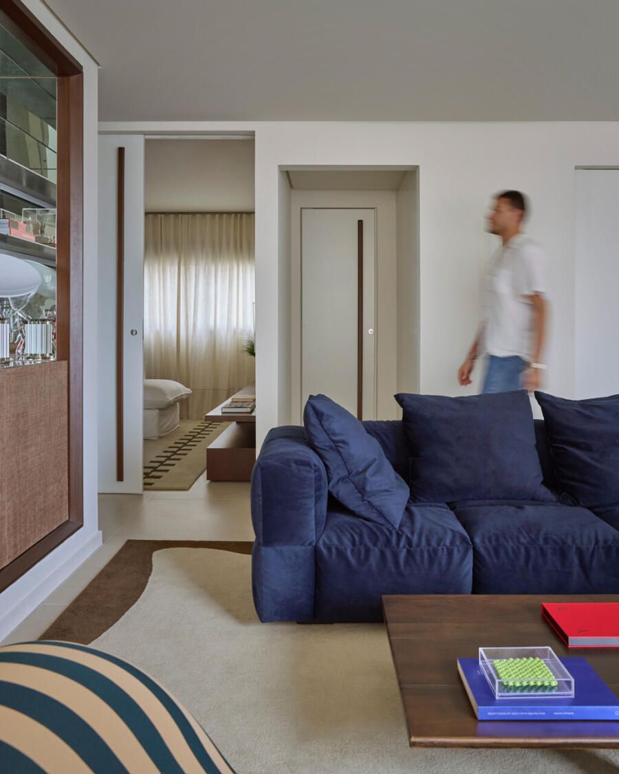 O projeto nasceu de uma indicação especial: o cliente é filho de uma cliente antiga do escritório, e essa conexão permitiu com que cada detalhe fosse pensado com assertividade. A cozinha foi aberta para a sala, o terceiro quarto se tornou um home, o banheiro da suíte se transformou em lavabo e o antigo lavabo se tornou um louceiro, enquanto o bar ganhou nova proporção, mantendo sua presença sem pesar na arquitetura. Cada intervenção buscou harmonizar funcionalidade, estética e personalidade.