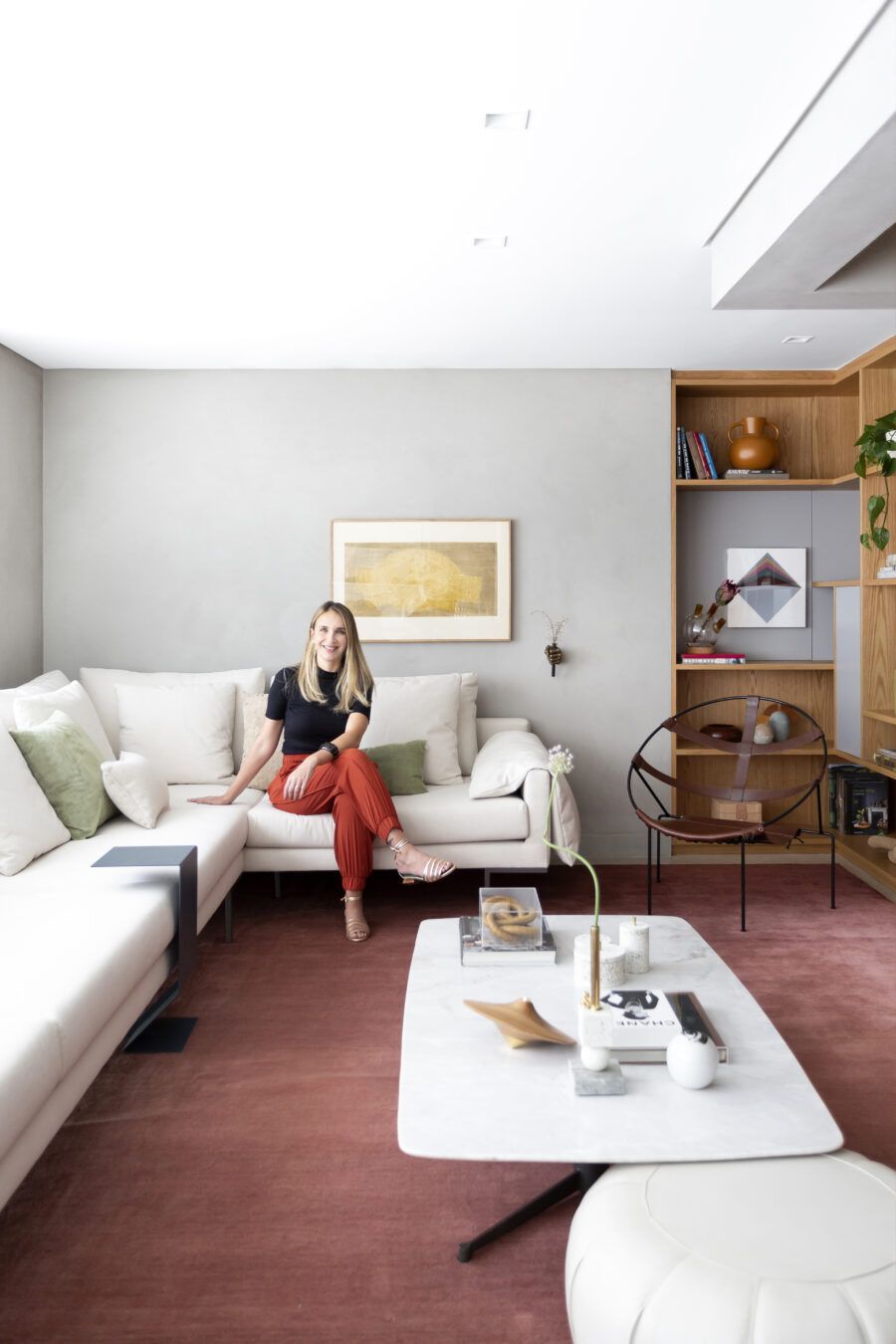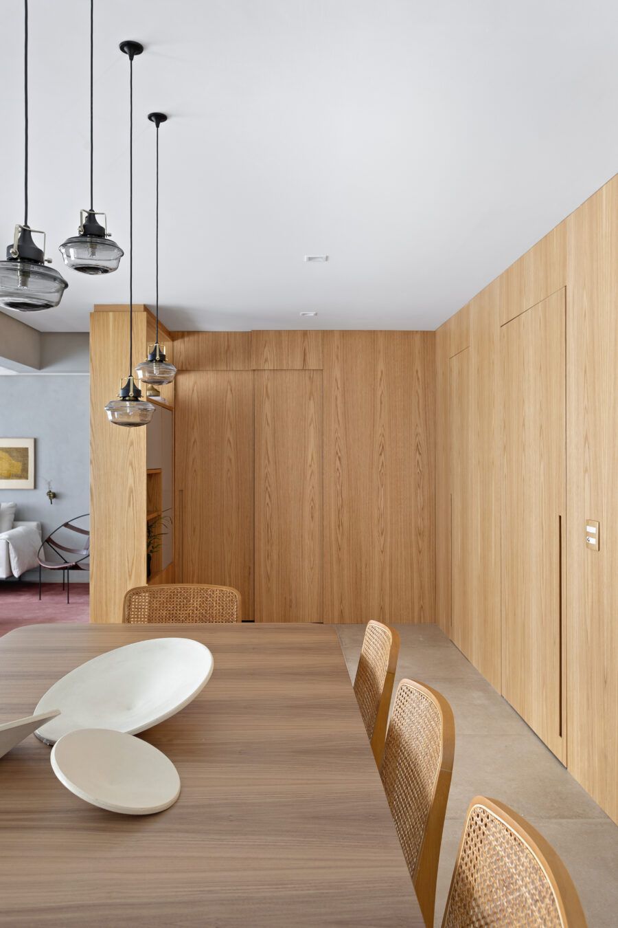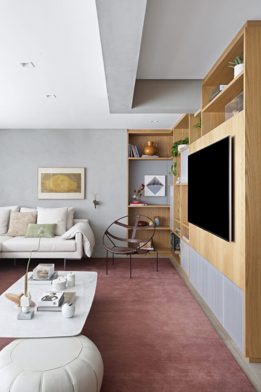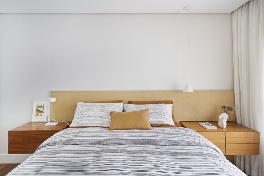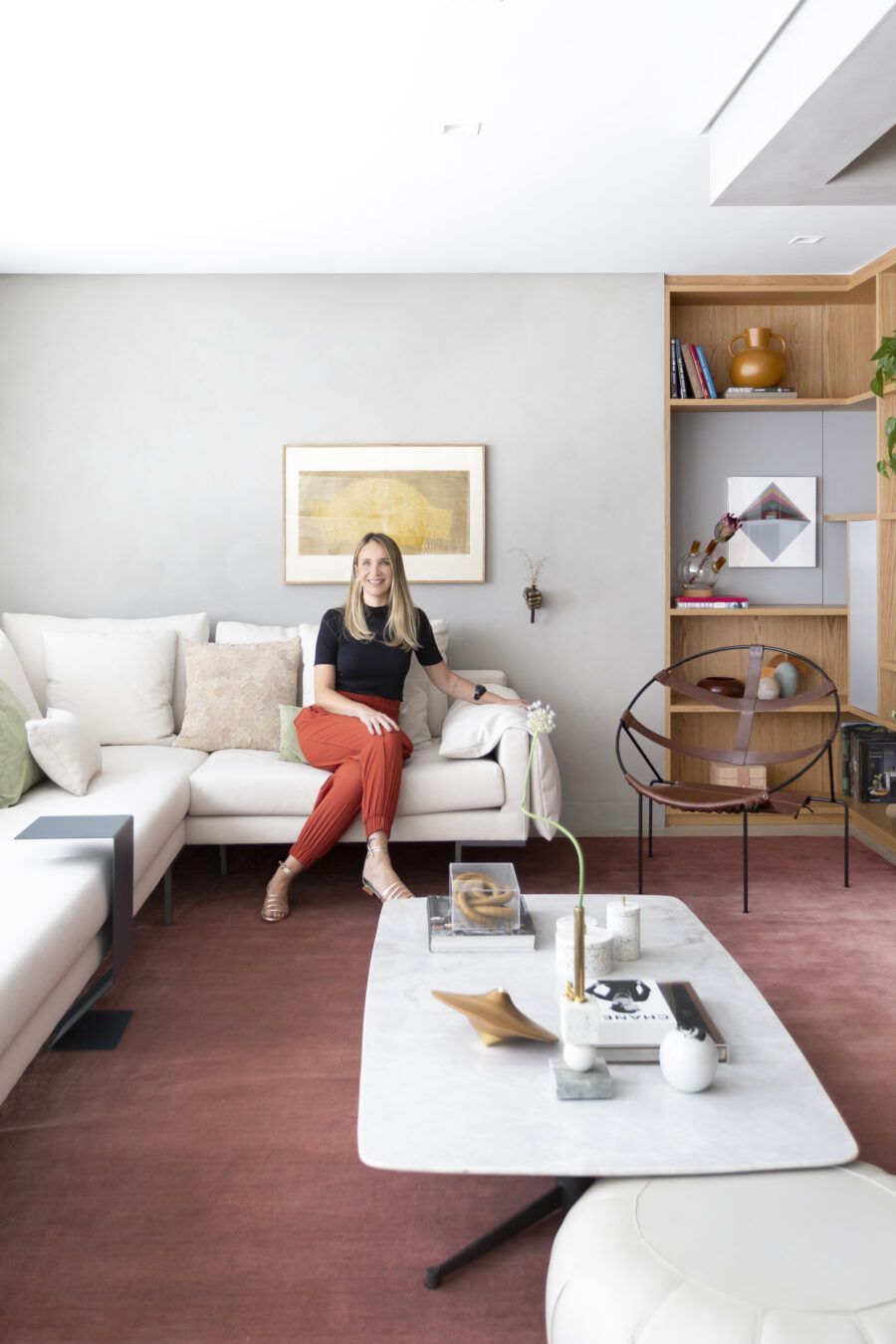 “Os clientes queriam mudar completamente a cara do apartamento. Já na nossa primeira reunião entendi que eles desejavam um apartamento moderno, clean e aconchegante. O principal pedido deles foi deixar a sala mais ampla possível também. Gostam de design e arte, e isso é super presente no apartamento, nas escolhas dos móveis, quadros e objetos de decoração.”
