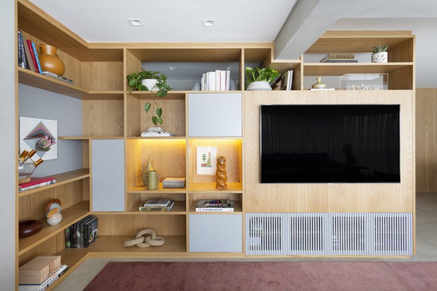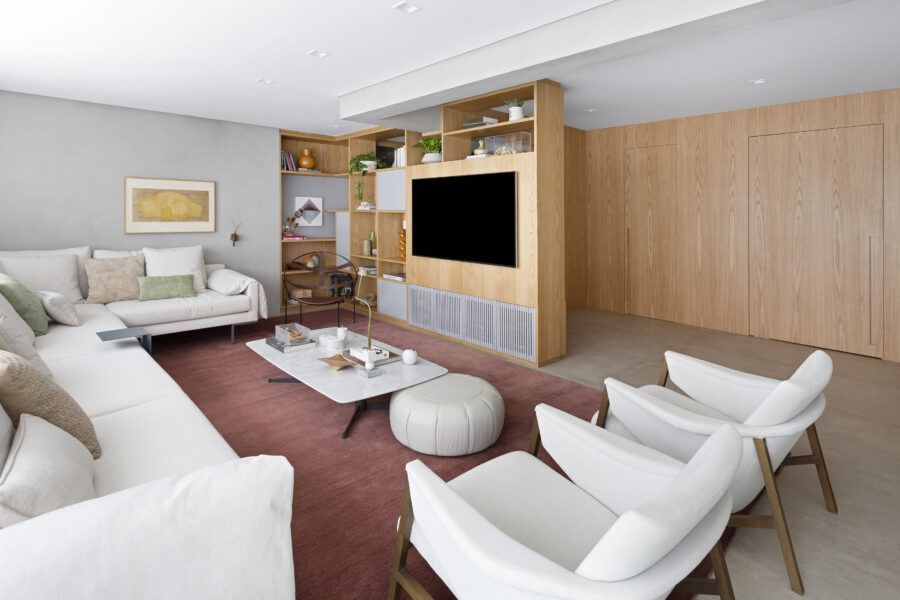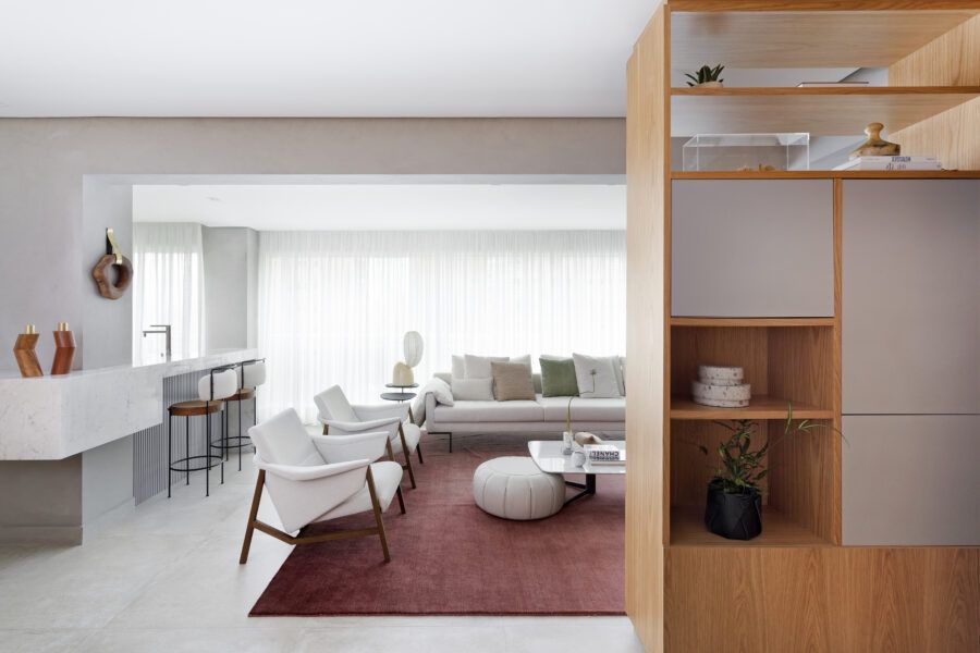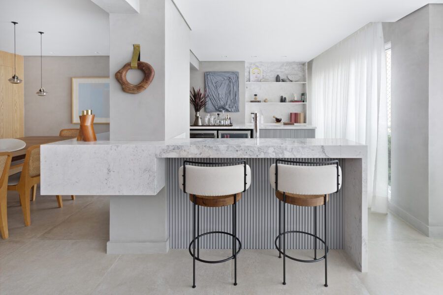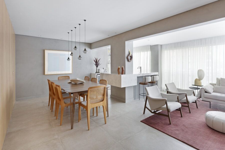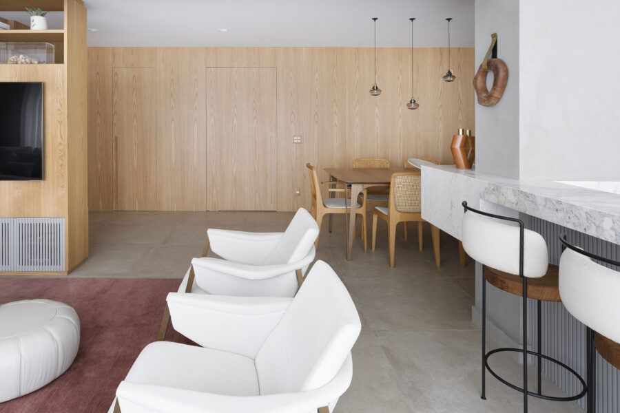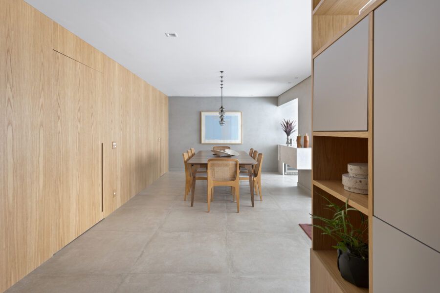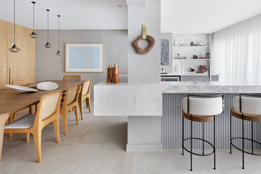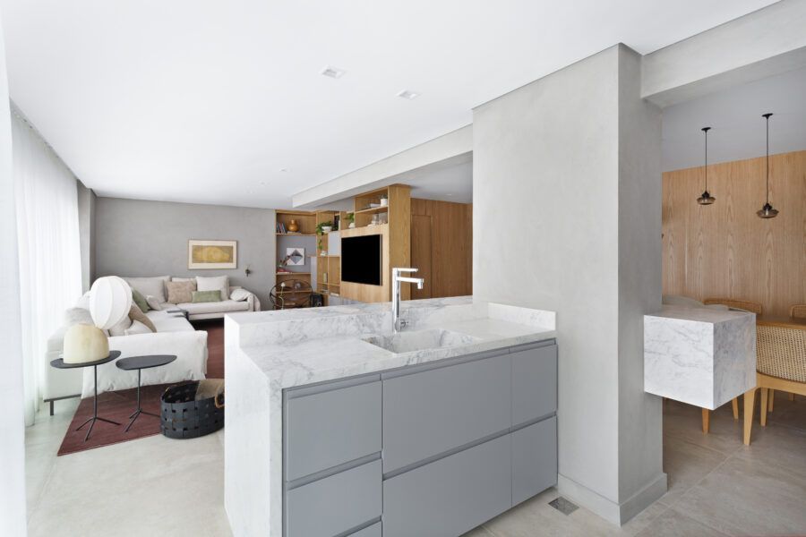 “A unidade visual do apartamento todo é única, usamos madeira carvalho e tons diferentes de cinza na marcenaria, em laca e MDF. Como aumentamos a integração dos ambientes este foi um ponto importante. Destaque também para o bar com bancada toda em mármore contornando a coluna existente, com cuba, adegas e nichos para bebidas. A marcenaria em madeira ripada em laca cinza dá o toque final esperado, mais sofisticado. Também para as paredes, todas receberam cimento queimado.”