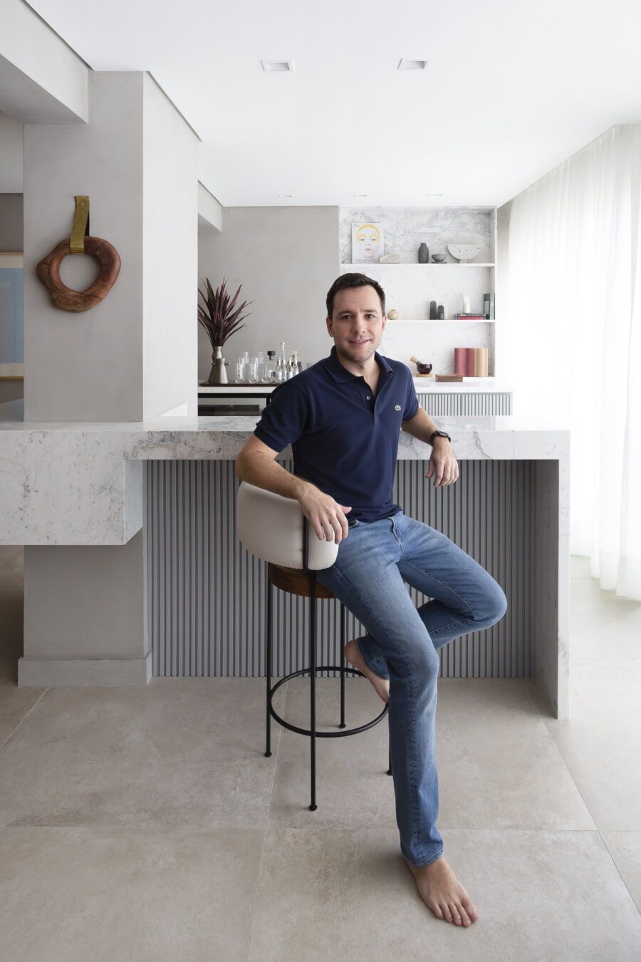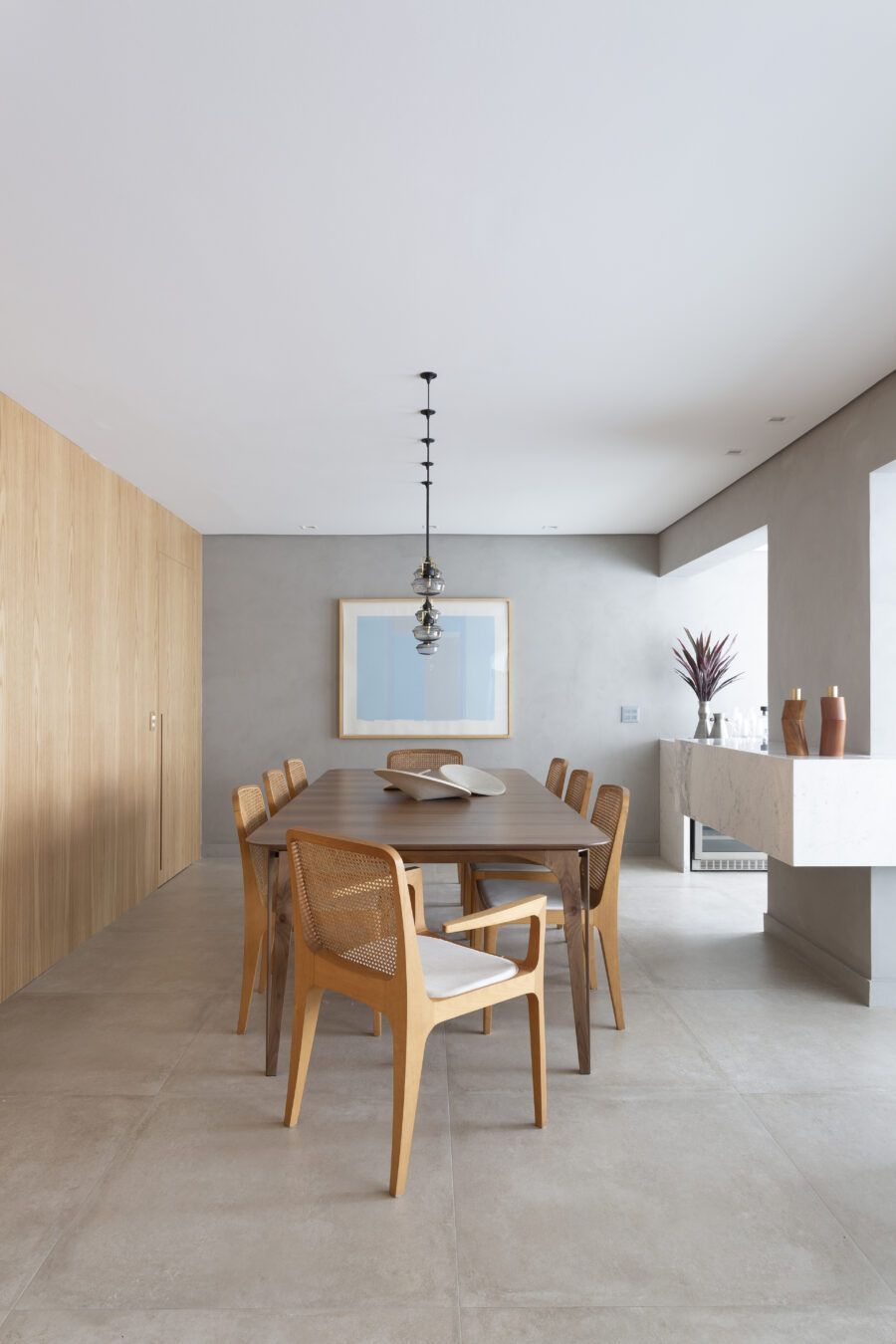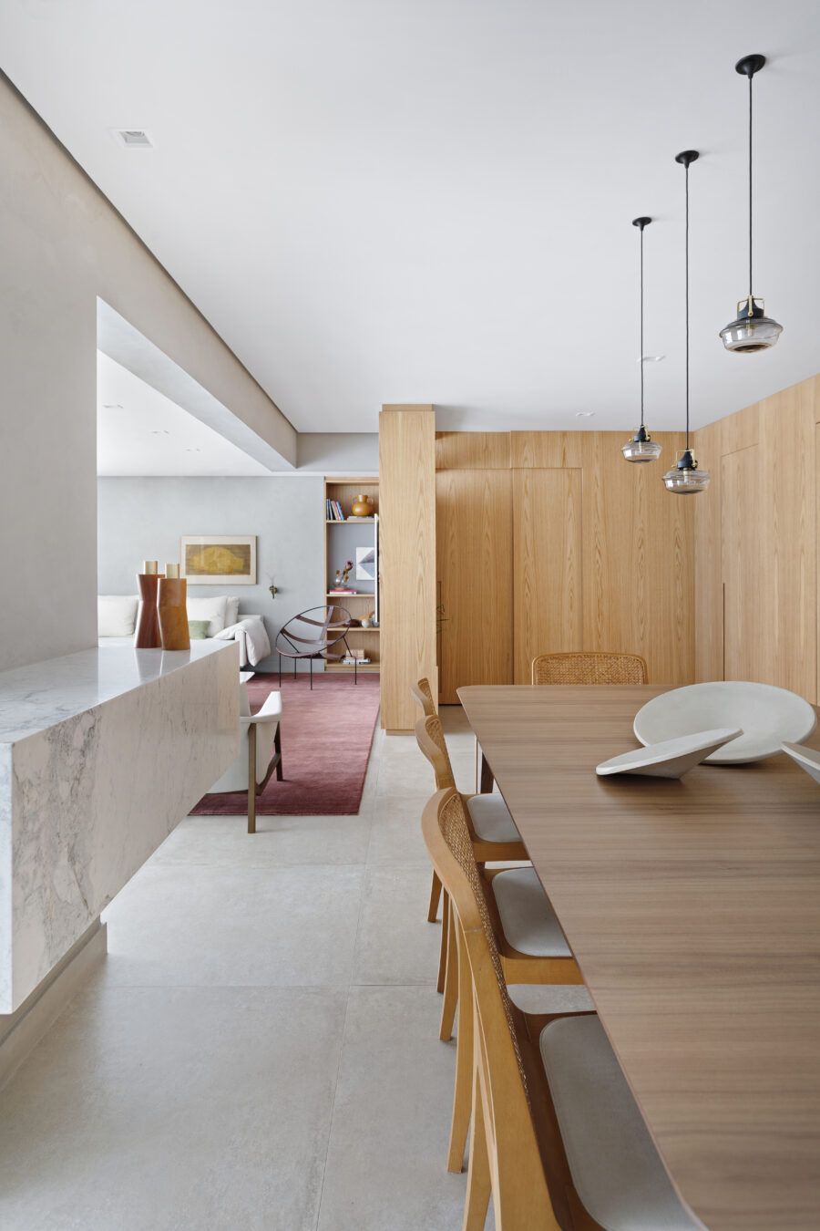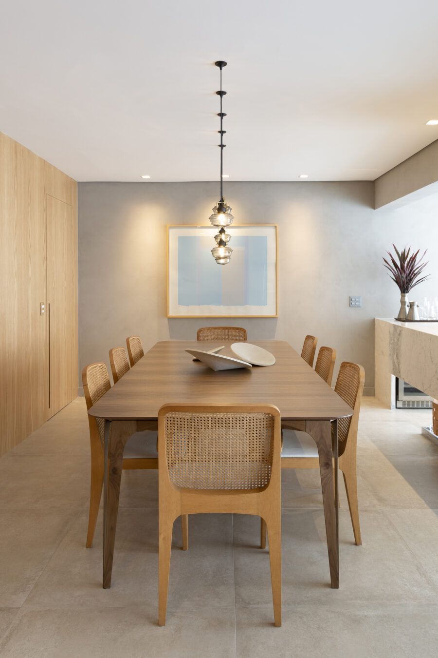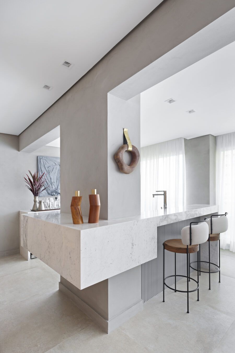 “A unidade visual do apartamento todo é única, usamos madeira carvalho e tons diferentes de cinza na marcenaria, em laca e MDF. Como aumentamos a integração dos ambientes este foi um ponto importante. Destaque também para o bar com bancada toda em mármore contornando a coluna existente, com cuba, adegas e nichos para bebidas. A marcenaria em madeira ripada em laca cinza dá o toque final esperado, mais sofisticado. Também para as paredes, todas receberam cimento queimado.”