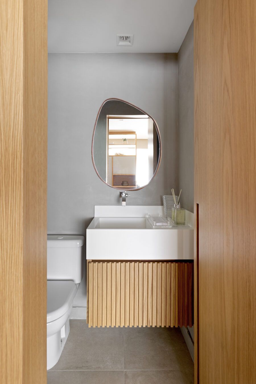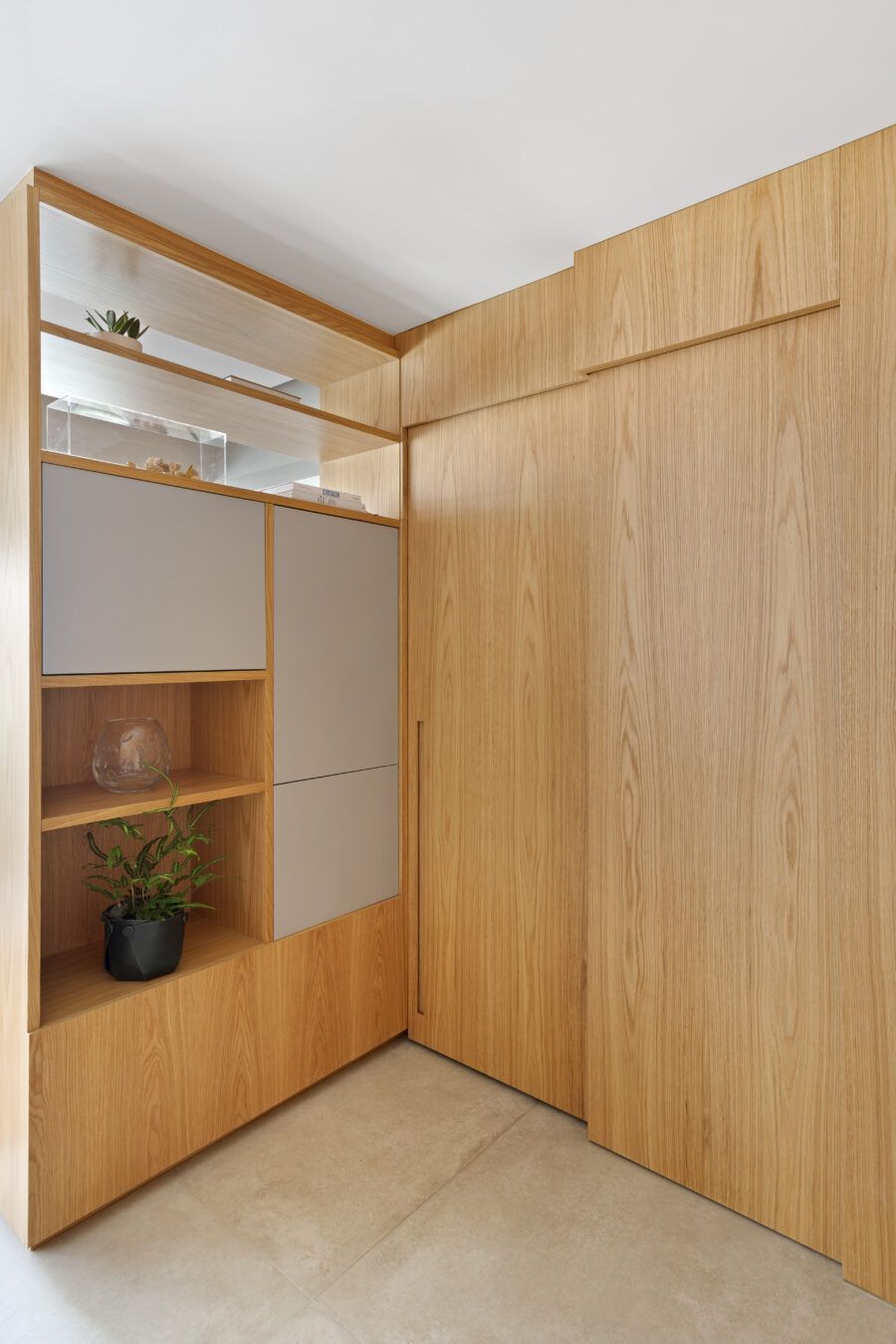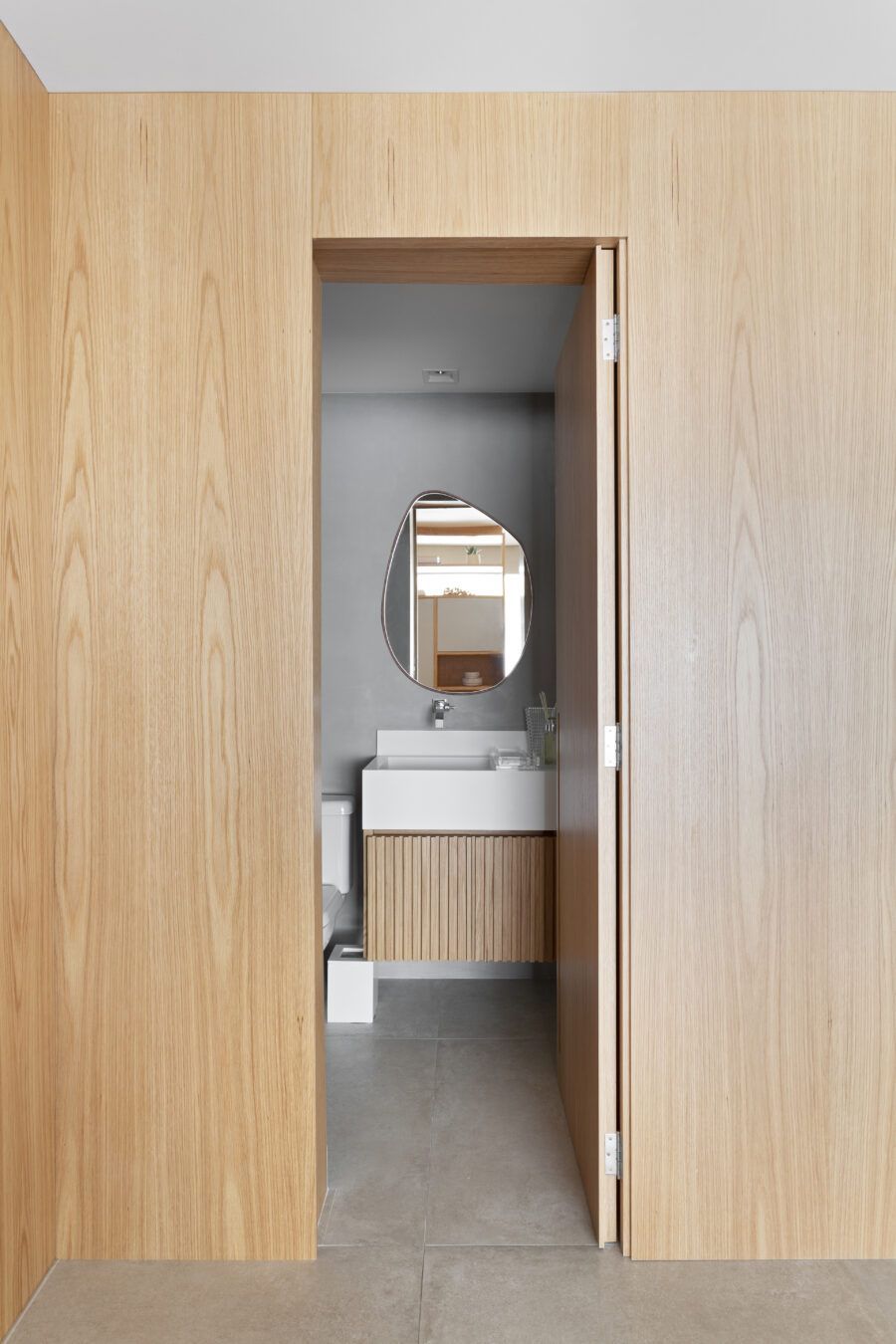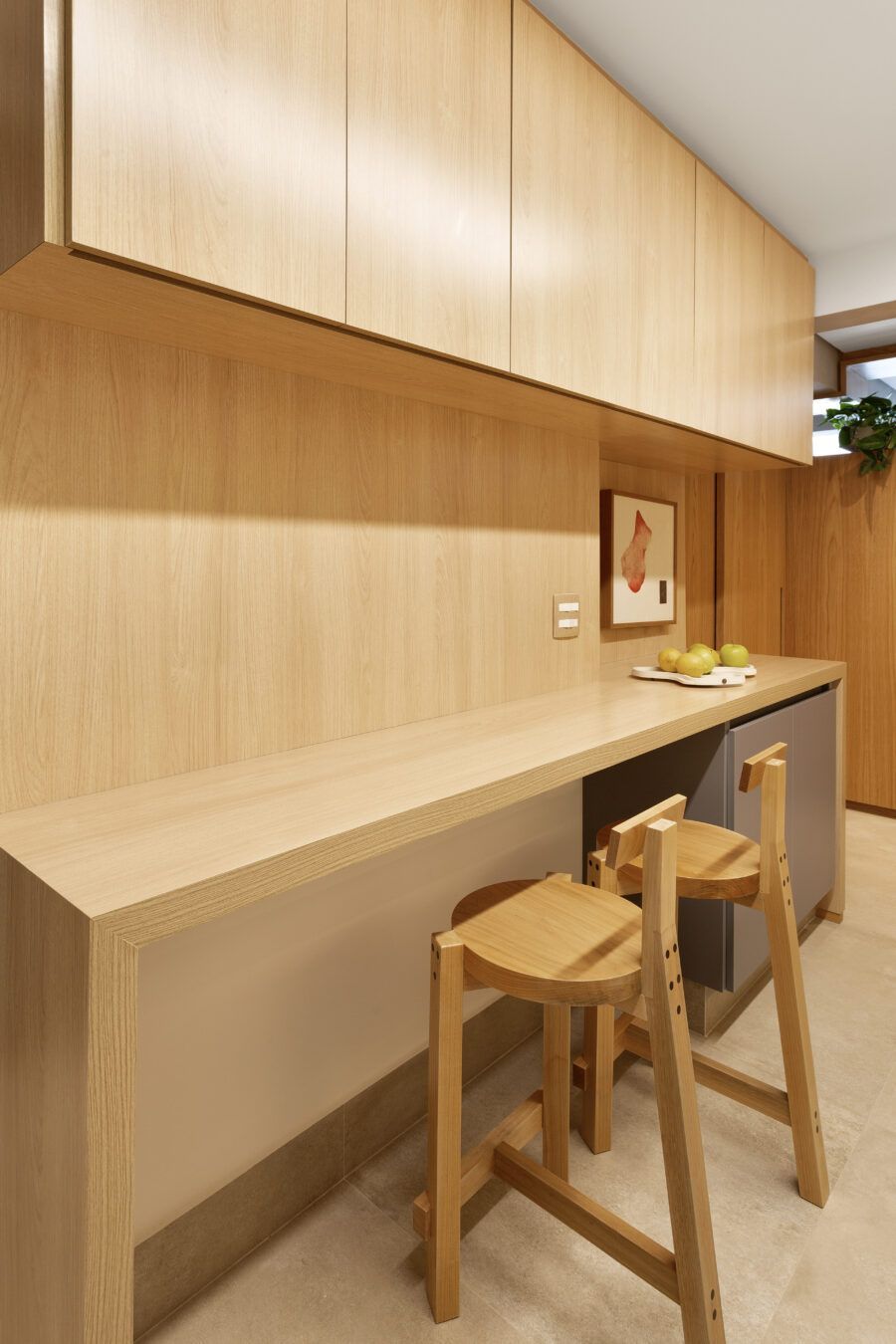 “A unidade visual do apartamento todo é única, usamos madeira carvalho e tons diferentes de cinza na marcenaria, em laca e MDF. Como aumentamos a integração dos ambientes este foi um ponto importante. Destaque também para o bar com bancada toda em mármore contornando a coluna existente, com cuba, adegas e nichos para bebidas. A marcenaria em madeira ripada em laca cinza dá o toque final esperado, mais sofisticado. Também para as paredes, todas receberam cimento queimado.”
