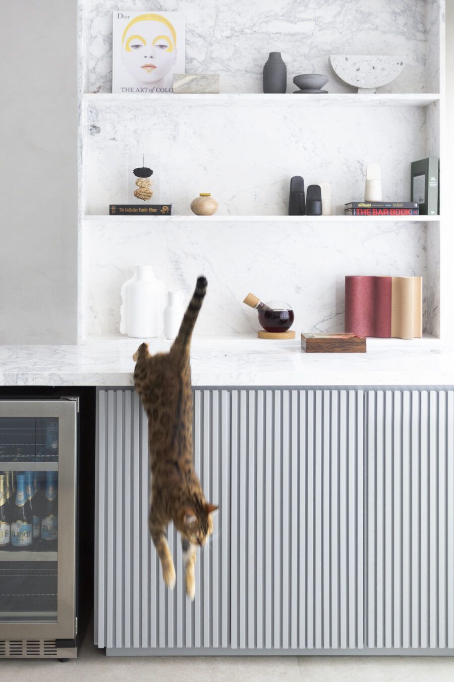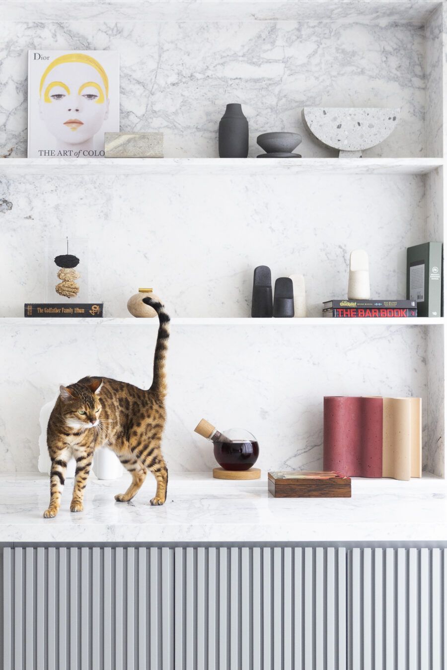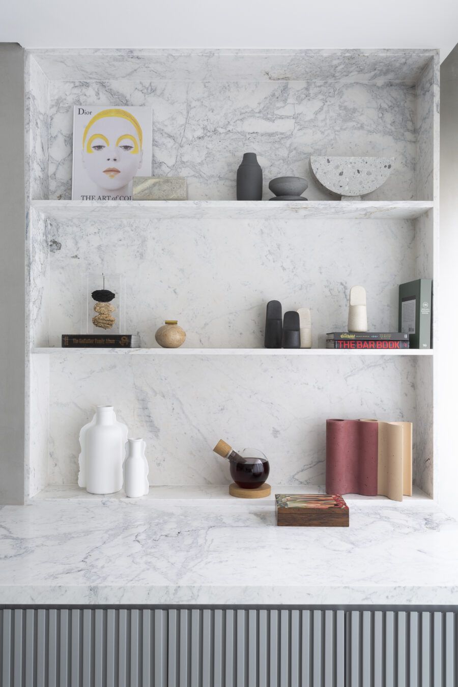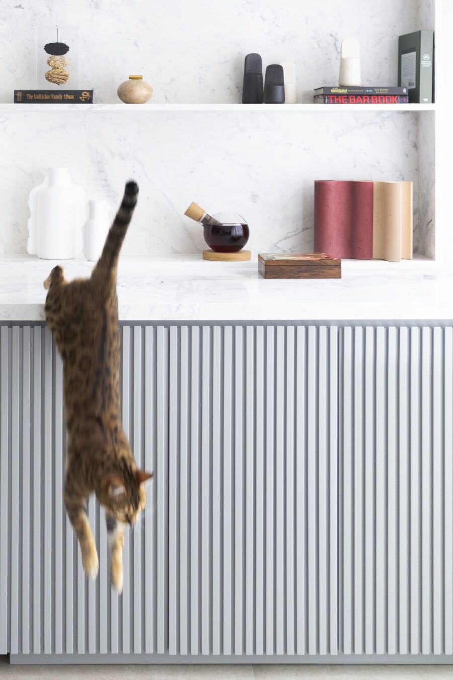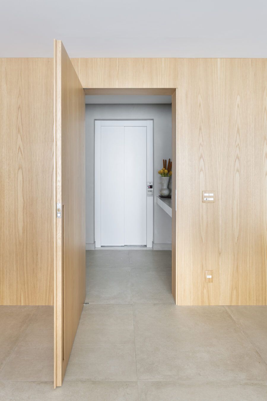“A unidade visual do apartamento todo é única, usamos madeira carvalho e tons diferentes de cinza na marcenaria, em laca e MDF. Como aumentamos a integração dos ambientes este foi um ponto importante. Destaque também para o bar com bancada toda em mármore contornando a coluna existente, com cuba, adegas e nichos para bebidas. A marcenaria em madeira ripada em laca cinza dá o toque final esperado, mais sofisticado. Também para as paredes, todas receberam cimento queimado.”