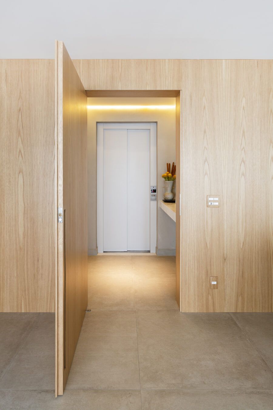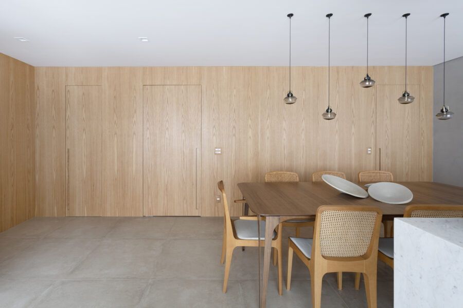 “A parede maior da sala foi toda revestida com painéis de madeira carvalho folha natural, incluindo todas as portas. Como o piso é de porcelanato cimento e todas as paredes também receberam cimento queimado, esta grande parede revestida junto com a estante e iluminação, trazem mais aconchego para o espaço. Portas de correr embutidas no painel permitem isolar a cozinha quando necessário, e quando abertas mostra uma linda cristaleira iluminada.”