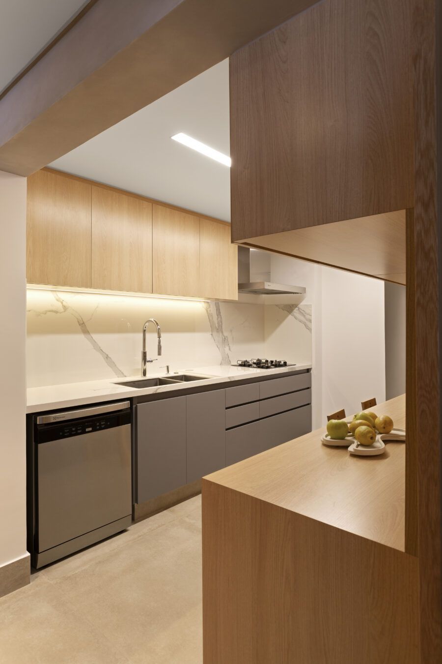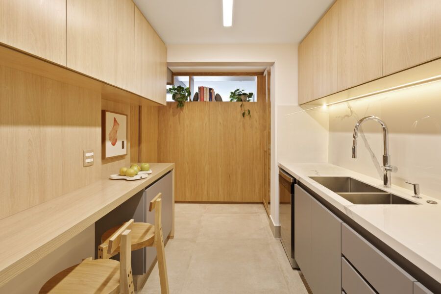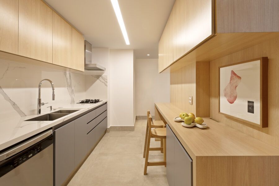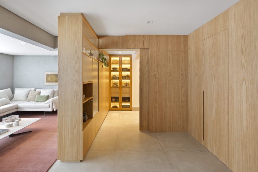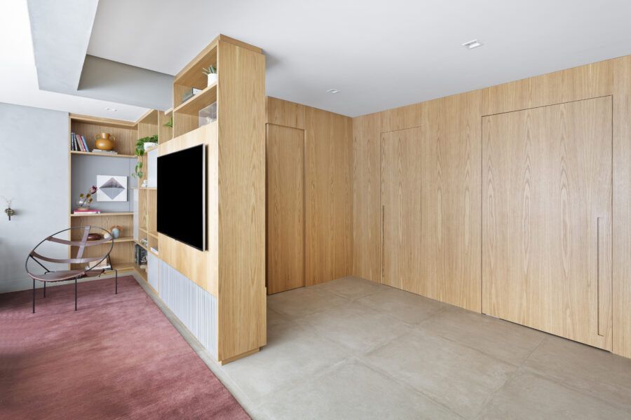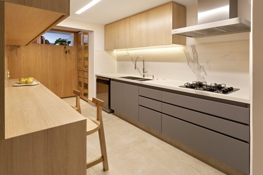 “Em termos estruturais, a ideia foi integrar o closet do quarto do casal com a sala e transferi-lo para o outro quarto. Quebramos todas estas paredes e assim a sala ganhou a amplitude que desejávamos (com o aumento desta área.) As esquadrias da cozinha para a sala também foram retiradas, assim como algumas pequenas paredes à sua volta. Quebramos também a antiga despensa e ampliamos a cozinha, neste espaço criamos uma marcenaria para geladeira, forno e micro-ondas.”