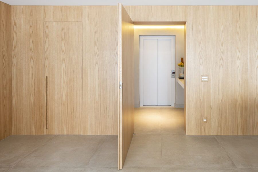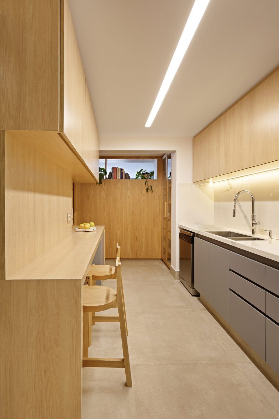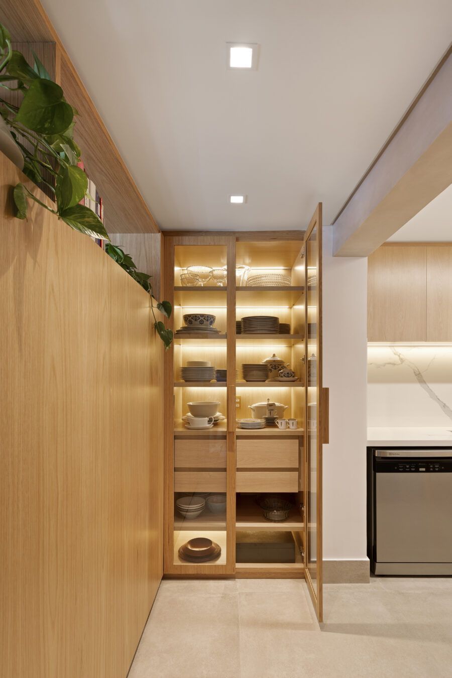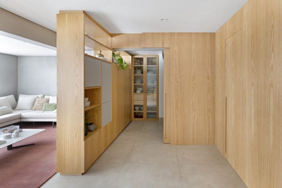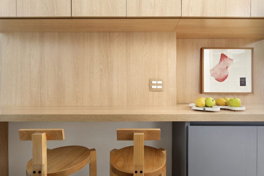 “Em termos estruturais, a ideia foi integrar o closet do quarto do casal com a sala e transferi-lo para o outro quarto. Quebramos todas estas paredes e assim a sala ganhou a amplitude que desejávamos (com o aumento desta área.) As esquadrias da cozinha para a sala também foram retiradas, assim como algumas pequenas paredes à sua volta. Quebramos também a antiga despensa e ampliamos a cozinha, neste espaço criamos uma marcenaria para geladeira, forno e micro-ondas.”