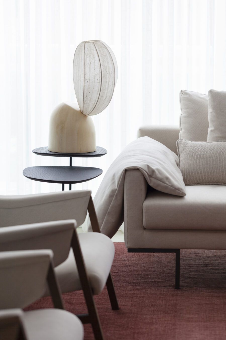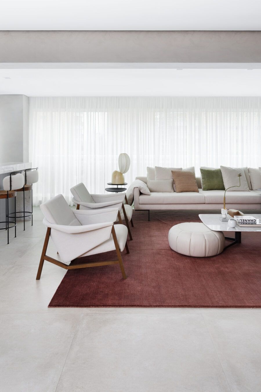 O estilo e conceito clean e moderno do apartamento é reforçado pelos móveis escolhidos para cada cantinho do apartamento. A presença de peças de designers brasileiros como Jader Almeida, Gustavo Bitencourt, Flavio de Carvalho e artistas como Barsotti, Piza, Sergio Lucena, Paulo Pasta, Gabriella Garcia trazem muita personalidade ao apê.