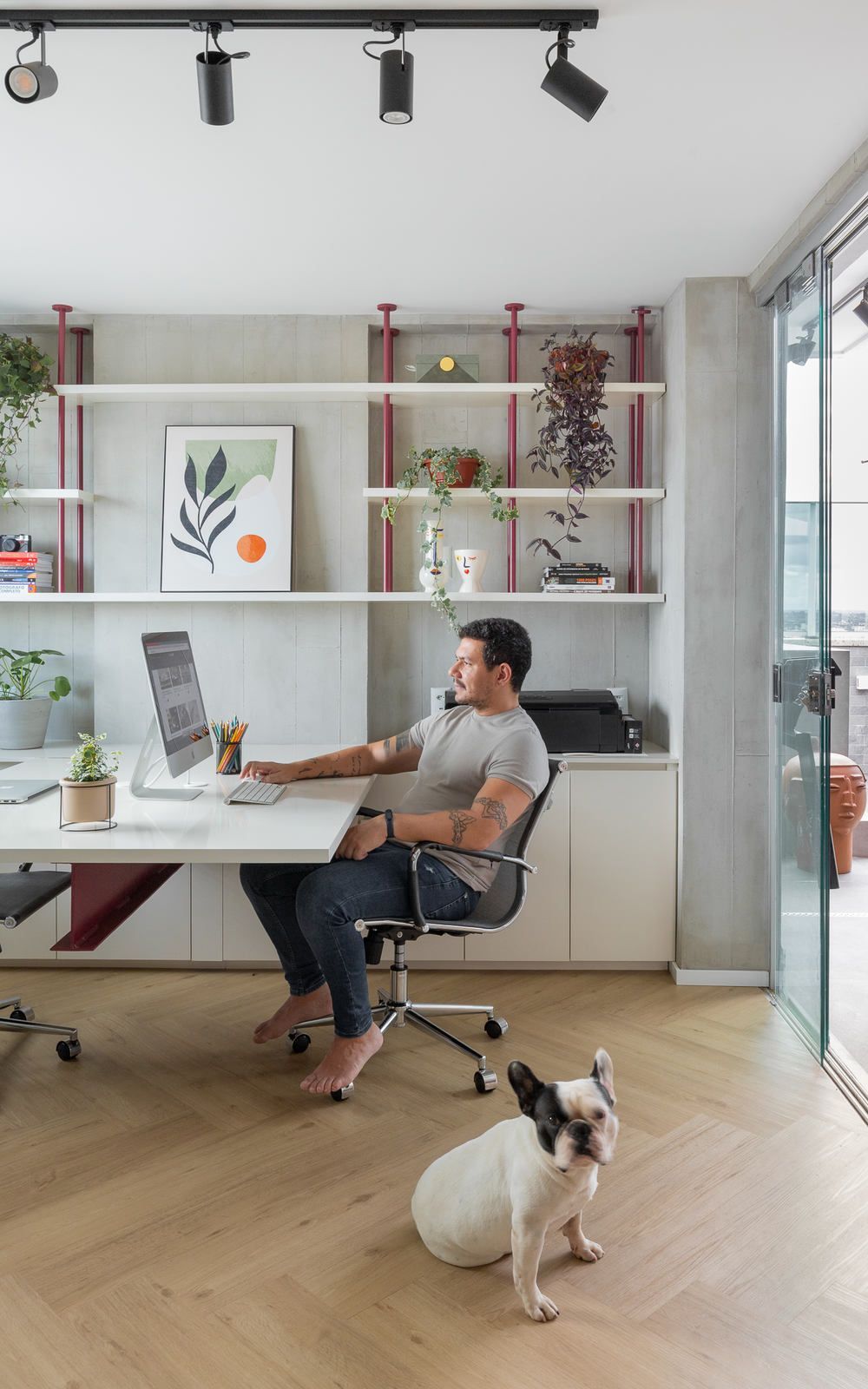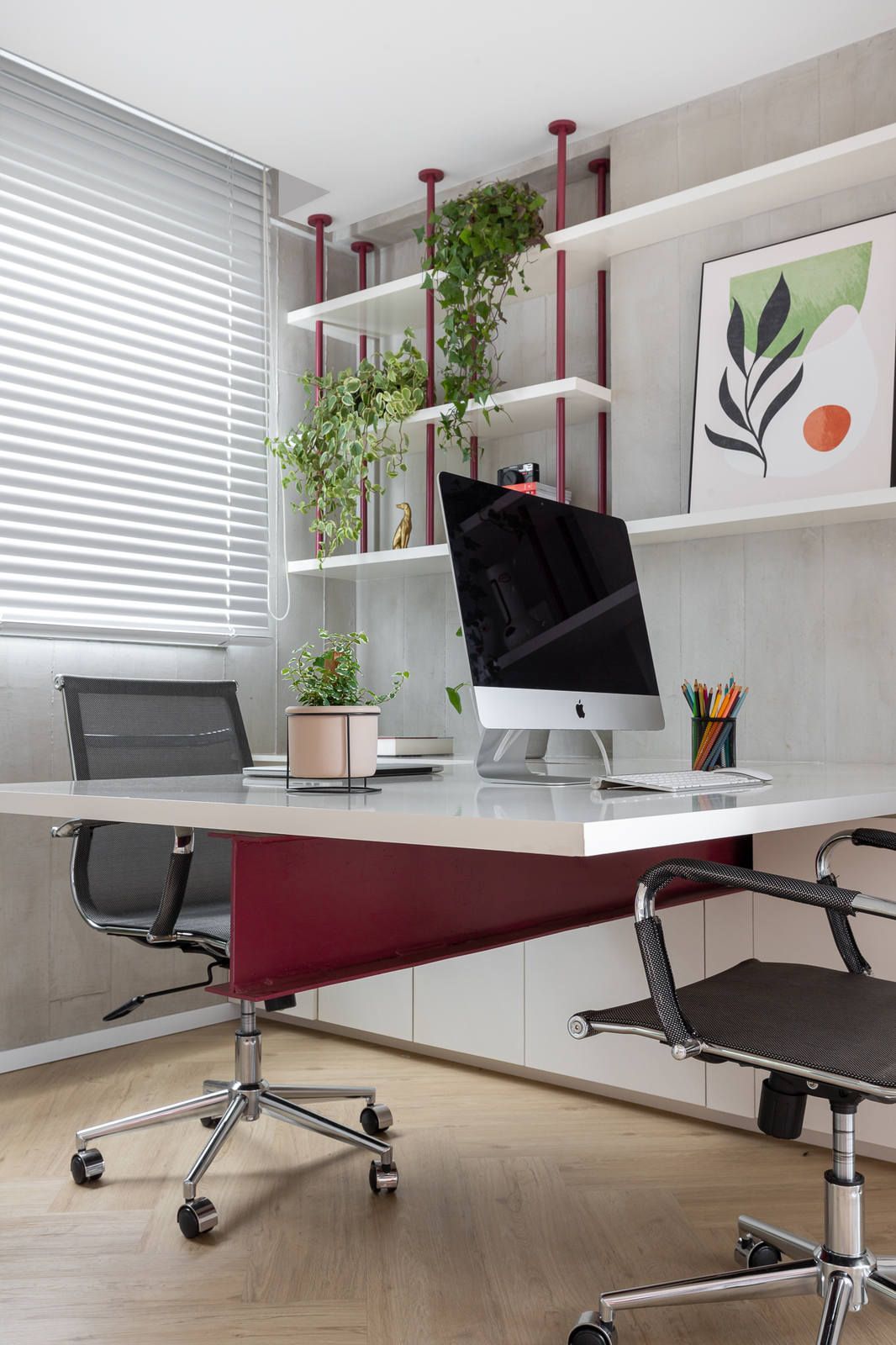 “No escritório, por exemplo, a é estruturada por uma viga metálica chumbada na parede e pintada da cor açaí. Um toque de cor sempre cai bem! E essa solução traz a sensação que a mesa flutua no ambiente, sem criar nenhuma barreira visual entre as duas estações de trabalho.”