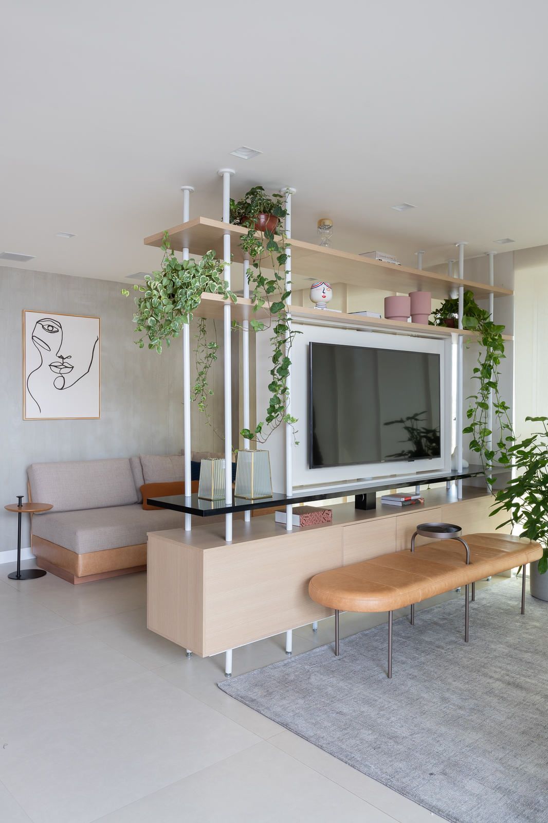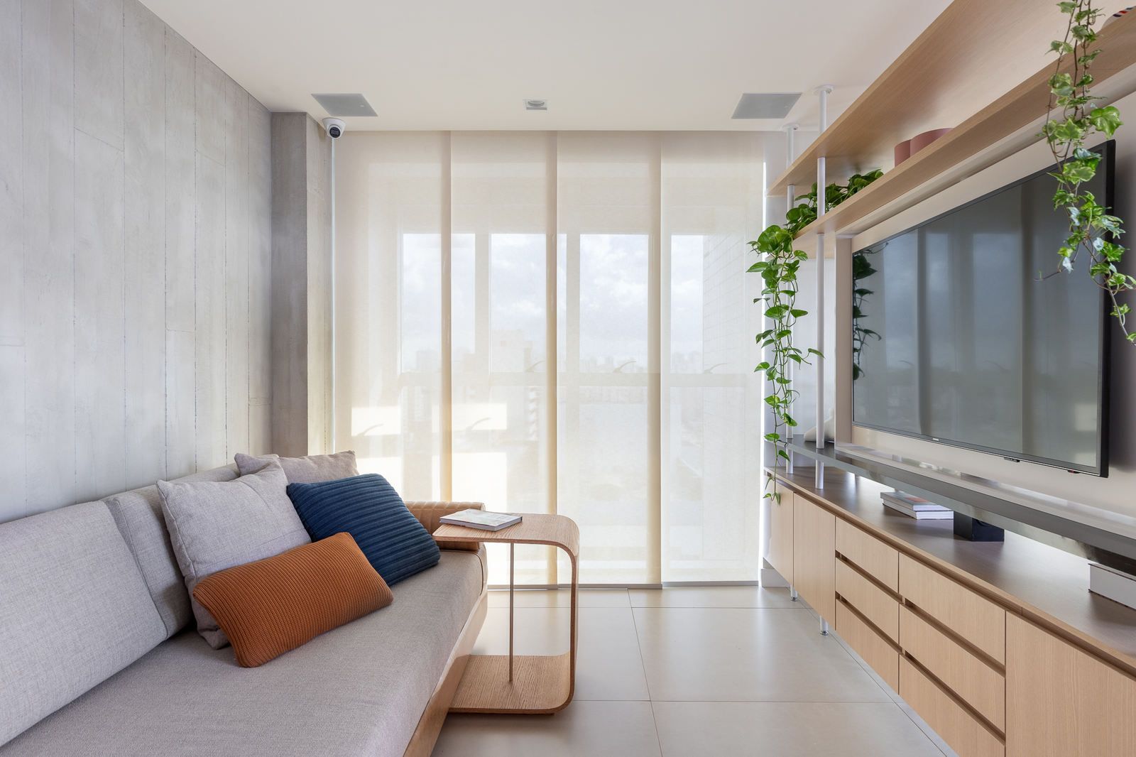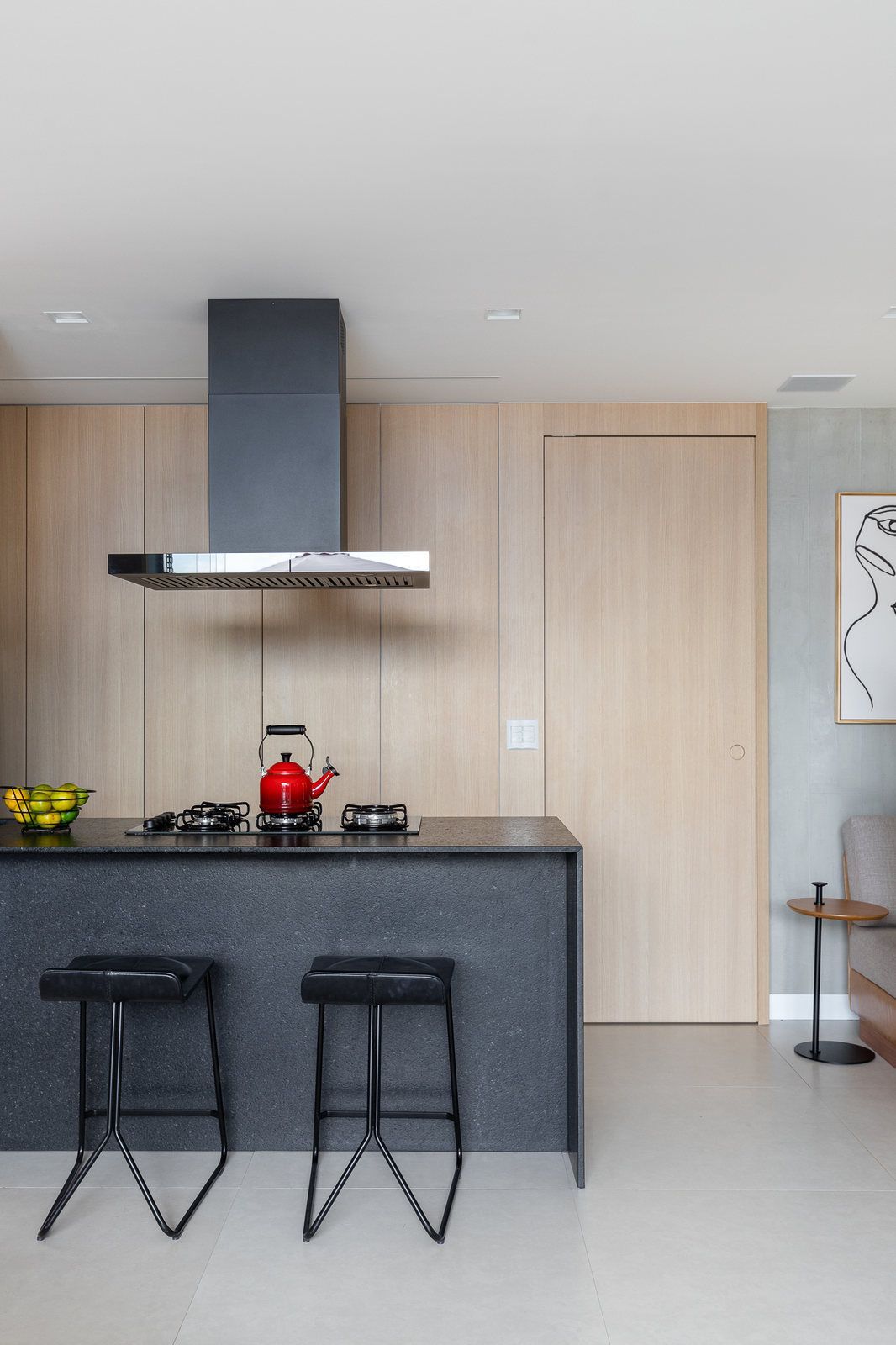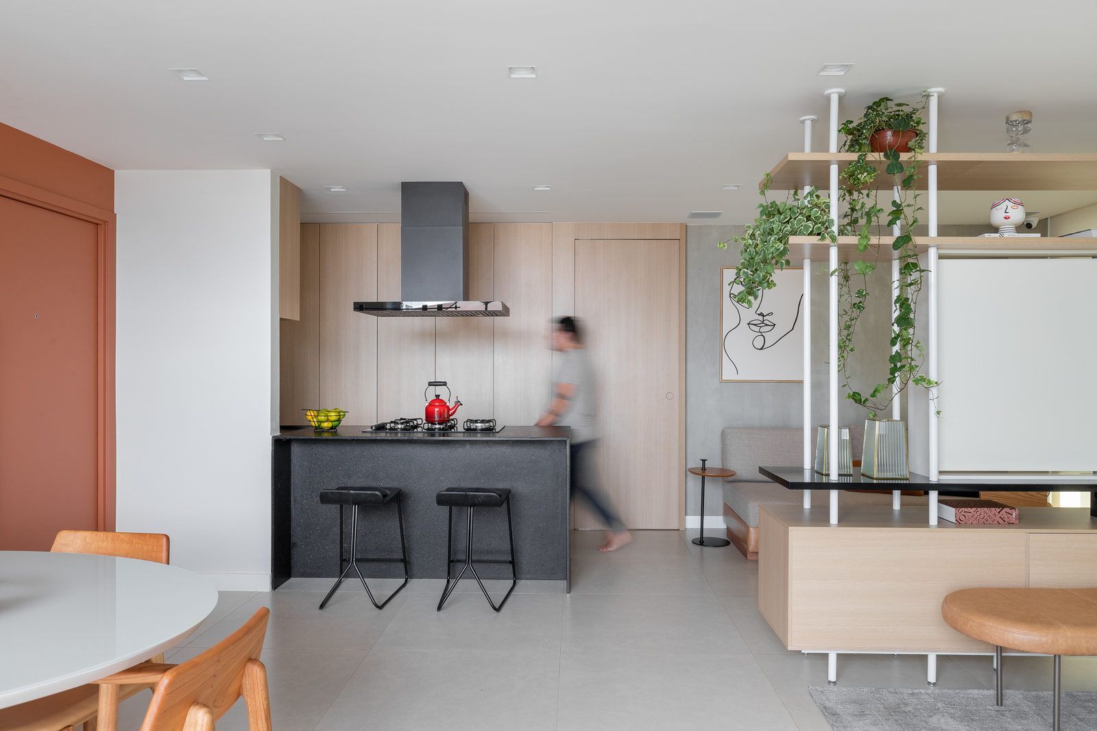 “A primeira demanda foi integrar totalmente a cozinha, a sala híbrida, o espaço de estar, de jantar e a televisão juntos. Removemos a parede que fazia o fechamento e os ambientes ganharam vida e amplitude.”