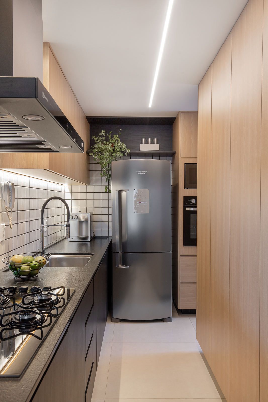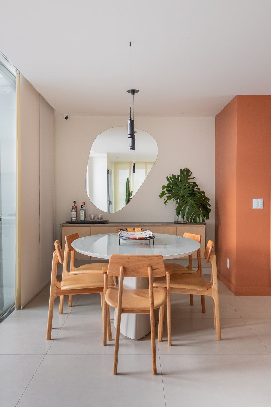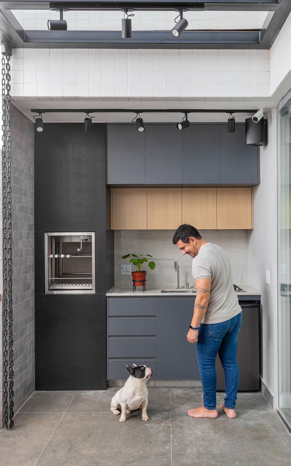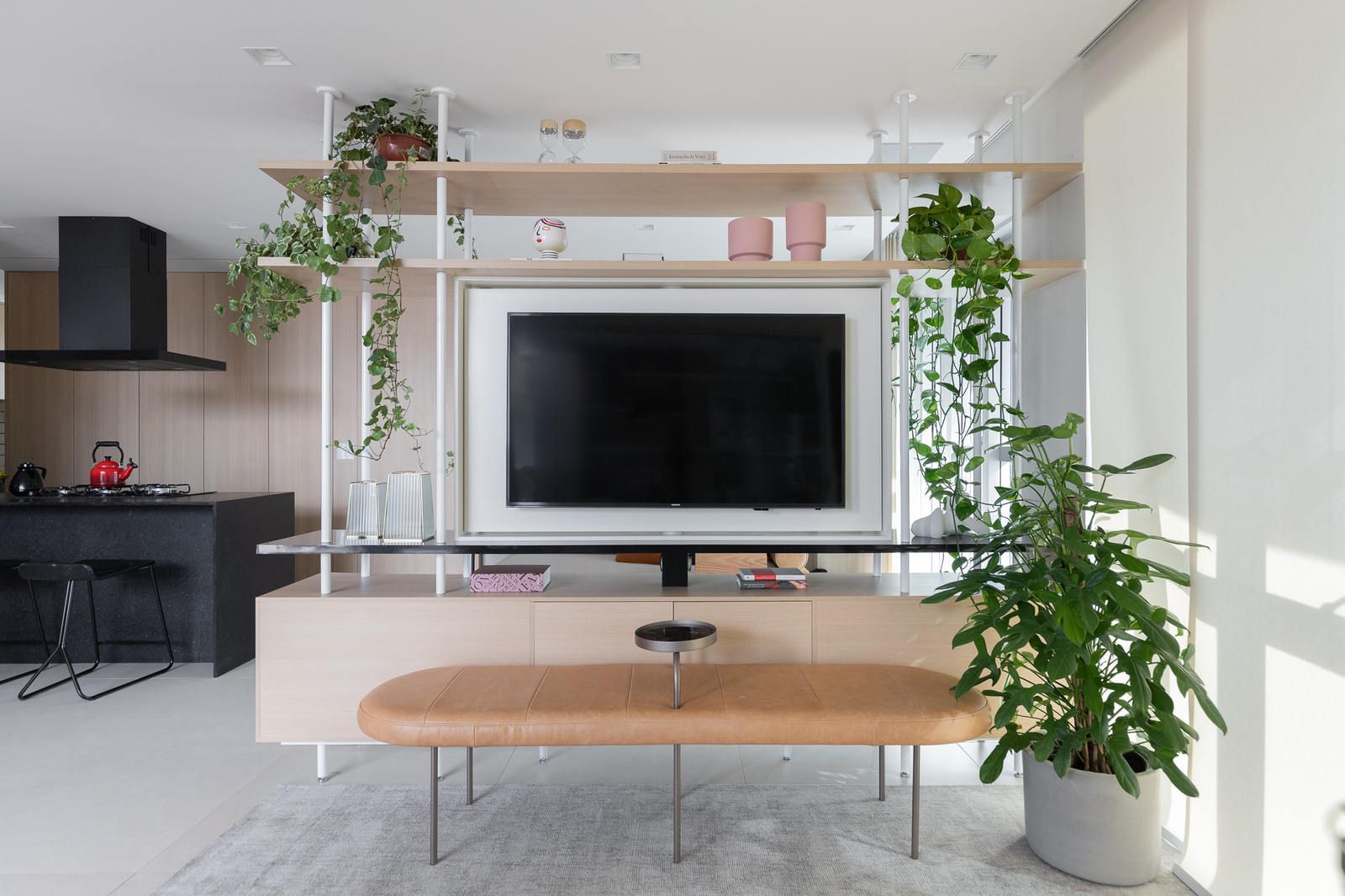 “A primeira demanda foi integrar totalmente a cozinha, a sala híbrida, o espaço de estar, de jantar e a televisão juntos. Removemos a parede que fazia o fechamento e os ambientes ganharam vida e amplitude.”