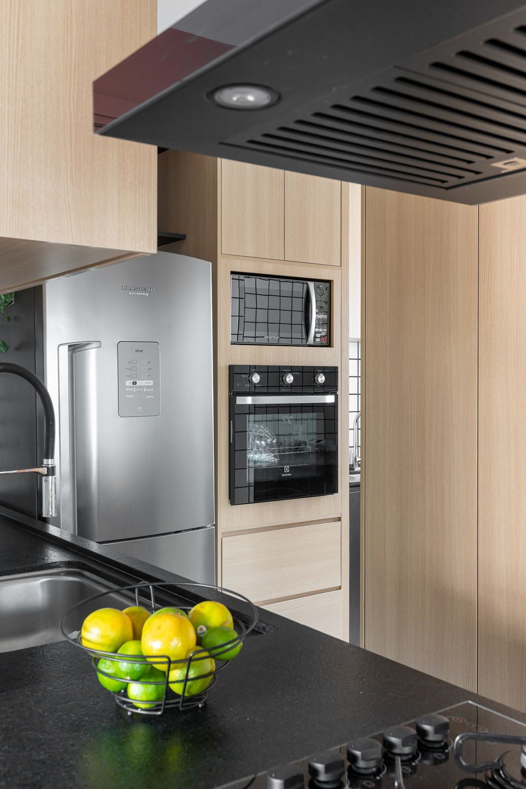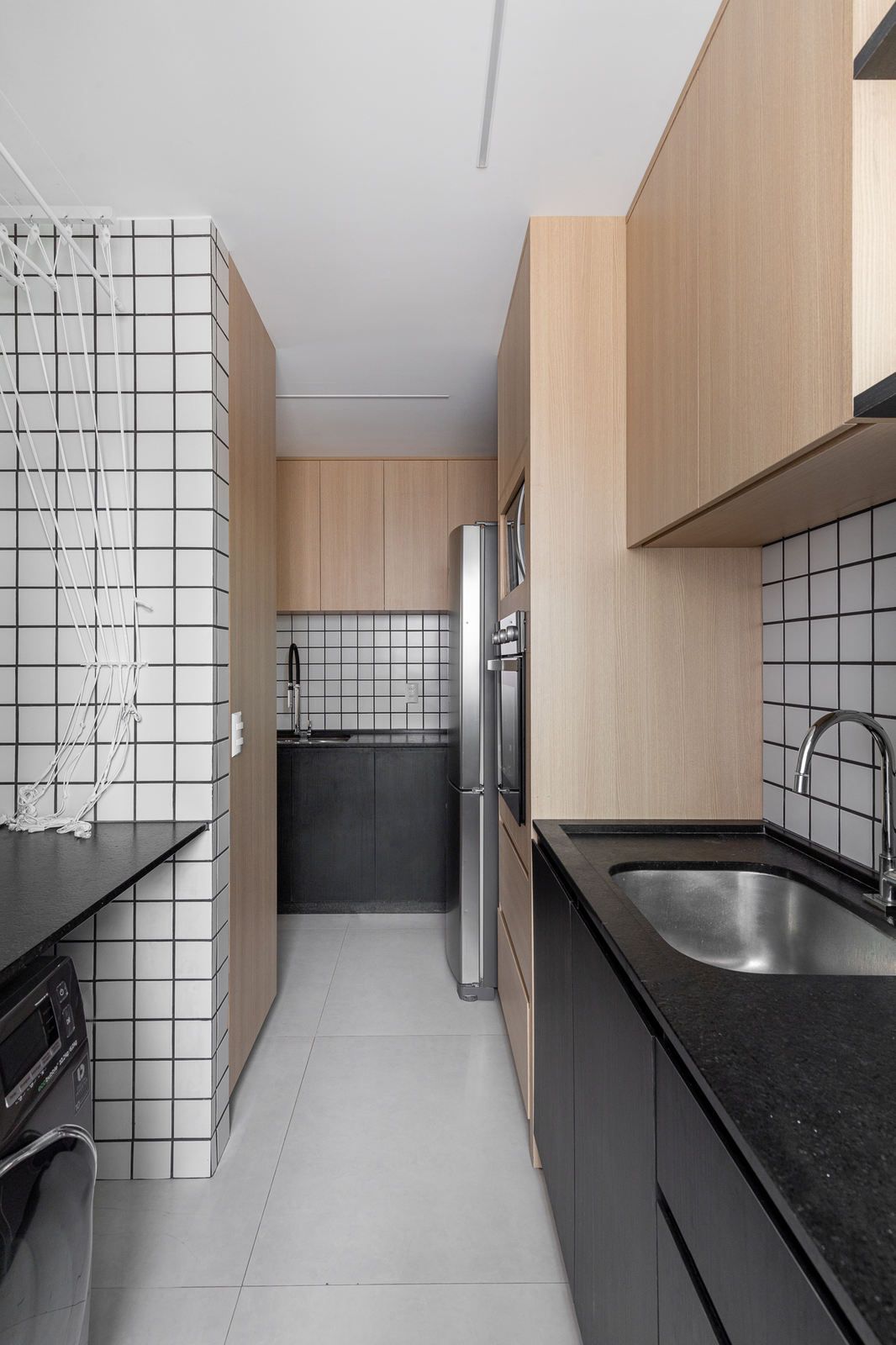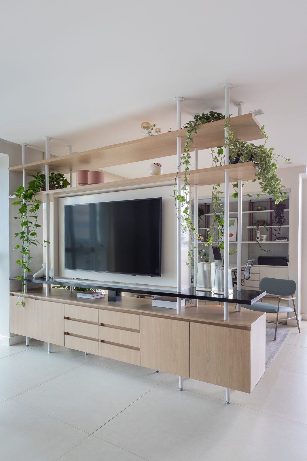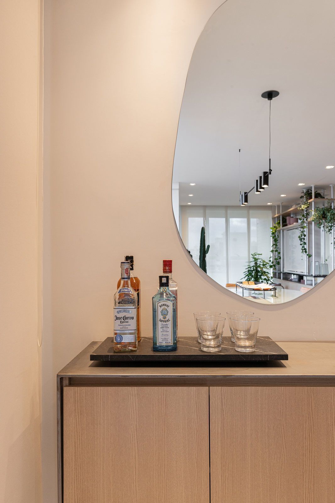 “A primeira demanda foi integrar totalmente a cozinha, a sala híbrida, o espaço de estar, de jantar e a televisão juntos. Removemos a parede que fazia o fechamento e os ambientes ganharam vida e amplitude.”