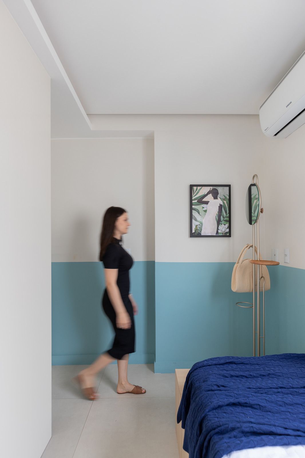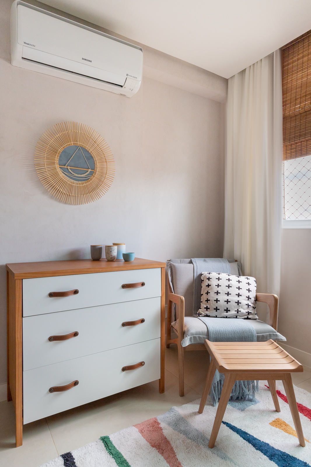 “O antigo quarto de hóspedes do apartamento tinha uma carinha de depósito, mas com a chegada do bebê era importante para os clientes ter um espaço confortável para receber a família. Por isso mudamos toda a vibe do espaço! A marcenaria antiga era escura e fazia o quarto parecer ainda menor, então propusemos a troca do módulo de armário do fundo encaixando uma cama com base de marcenaria para uma segunda cama de apoio.”