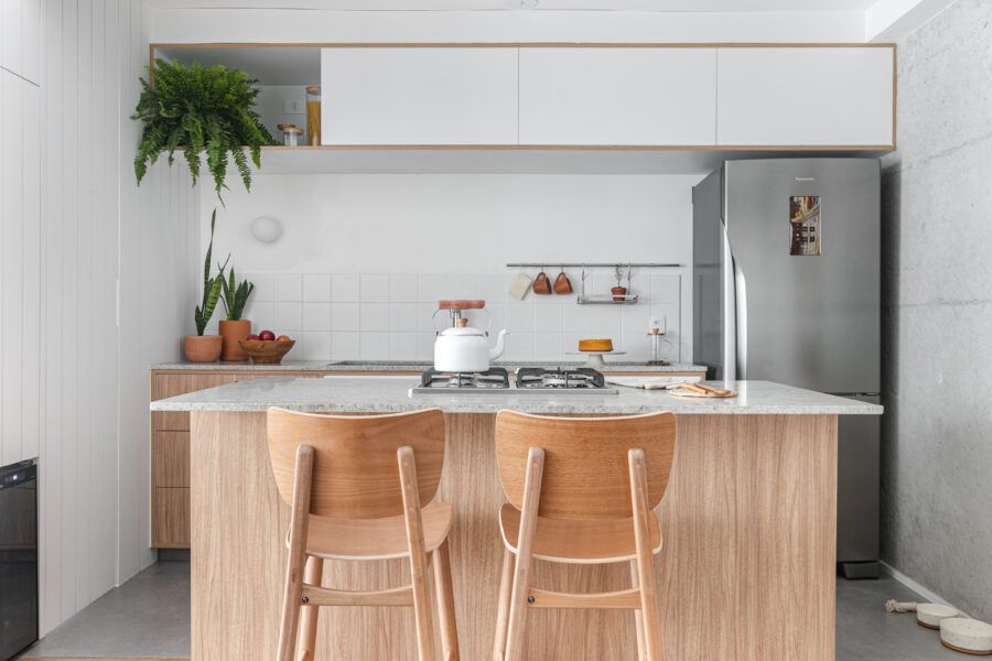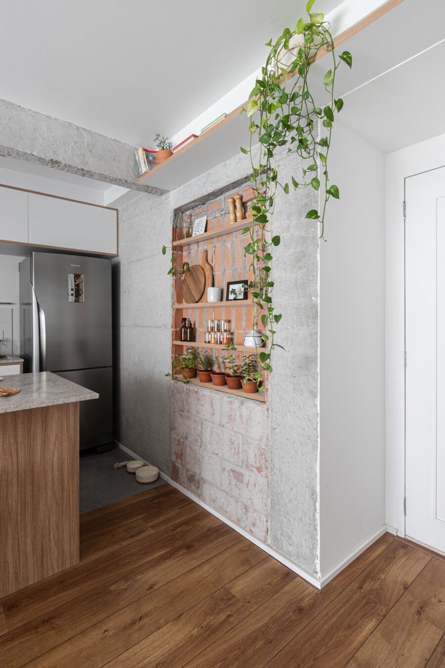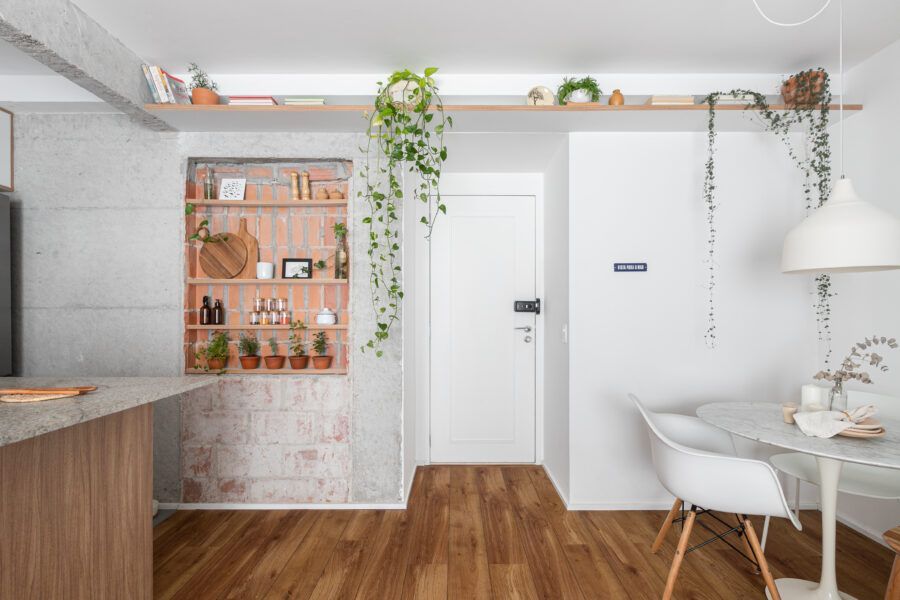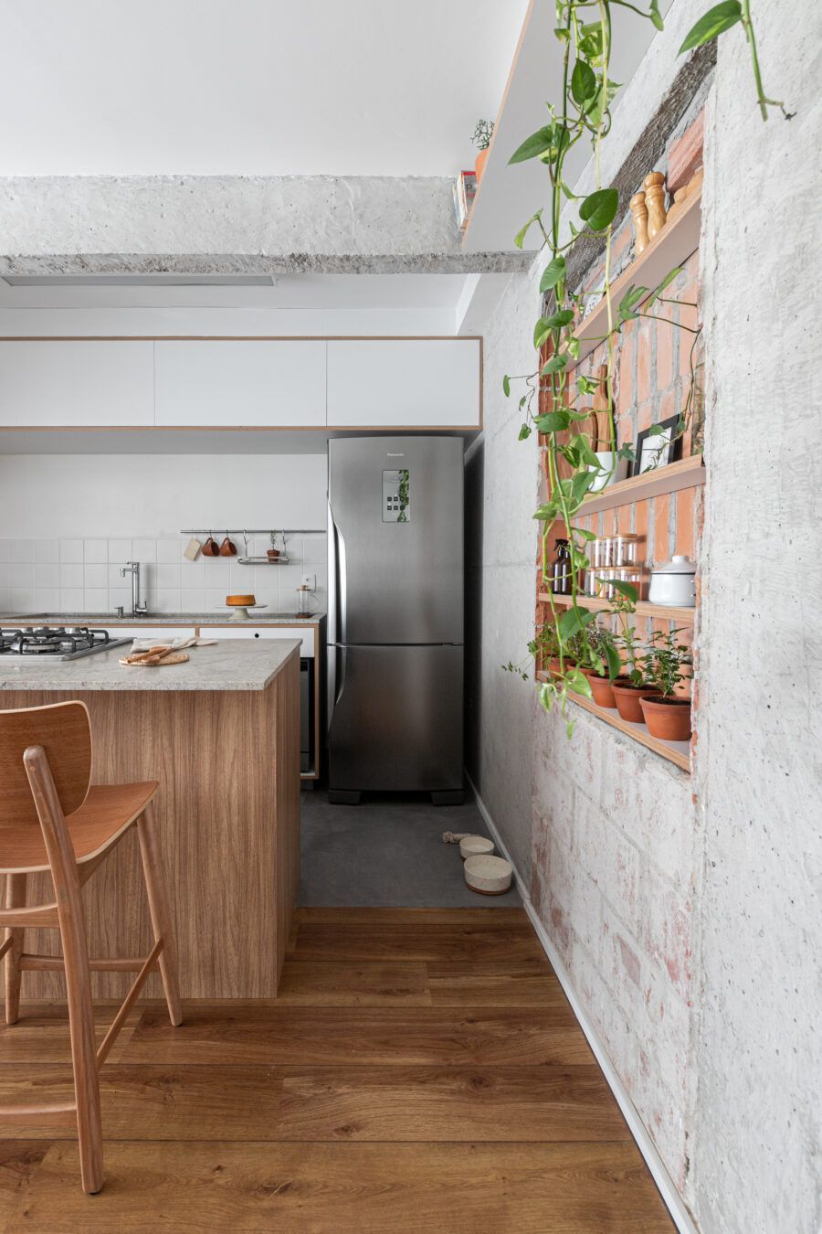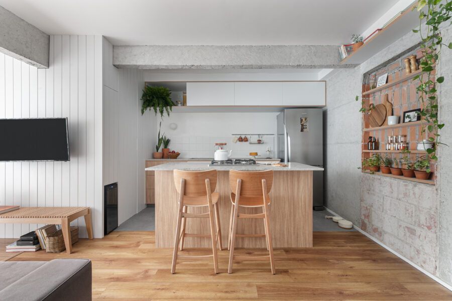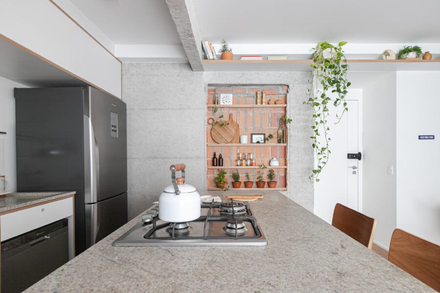 “Uma dica legal é tirar partido da estrutura existente. Nesse apartamento mantivemos uma base neutra para dar destaque e valorizar aquilo que já existia e que, na minha opinião, passa muito a sensação da casa, que é a parede de tijolo e a estrutura aparente. O nicho somado a ilha virou ponto de destaque e é a marca registrada desse apartamento.”