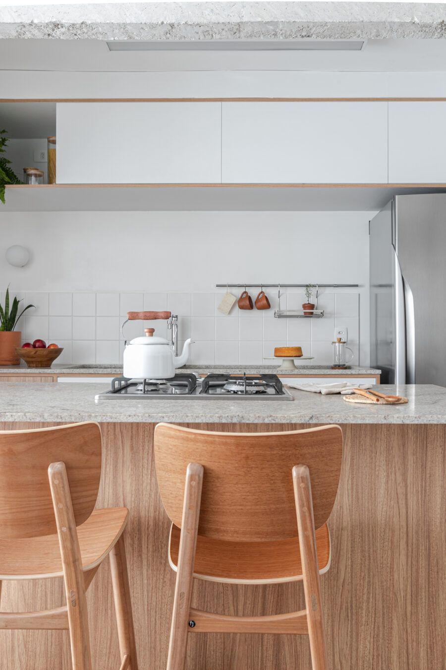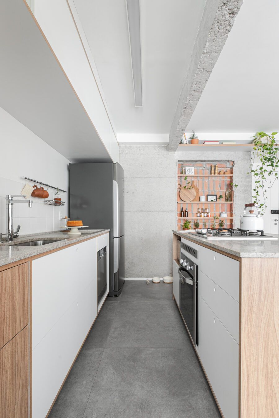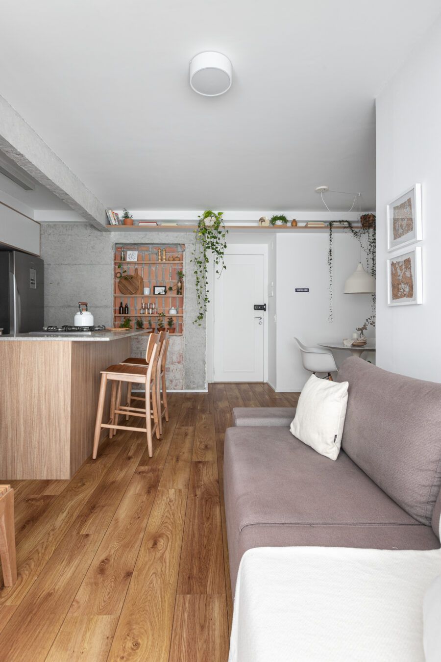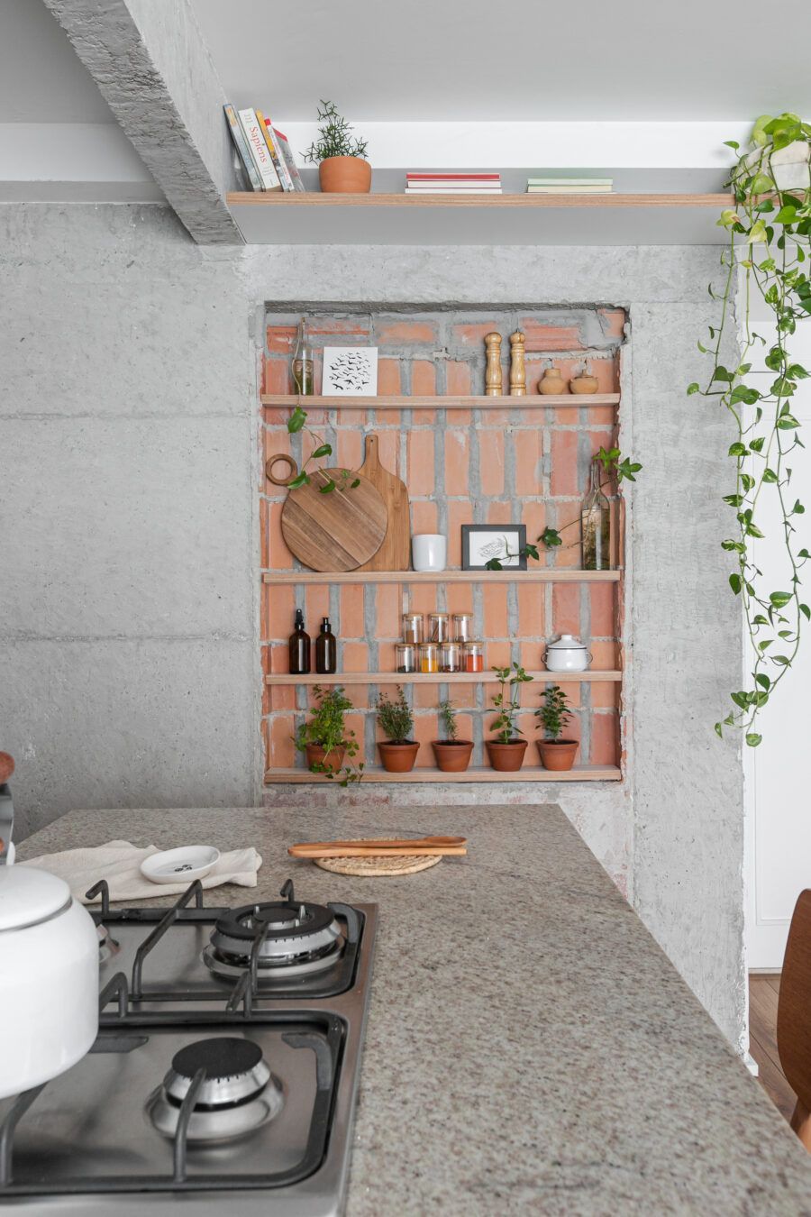 “Uma dica legal é tirar partido da estrutura existente. Nesse apartamento mantivemos uma base neutra para dar destaque e valorizar aquilo que já existia e que, na minha opinião, passa muito a sensação da casa, que é a parede de tijolo e a estrutura aparente. O nicho somado a ilha virou ponto de destaque e é a marca registrada desse apartamento.”