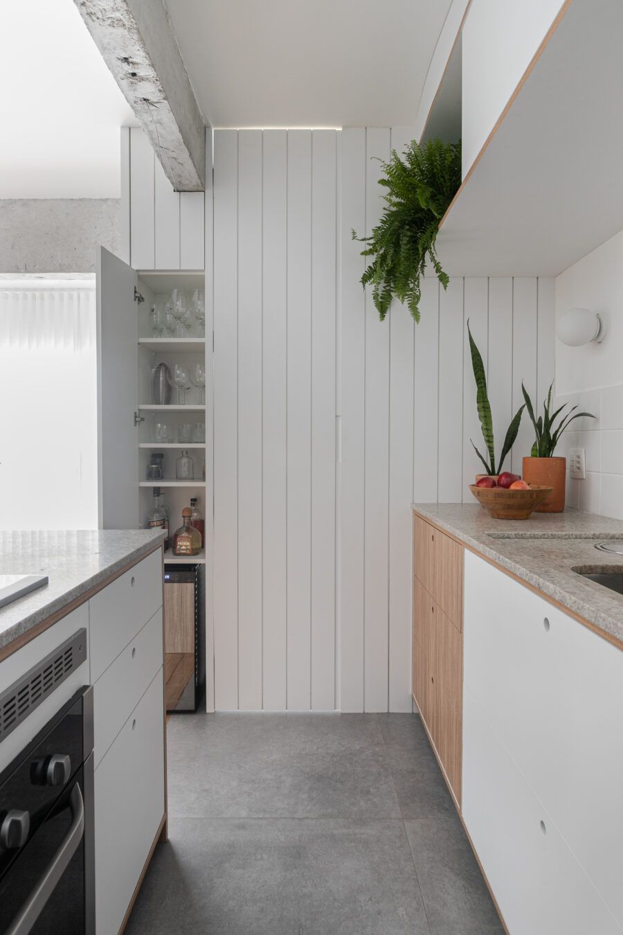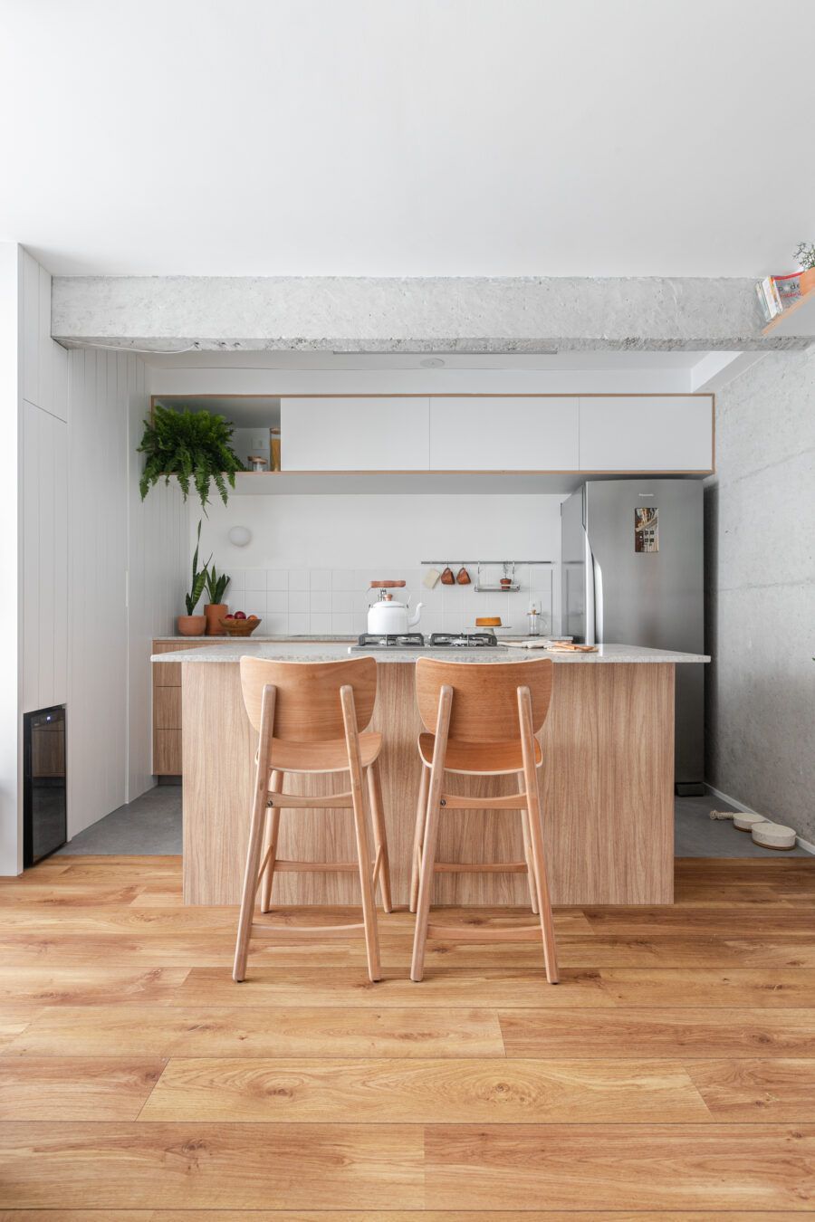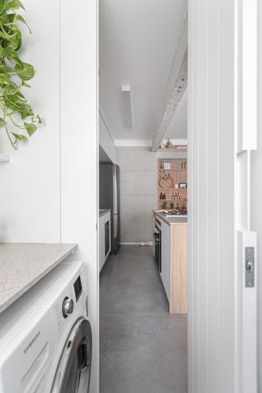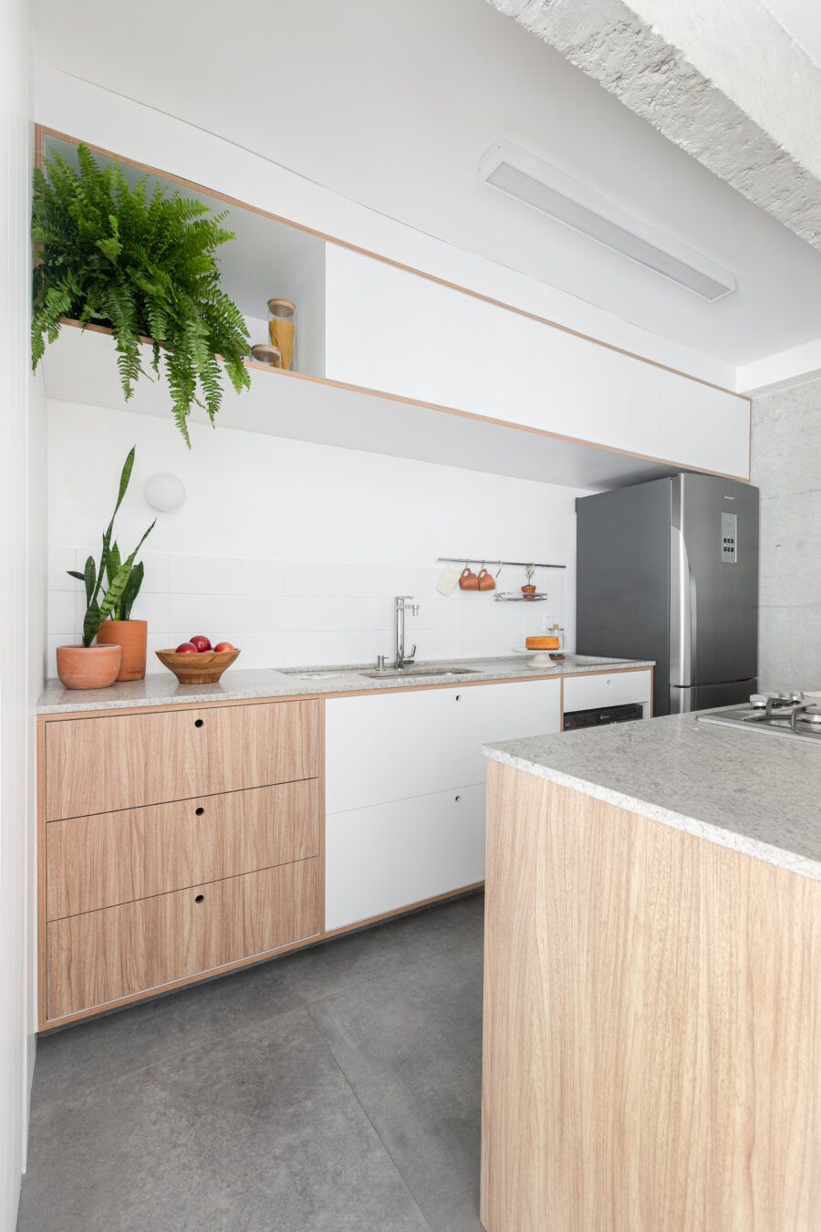 “Uma dica legal é tirar partido da estrutura existente. Nesse apartamento mantivemos uma base neutra para dar destaque e valorizar aquilo que já existia e que, na minha opinião, passa muito a sensação da casa, que é a parede de tijolo e a estrutura aparente. O nicho somado a ilha virou ponto de destaque e é a marca registrada desse apartamento.”