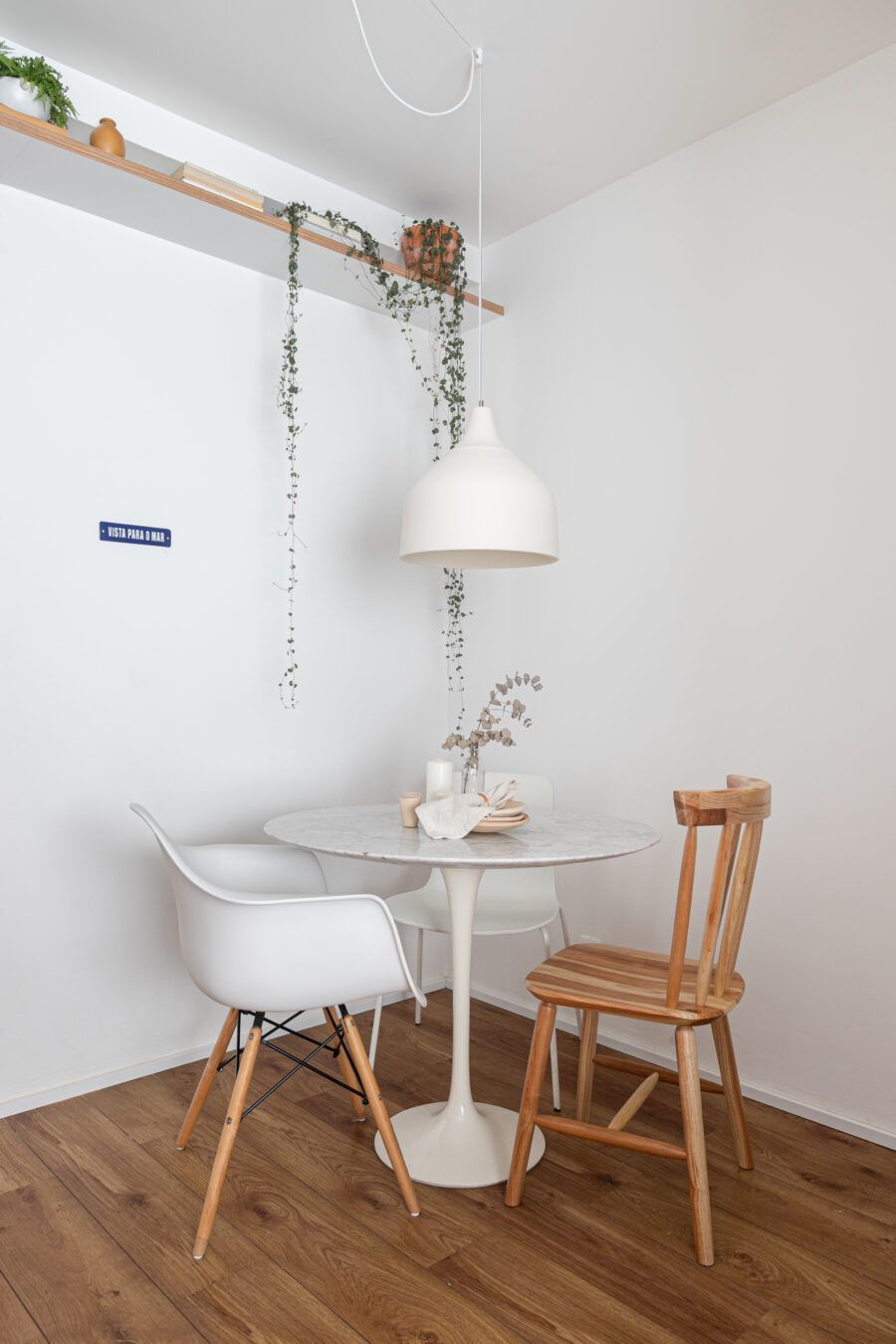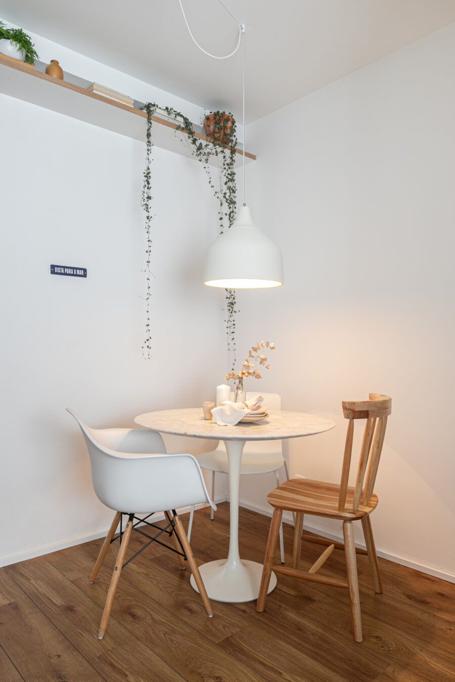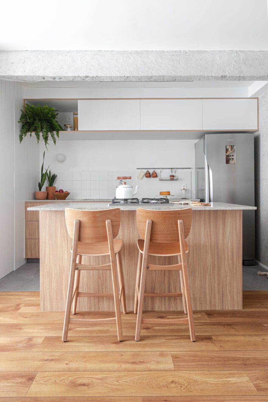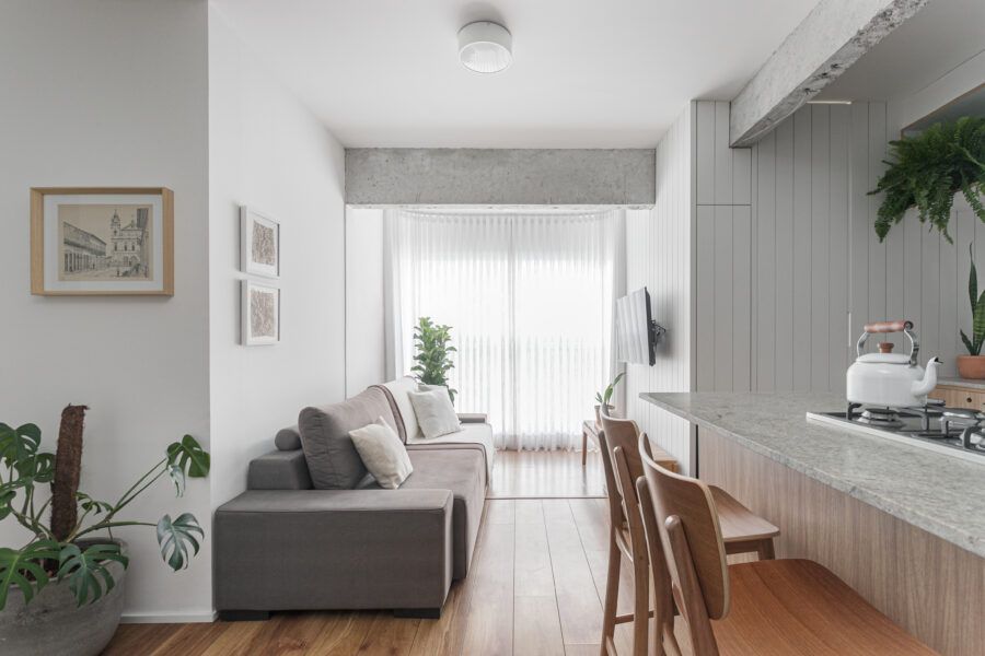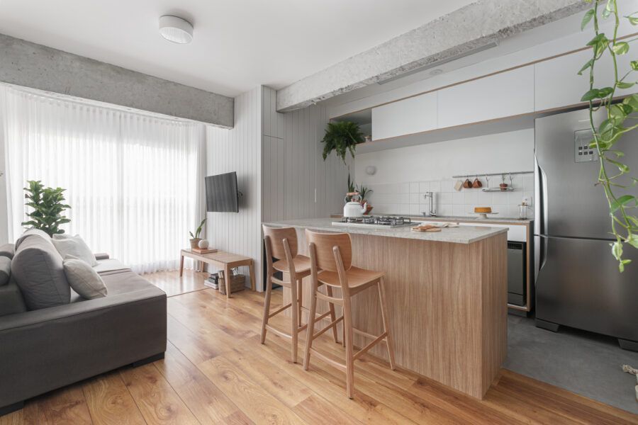 “O apartamento dos nossos sonhos era um apartamento com carinha de casa, que fosse leve e trouxesse a memória e sensação do interior, que foi onde eu e o Maurício crescemos. A nossa ideia para esse apartamento era poder passar mais tempo juntos quando estivéssemos aqui, por isso a necessidade de integrar os espaços. Para estarmos juntos independente do que a gente estivesse fazendo, vendo tv, cozinhando, lavando roupa, etc.”