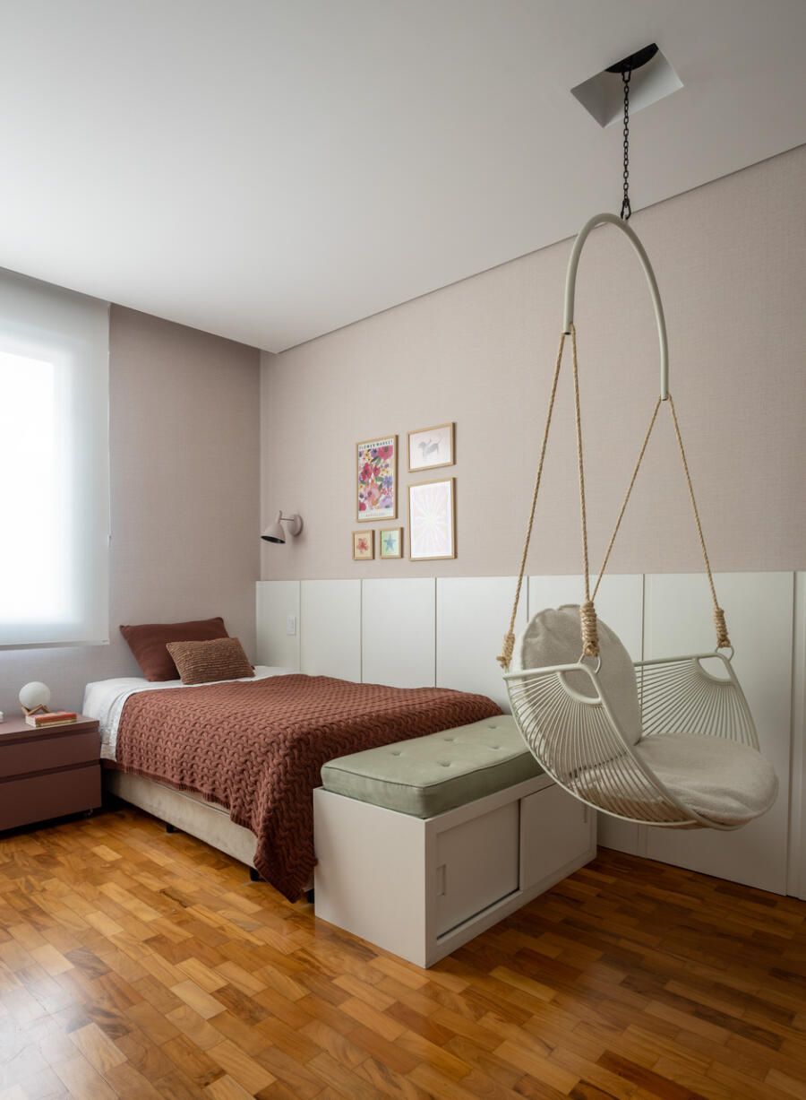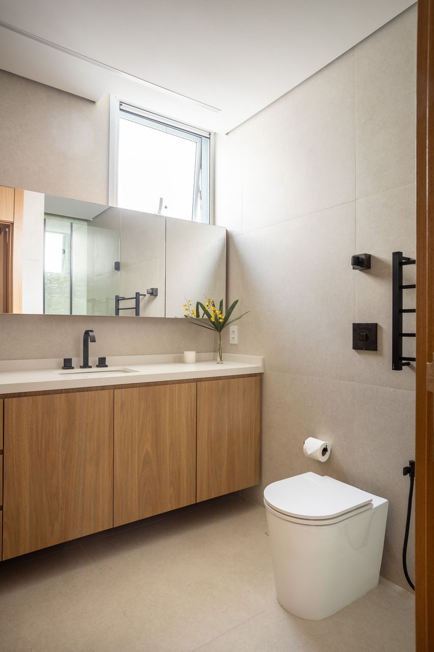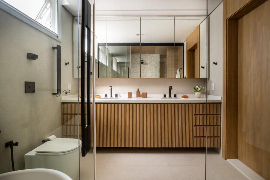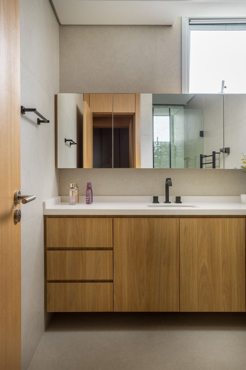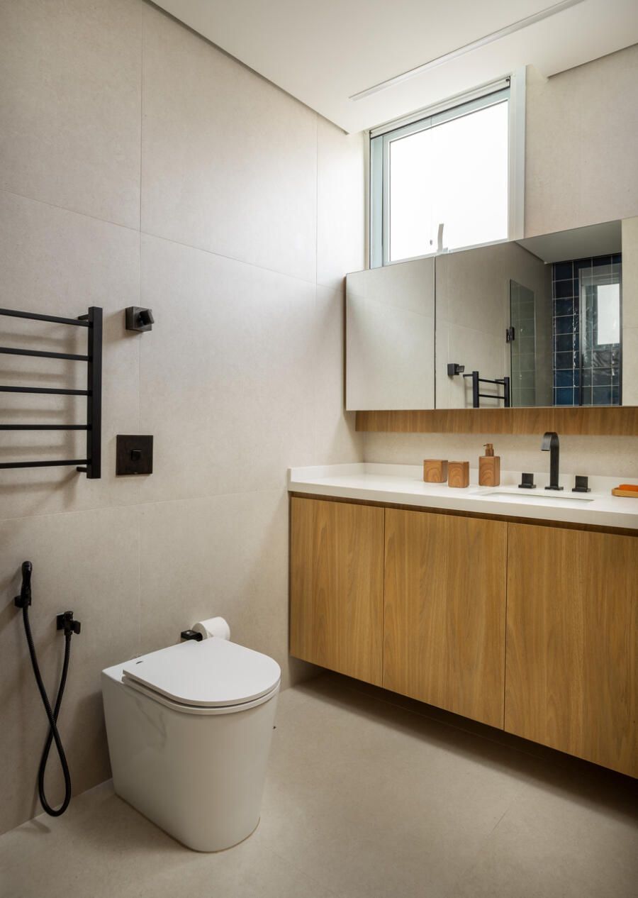 A cozinha combina porcelanatos texturizados e marcenaria clara, iluminada por um delicado jogo de luz indireta. O cobogó separa a área de serviço sem impedir a entrada do sol, trazendo leveza e funcionalidade. Nos quartos, todos suítes, cada detalhe foi pensado para traduzir a identidade dos moradores: o balanço no quarto da filha, os toques jovens e funcionais no quarto do filho, e no quarto do casal, portas de armário em palha e um closet que não existia antes. O ponto alto, porém, é o banheiro do casal, agora transformado em um santuário de bem-estar.
