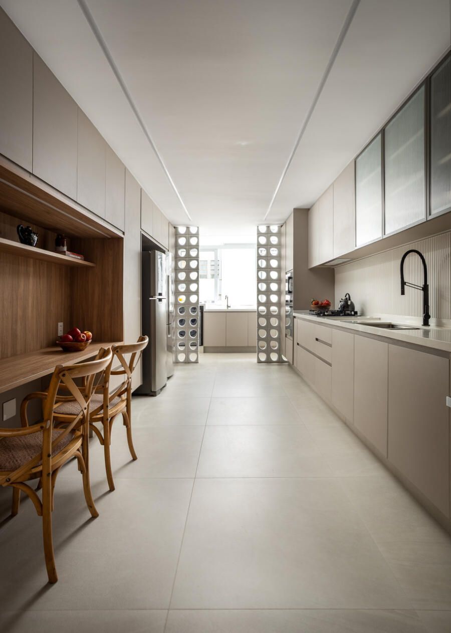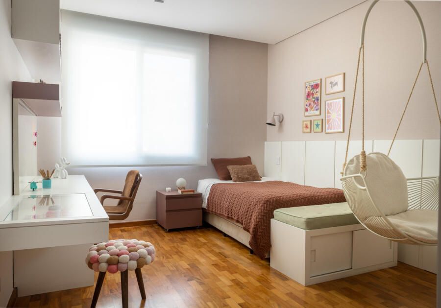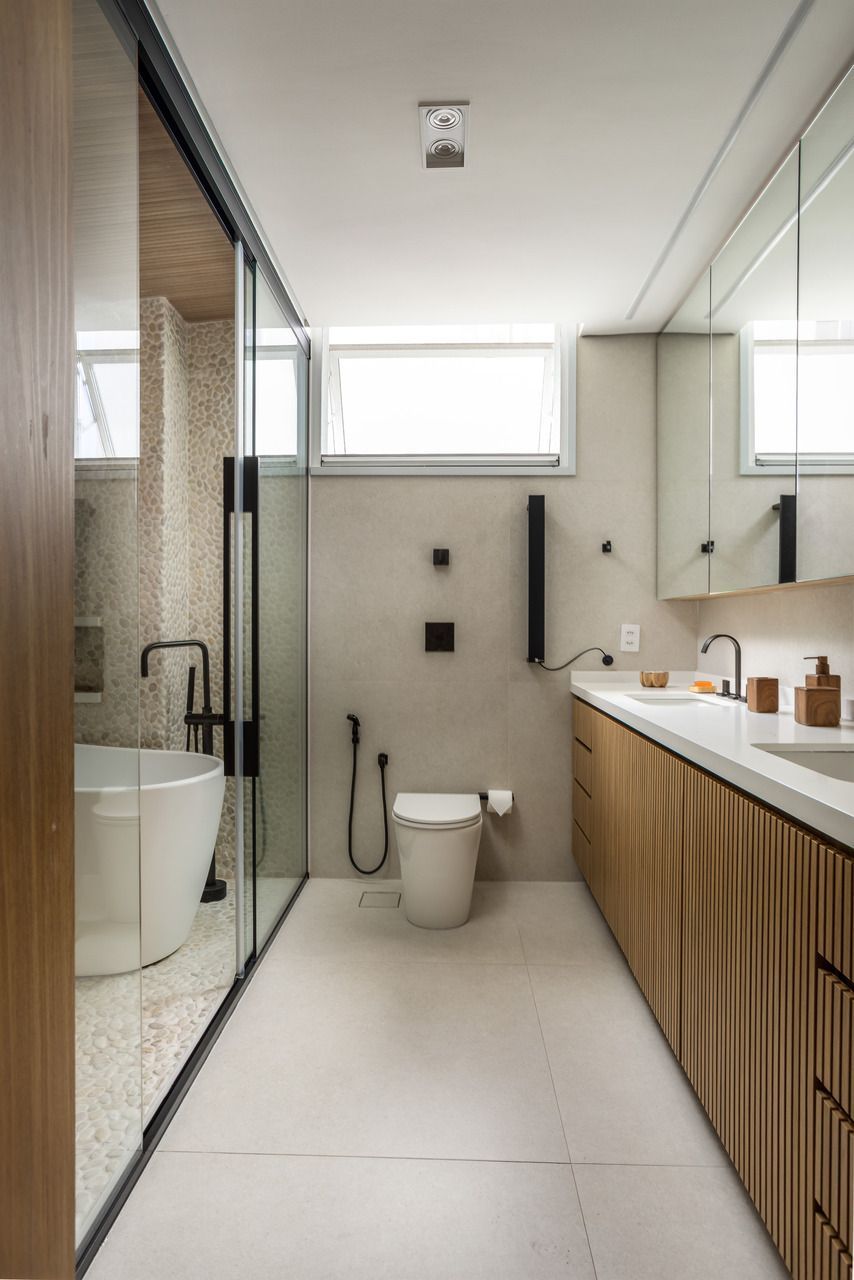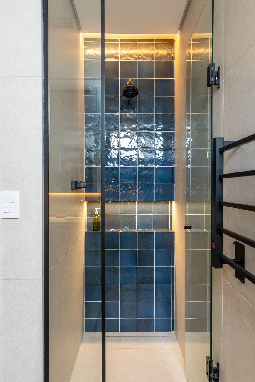 A cozinha combina porcelanatos texturizados e marcenaria clara, iluminada por um delicado jogo de luz indireta. O cobogó separa a área de serviço sem impedir a entrada do sol, trazendo leveza e funcionalidade. Nos quartos, todos suítes, cada detalhe foi pensado para traduzir a identidade dos moradores: o balanço no quarto da filha, os toques jovens e funcionais no quarto do filho, e no quarto do casal, portas de armário em palha e um closet que não existia antes. O ponto alto, porém, é o banheiro do casal, agora transformado em um santuário de bem-estar.