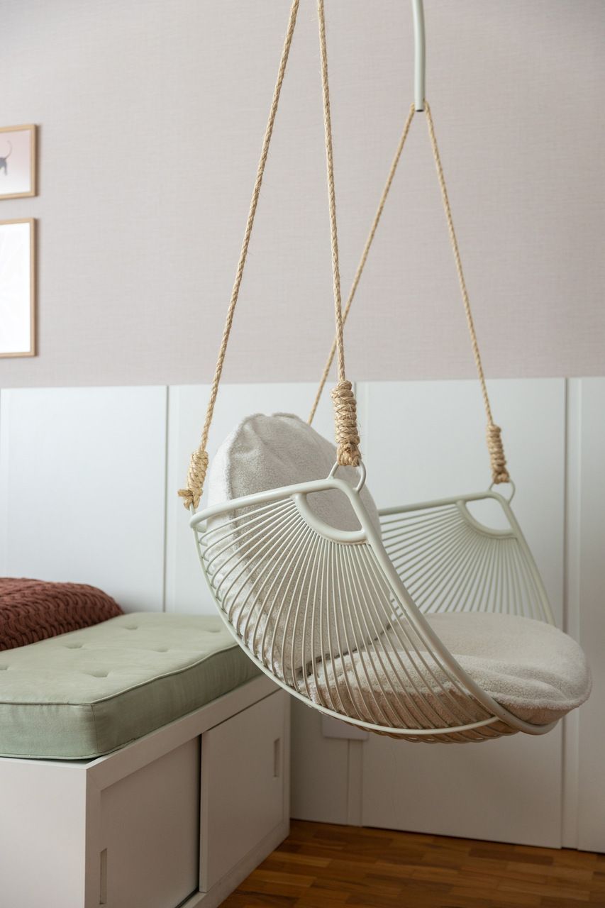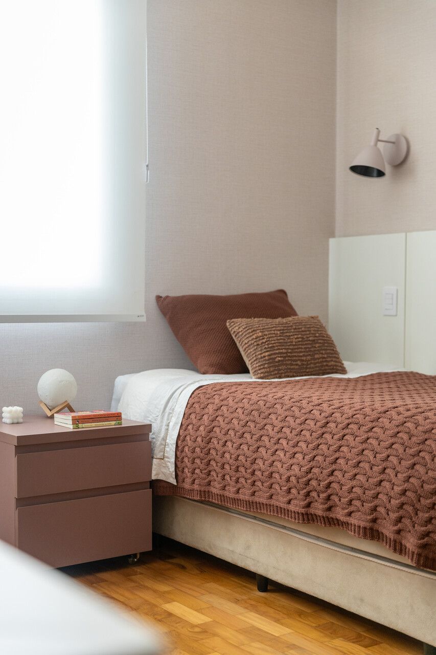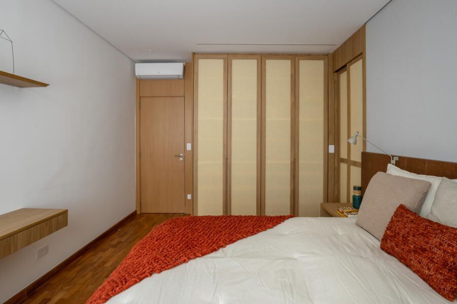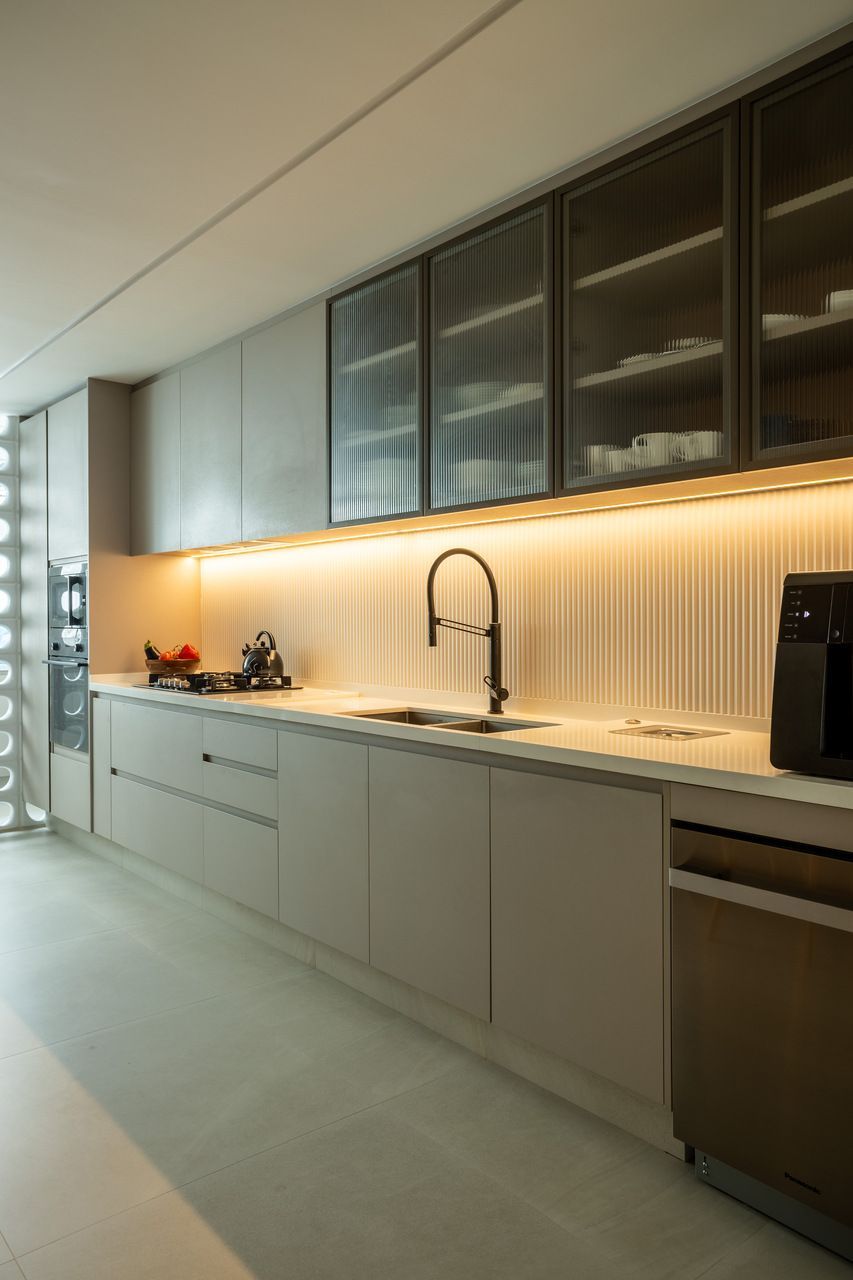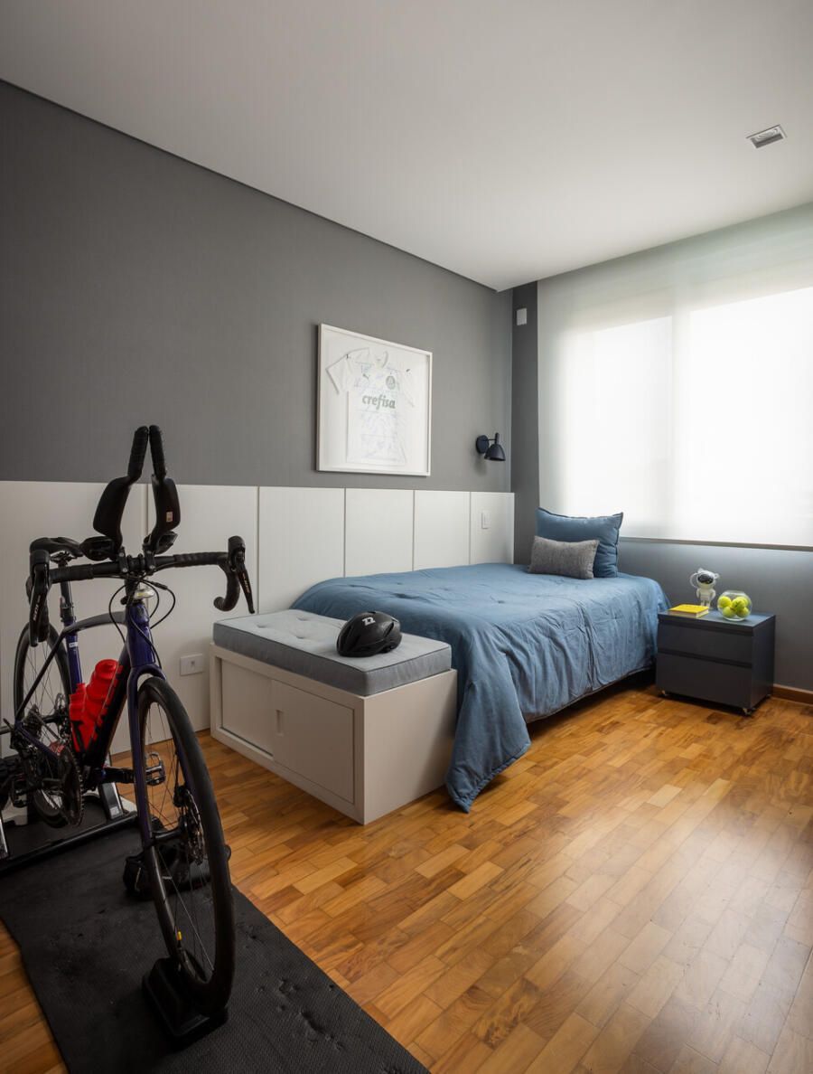 A cozinha combina porcelanatos texturizados e marcenaria clara, iluminada por um delicado jogo de luz indireta. O cobogó separa a área de serviço sem impedir a entrada do sol, trazendo leveza e funcionalidade. Nos quartos, todos suítes, cada detalhe foi pensado para traduzir a identidade dos moradores: o balanço no quarto da filha, os toques jovens e funcionais no quarto do filho, e no quarto do casal, portas de armário em palha e um closet que não existia antes. O ponto alto, porém, é o banheiro do casal, agora transformado em um santuário de bem-estar.