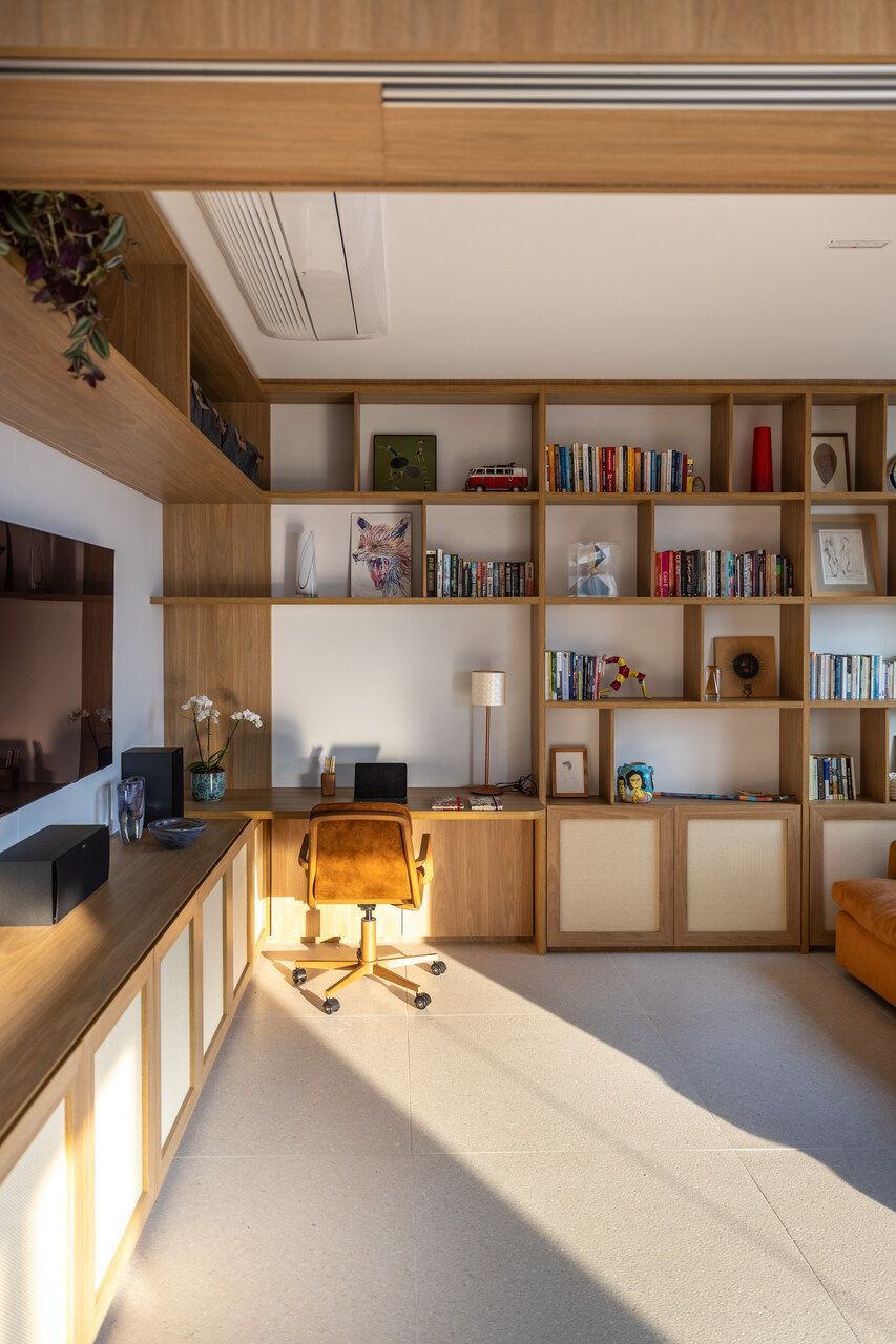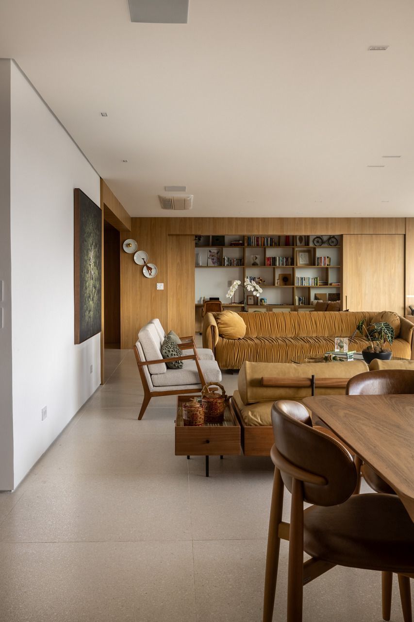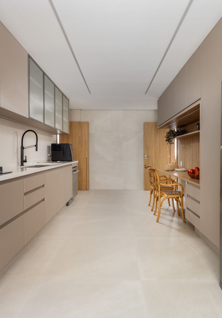 Na área social, hall, sala, jantar e terraço se fundem em continuidade fluida, unidos pelo piso cuja aparência mineral lembra pequenos seixos multicoloridos. A marcenaria desenhada sob medida, a iluminação embutida e os detalhes em madeira no teto criam acolhimento e elegância. No antigo bar, hoje há um espaço generoso com bancada, cooktop e bancos, pensado para reunir amigos e criar memórias.