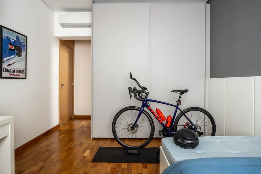 As surpresas de um edifício antigo se revelaram durante a obra, como prumadas, vigas e estruturas inesperadas. Cada obstáculo, no entanto, deu origem a soluções criativas. Uma viga invertida na sala, por exemplo, se transformou em bancada elegante, revestida com peças da LePRI. E, escondido sob um carpete antigo, o piso de madeira original foi descoberto como um tesouro. Restaurado, trouxe calor e história aos quartos da família.
