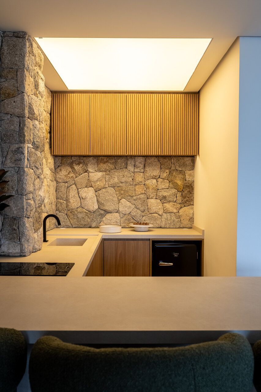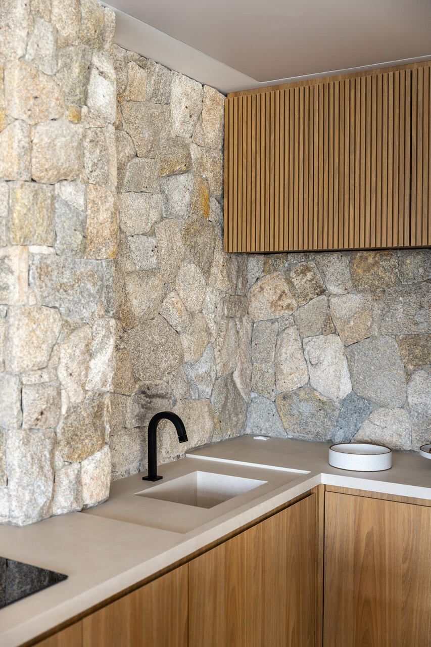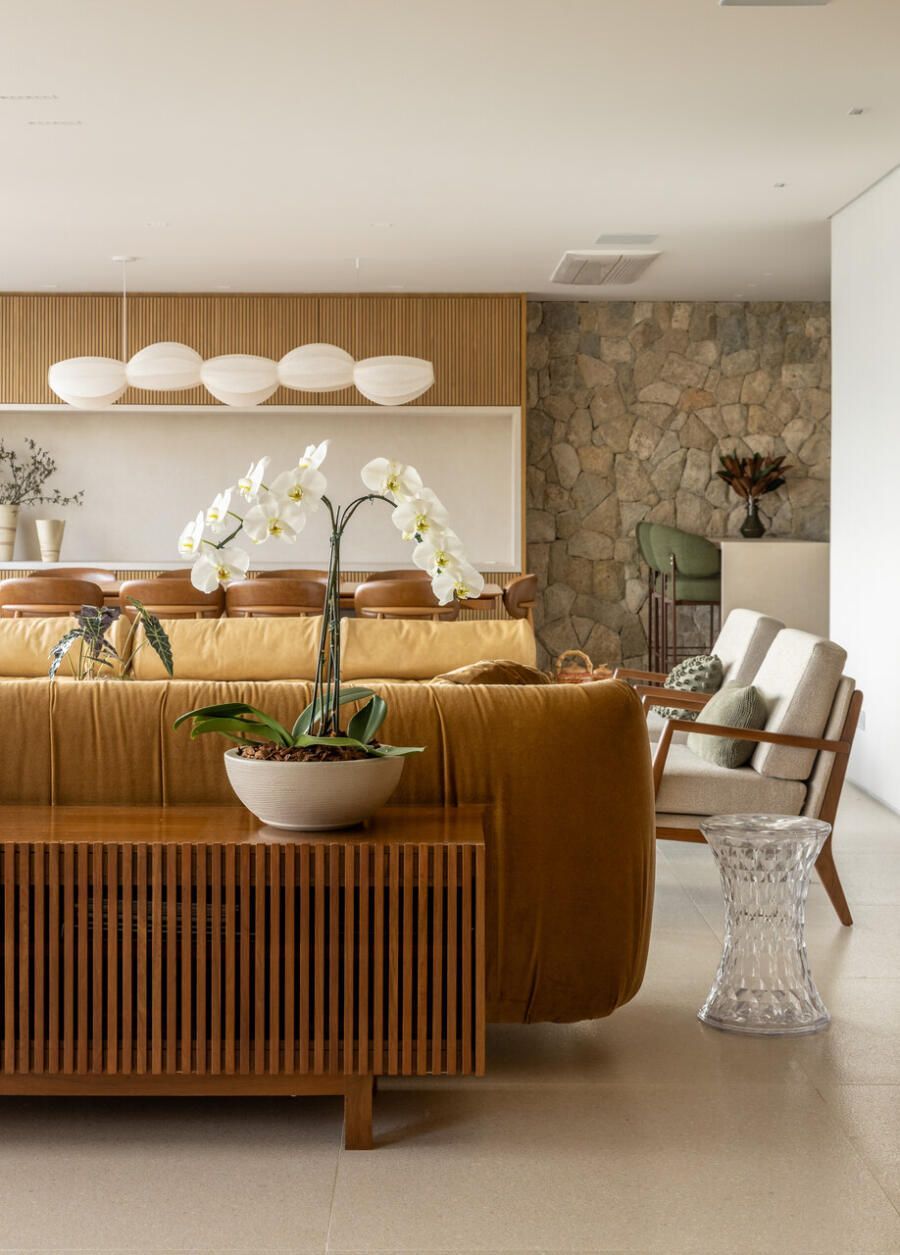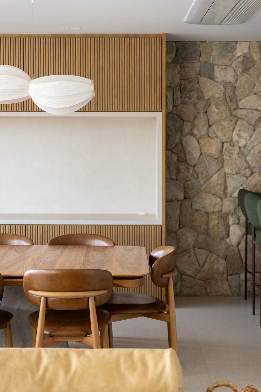 A reforma foi integral, desde a iluminação à marcenaria, passando pela integração dos ambientes e pela escolha de materiais que evocam a natureza. Os pedidos eram claros: luz, aconchego, cores suaves e texturas naturais. Na sala, a parede de pedra moledo trouxe imponência e calor, um equilíbrio entre o rústico e o sofisticado. No banheiro do casal, o desejo antigo por seixos foi além: o espaço se transformou em um verdadeiro refúgio, com sauna, ducha, banheira e iluminação delicada, como um spa particular onde o tempo desacelera.