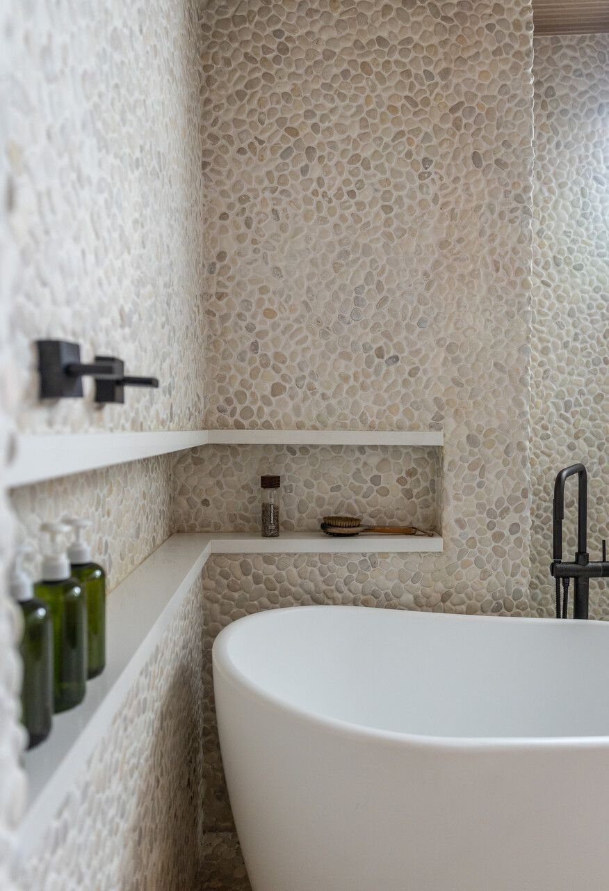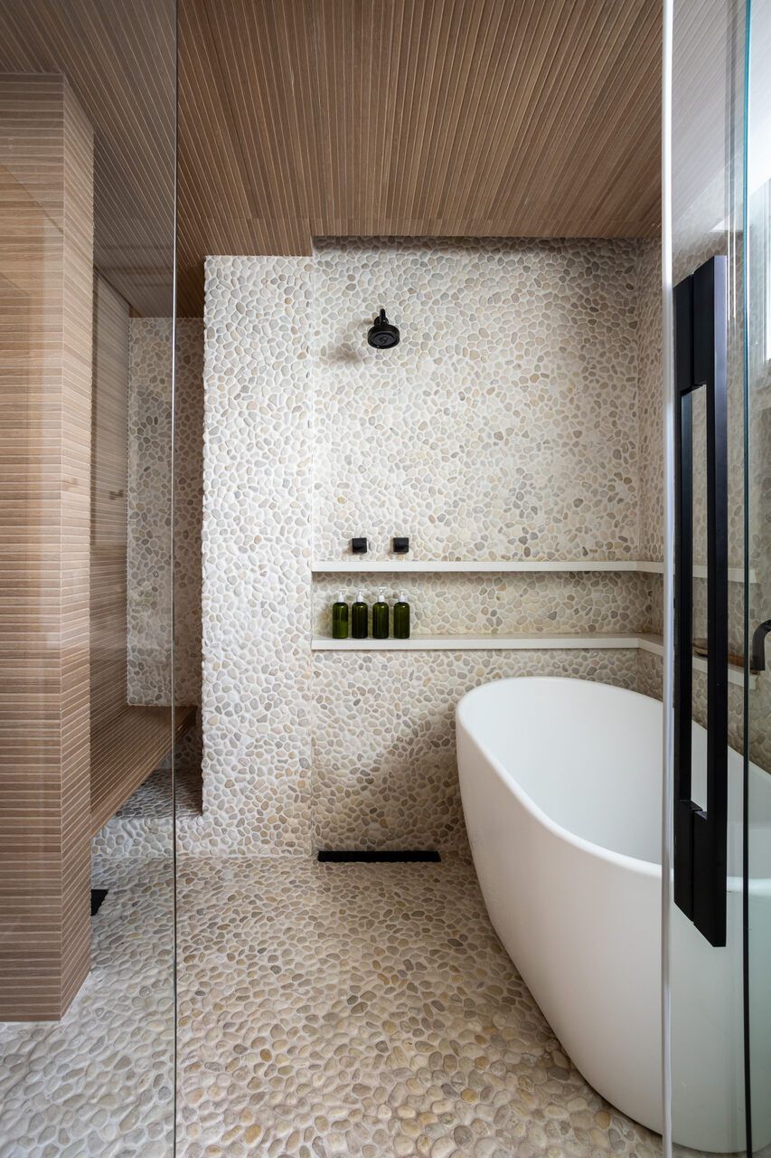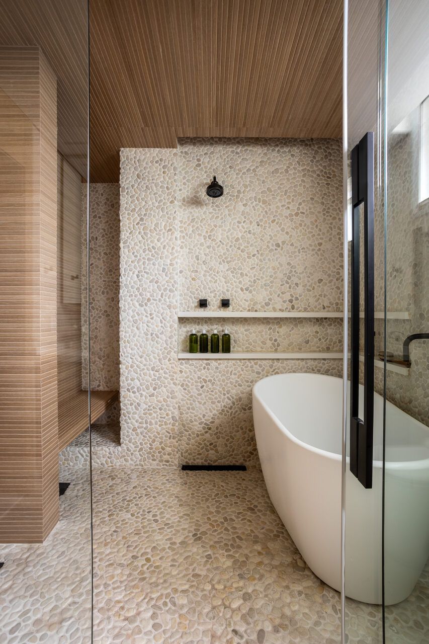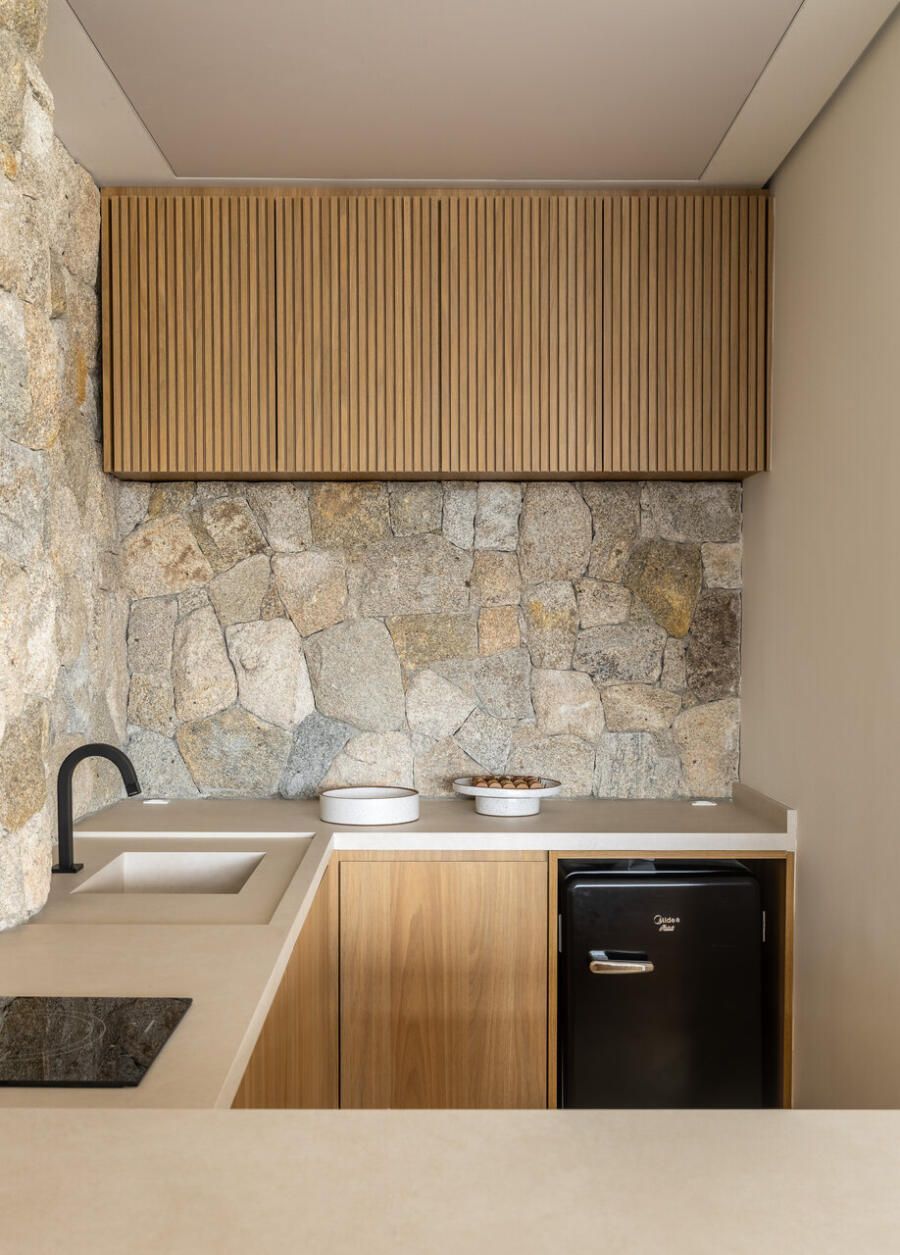 A reforma foi integral, desde a iluminação à marcenaria, passando pela integração dos ambientes e pela escolha de materiais que evocam a natureza. Os pedidos eram claros: luz, aconchego, cores suaves e texturas naturais. Na sala, a parede de pedra moledo trouxe imponência e calor, um equilíbrio entre o rústico e o sofisticado. No banheiro do casal, o desejo antigo por seixos foi além: o espaço se transformou em um verdadeiro refúgio, com sauna, ducha, banheira e iluminação delicada, como um spa particular onde o tempo desacelera.
