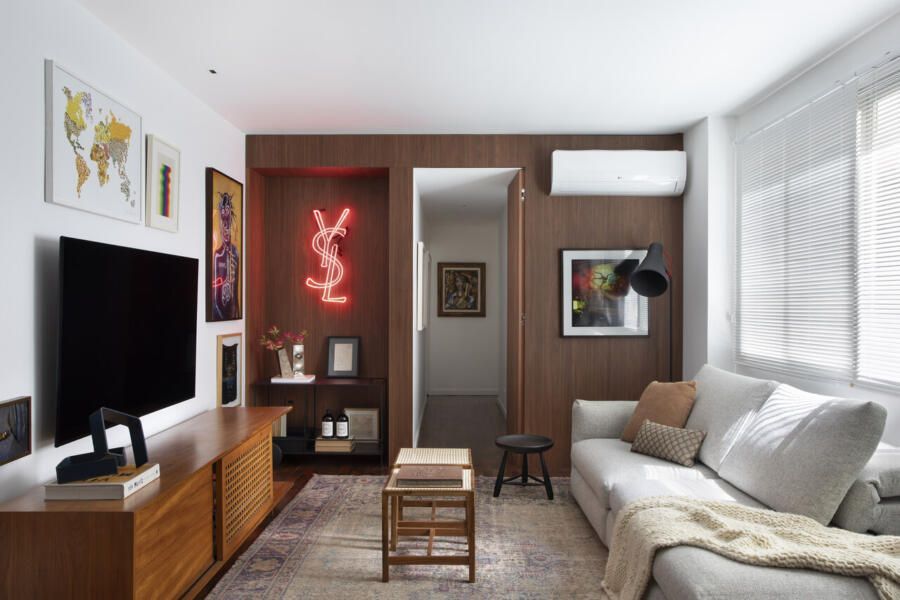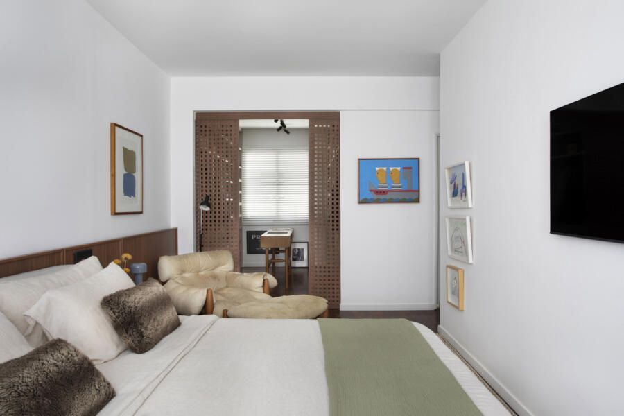 Segundo os moradores, o sonho sempre foi viver em um imóvel maior na mesma região de “Copanema”, como carinhosamente chamam o bairro. A busca levou a um prédio dos anos 1960 que ele admirava há tempos, com jardineiras na fachada e uma vista privilegiada. Quando descobriu que uma unidade estava à venda, não pensou duas vezes. Acompanhado de Fabiano, fez uma visita ao imóvel e, mesmo com os ambientes ainda compartimentados e o piso antigo, enxergaram o potencial: janelas grandes, vista para as copas das árvores e uma planta flexível.