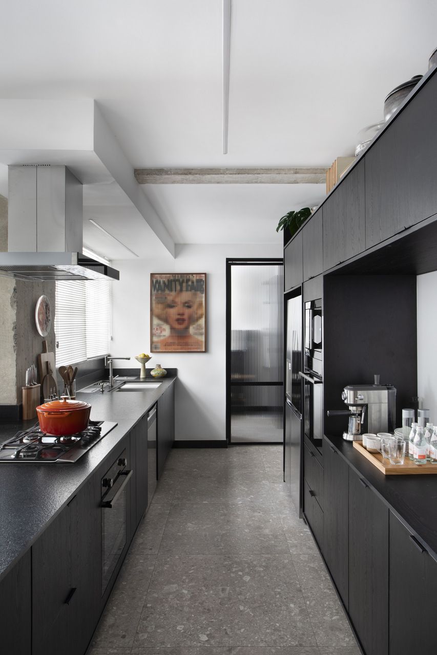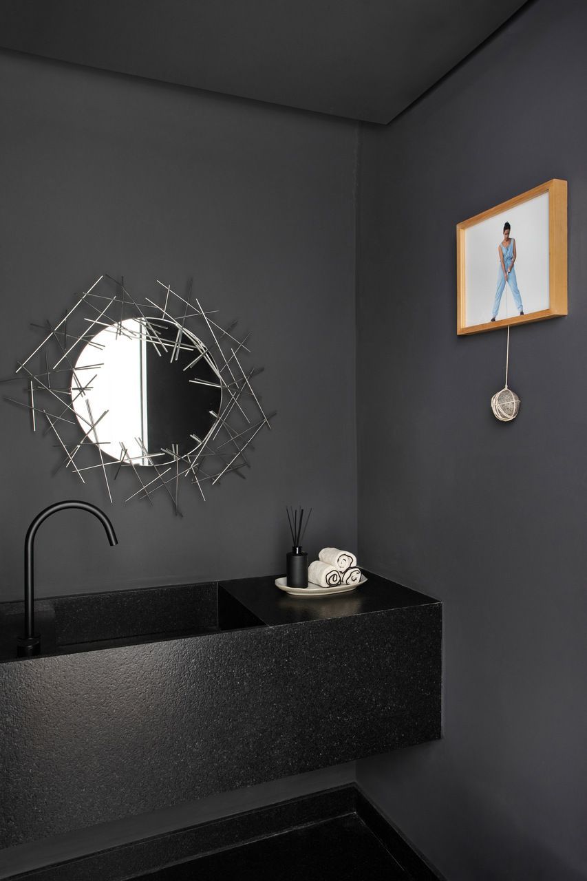 As paredes brancas foram escolhidas justamente para valorizar os quadros. Na cozinha, o destaque ficou por conta dos armários de MDF com acabamento ebanizado e bancadas de granito preto escovado, enquanto o piso em porcelanato cinza completou o visual elegante e prático.