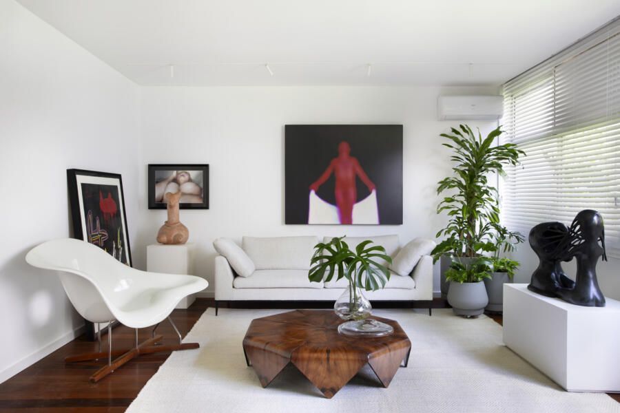 O conceito do projeto girou em torno de mais de 100 obras de arte dos moradores, a ideia era criar uma “tela em branco”, com espaços abertos, paredes claras e ambientes integrados, permitindo que cada obra ganhasse destaque.