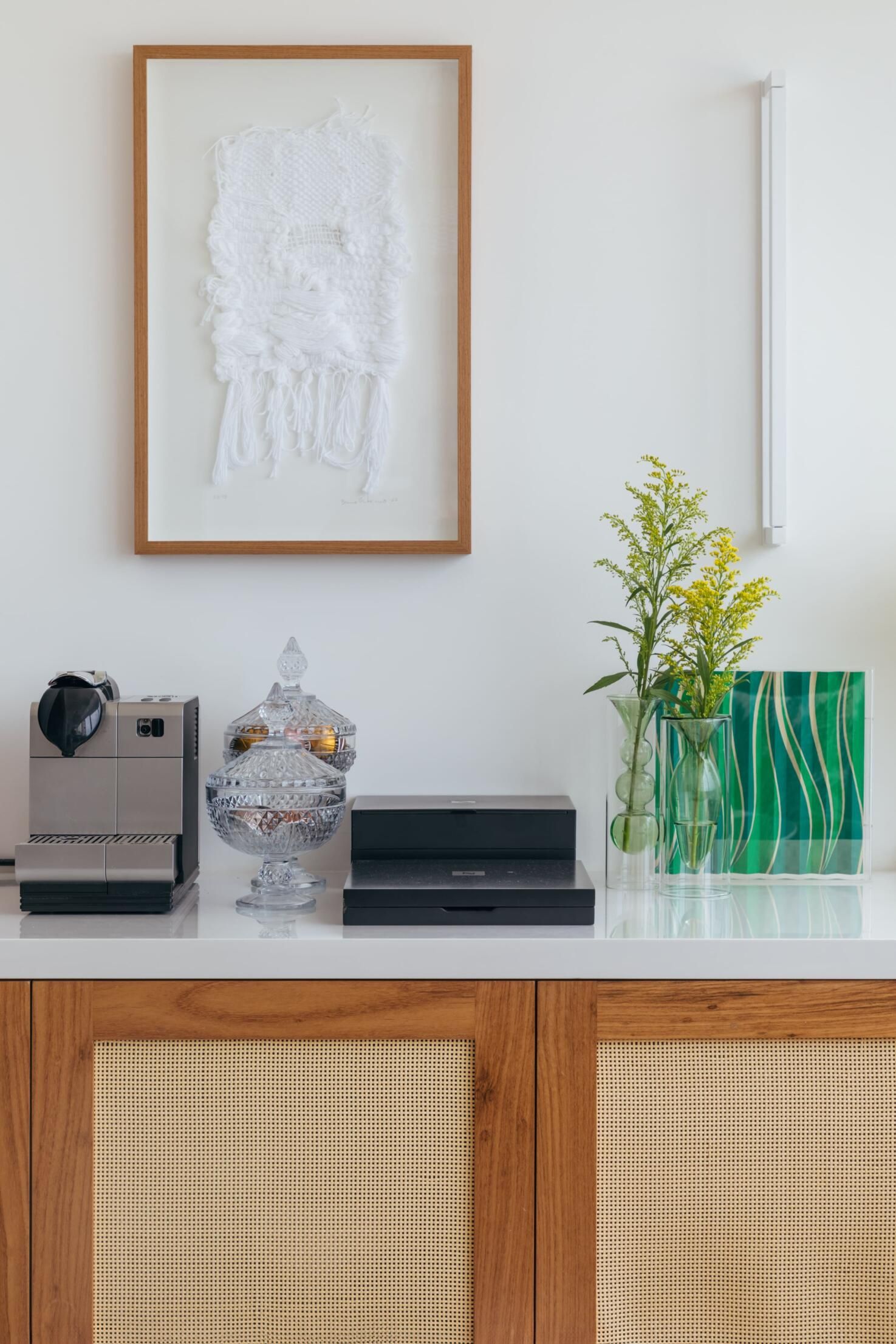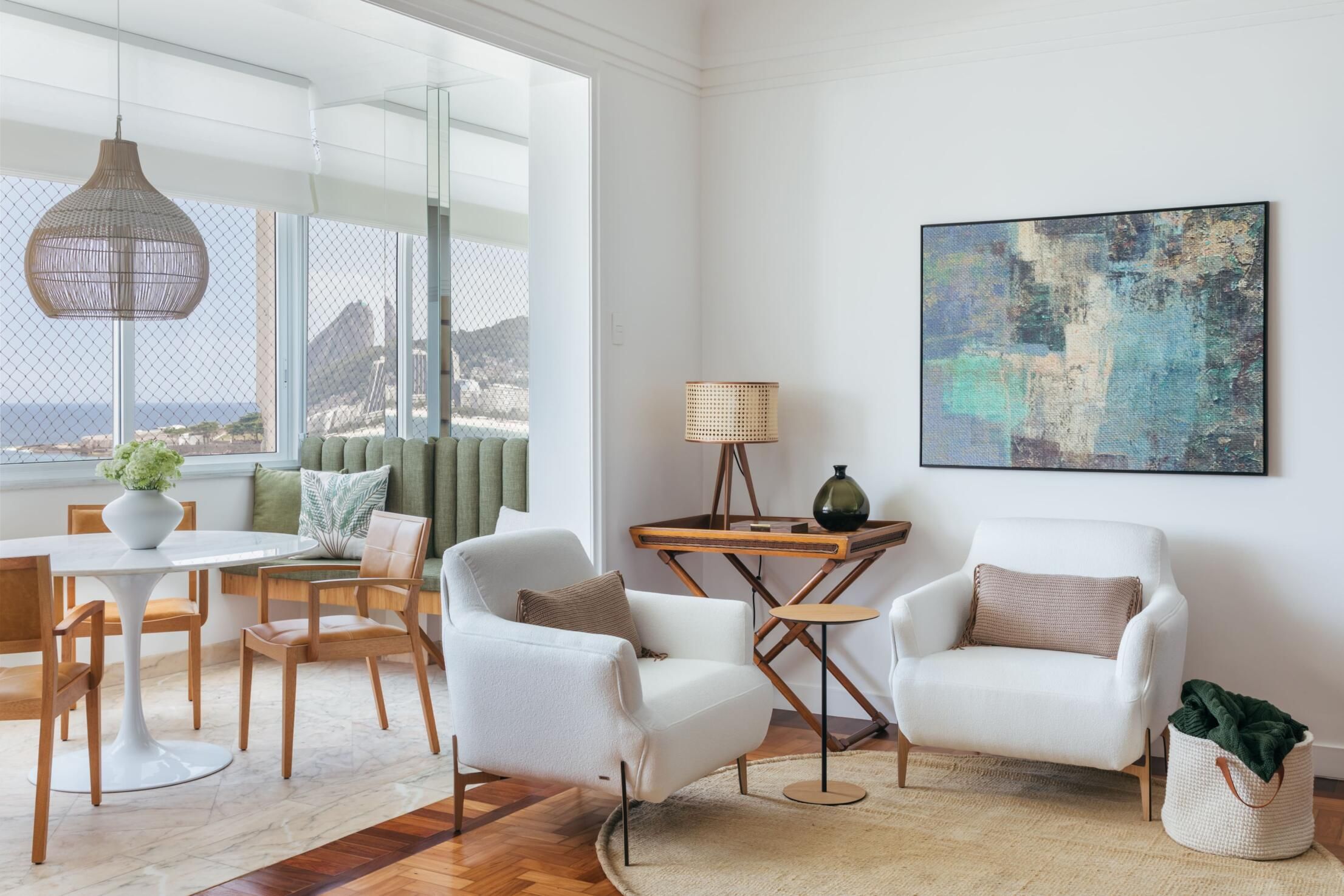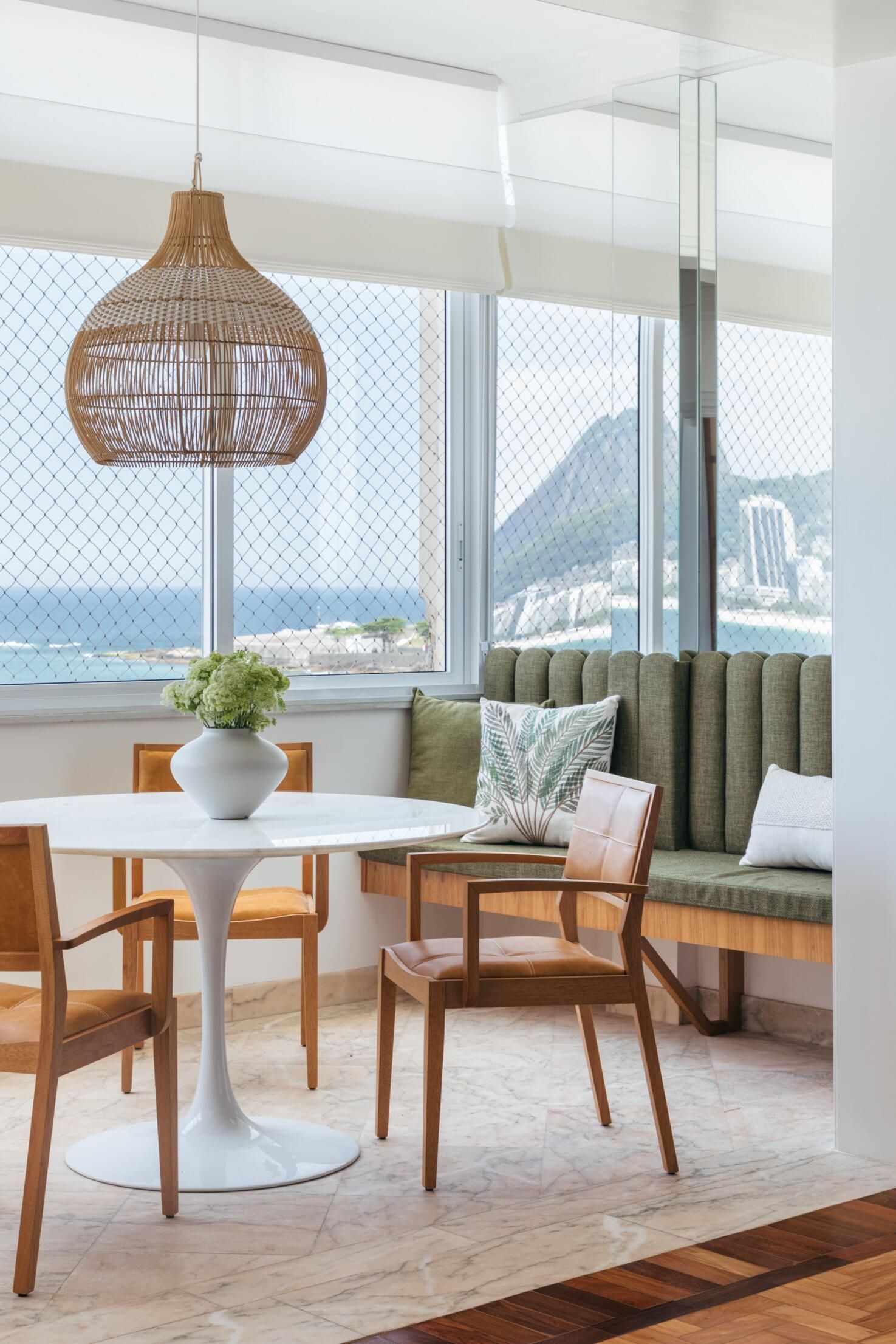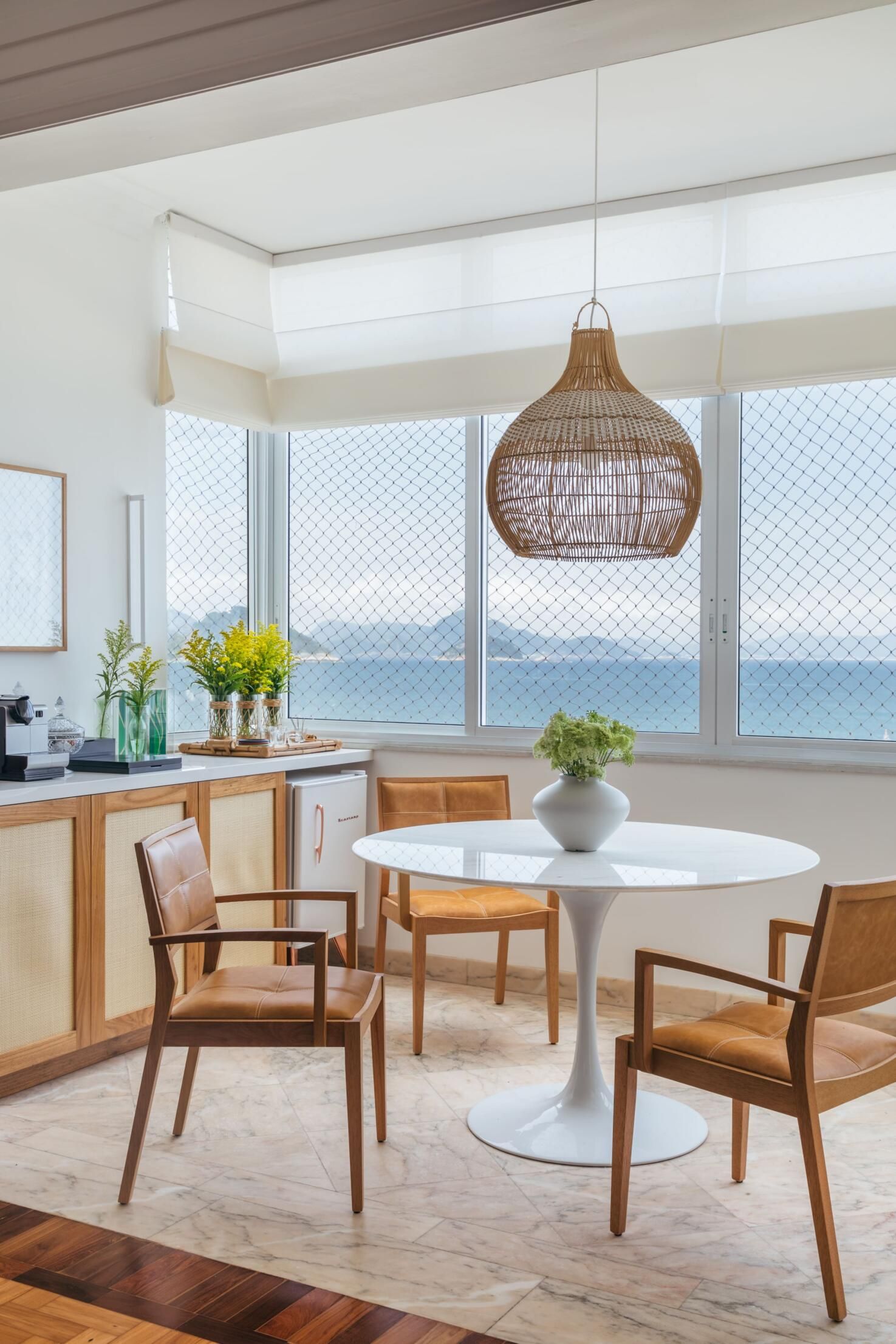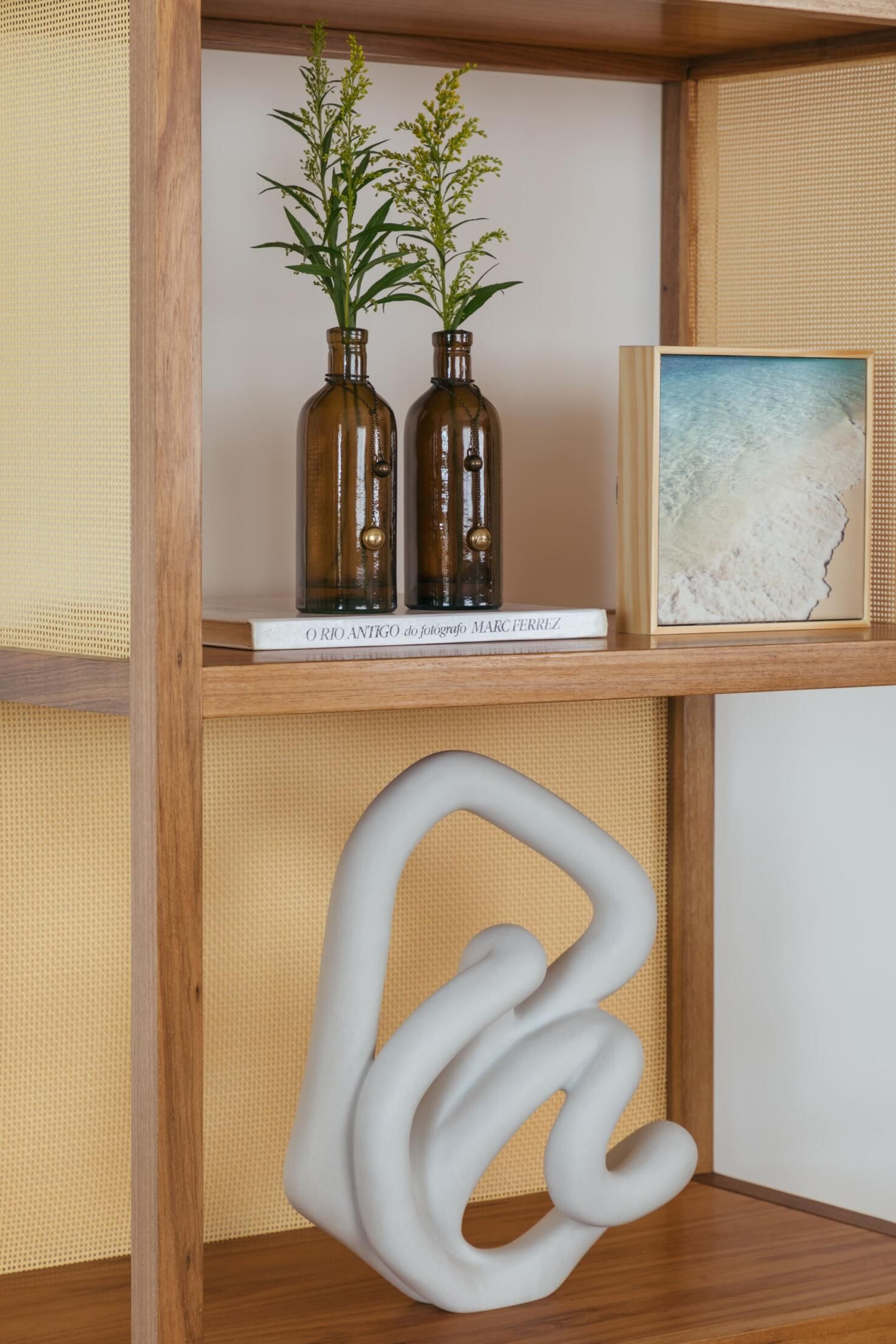 Na decoração, a arquiteta apostou em um mix de materiais leves, como a madeira clara, palha e metais brancos, para criar um equilíbrio entre essa mistura entre antigo e contemporâneo. A moradora optou por peças nacionais de decoração e objetos simples, mas com a personalidade do apartamento à beira mar.