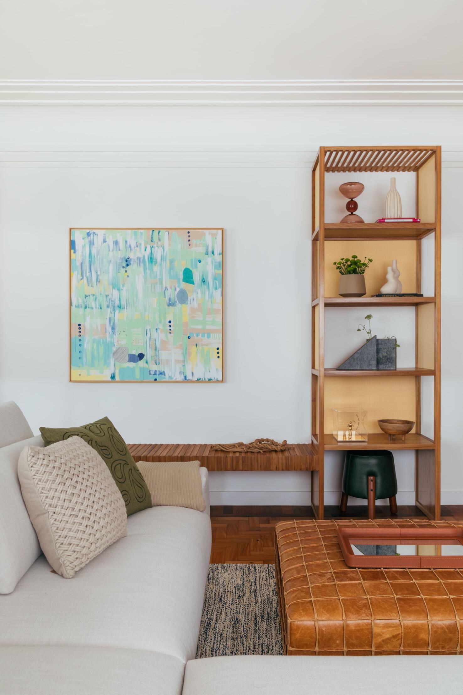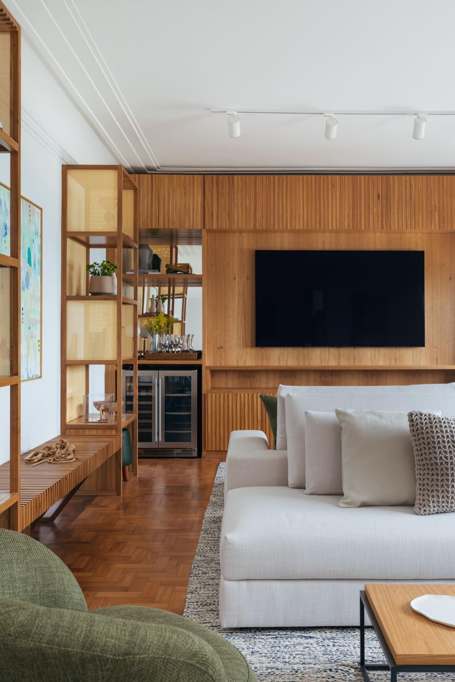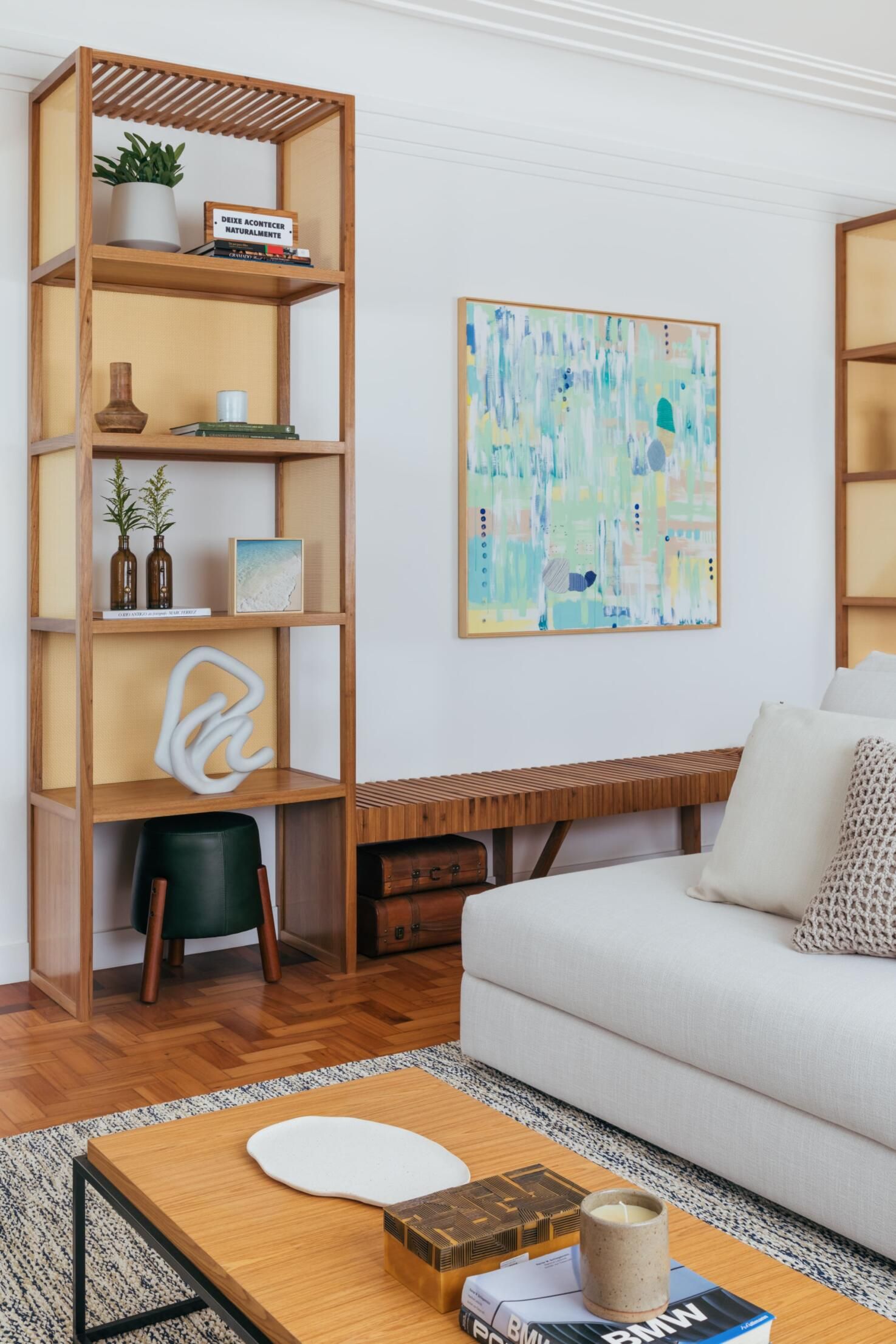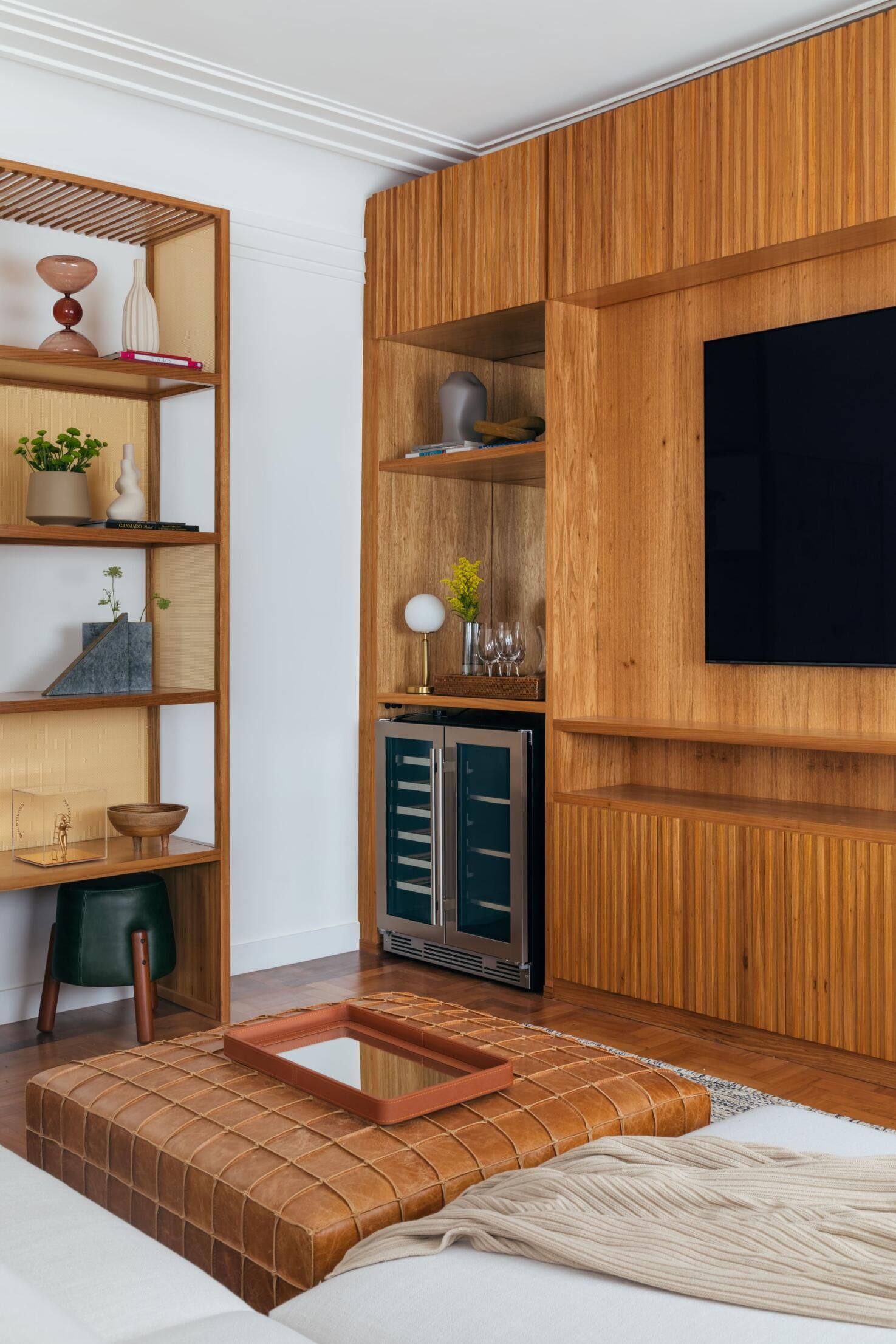 Vale também ressaltar a marcenaria como um grande diferencial do projeto. Ela marca presença no formato de lâmina natural de carvalho americano e detalhes em palha, e em vários móveis de autoria e desenho da própria arquiteta: o rack, a adega, a estante com banco que integra os ambientes de estar e TV, e o móvel de apoio da área gourmet.