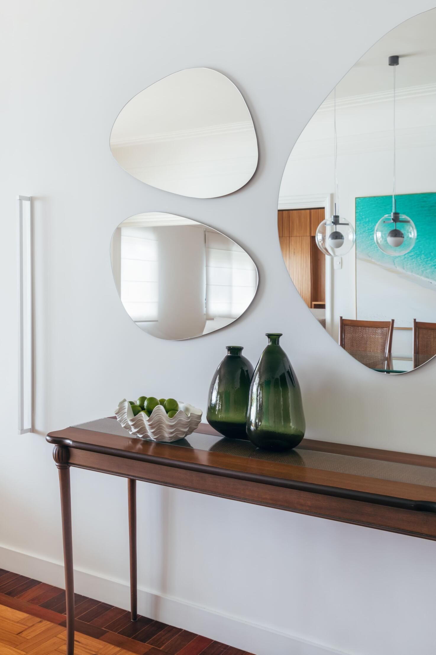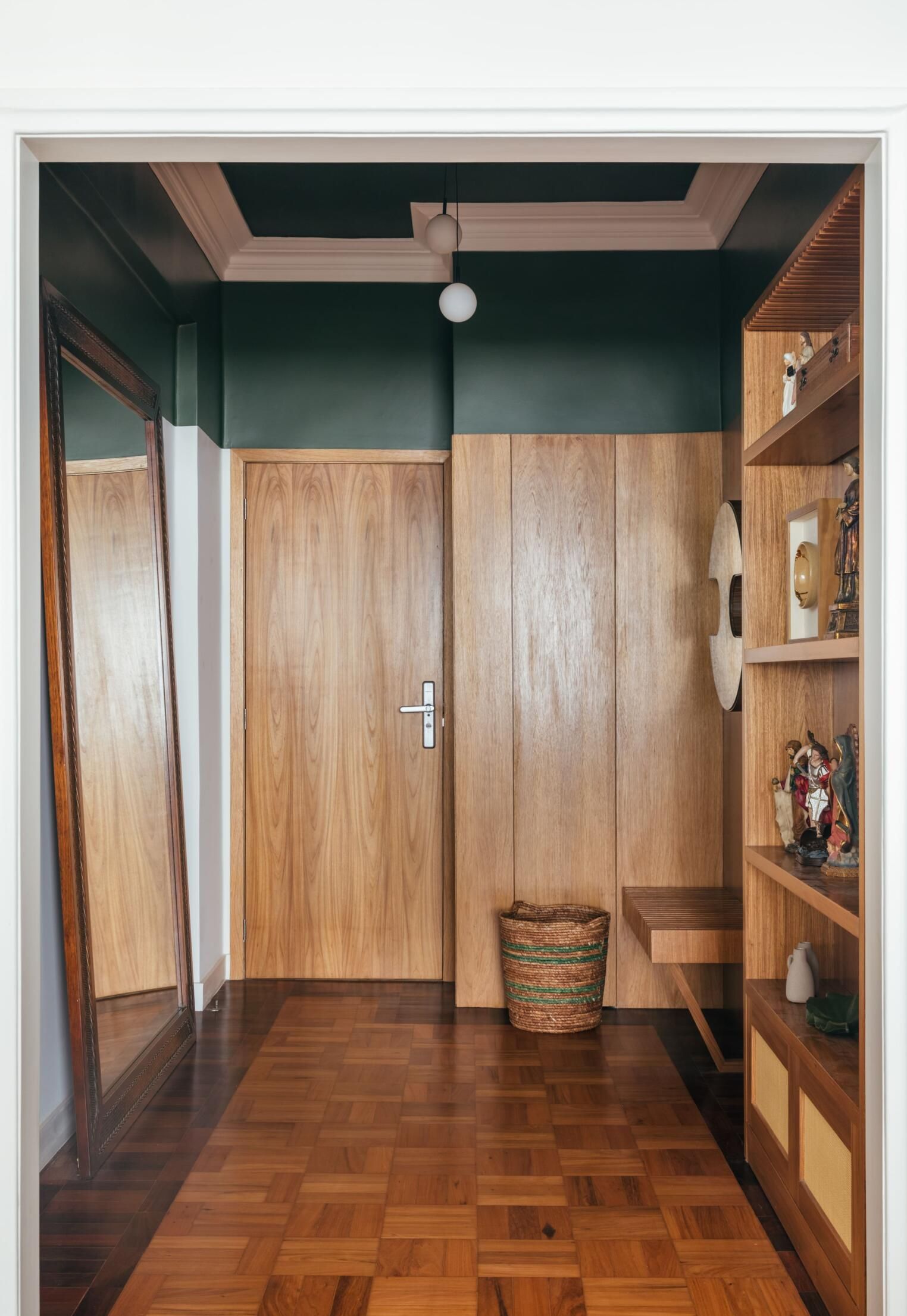 Na entrada do apartamento, criamos uma espécie de “hall de orações”. A família, super religiosa, queria expor os objetos, esculturas e imagens sacras de modo a criar um ambiente para orações e também de bênçãos para quem entra e sai.