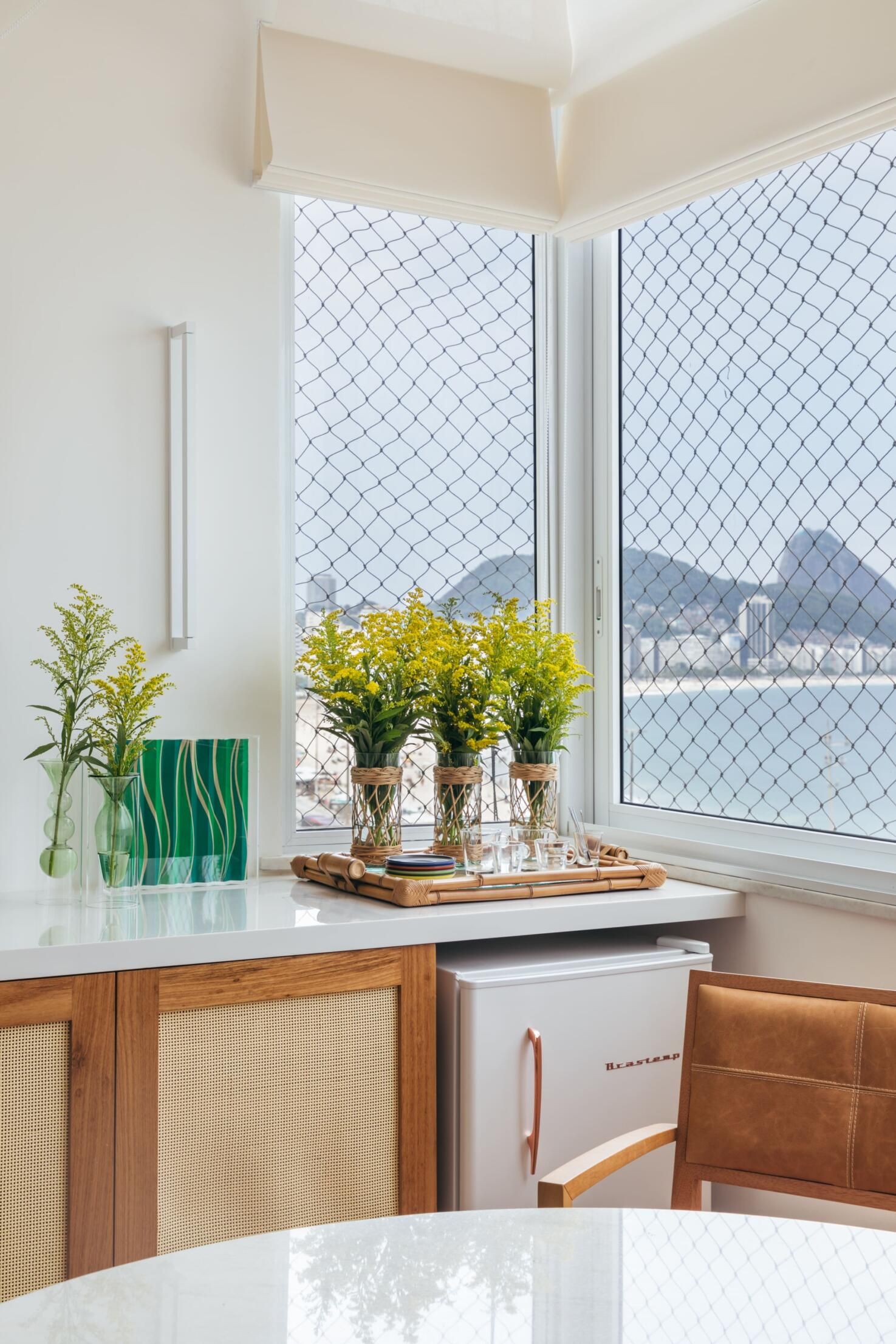 Uma mudança significativa que fizemos foi no espaço da varanda. Aproveitamos para valorizar esse ambiente onde a vista é linda e criamos um espaço com uma pequena mesa que vale tanto para a família tomar café apreciando o mar, quanto receber amigos para um vinho.