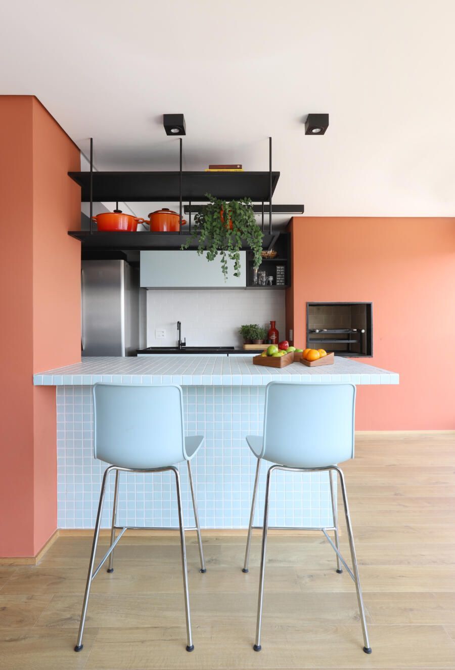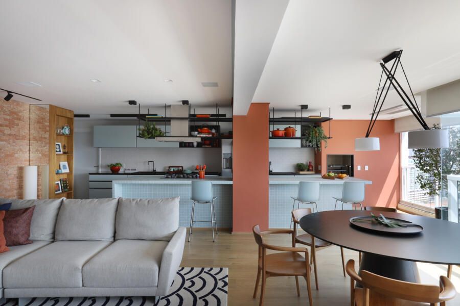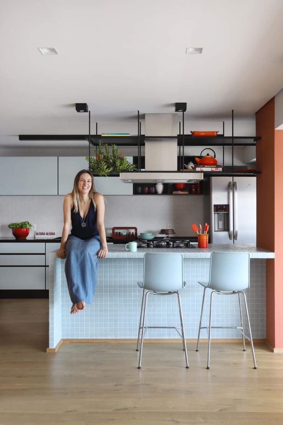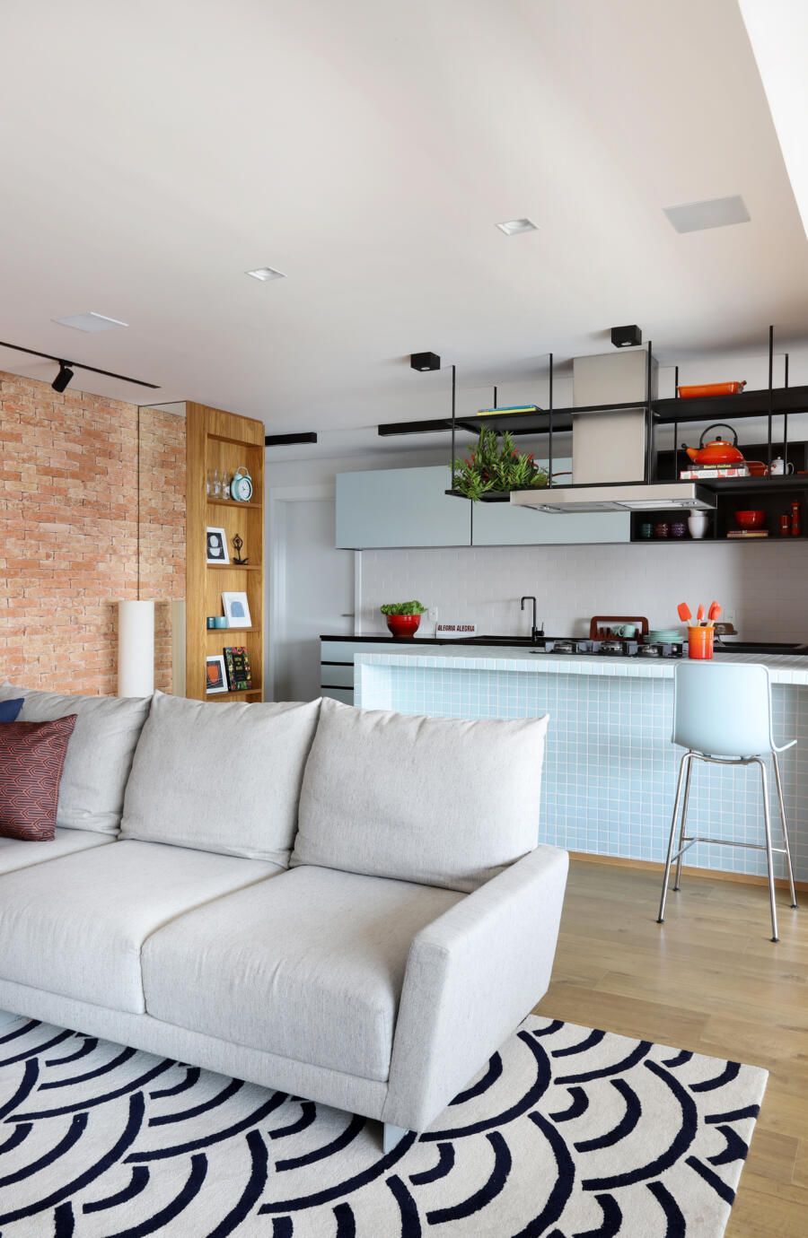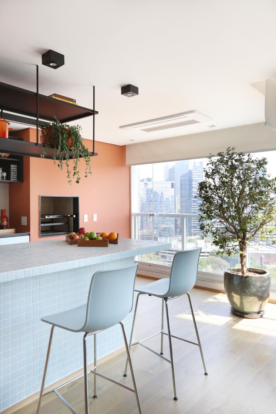 “Acredito que o grande diferencial foi abrir tudo e integrar sala, cozinha e terraço. Essa conexão foi feita através de um super balcão todo revestido com pastilha azul clara. Acredito que trazer essa união dos ambientes com apenas 1 elemento foi bem interessante.”